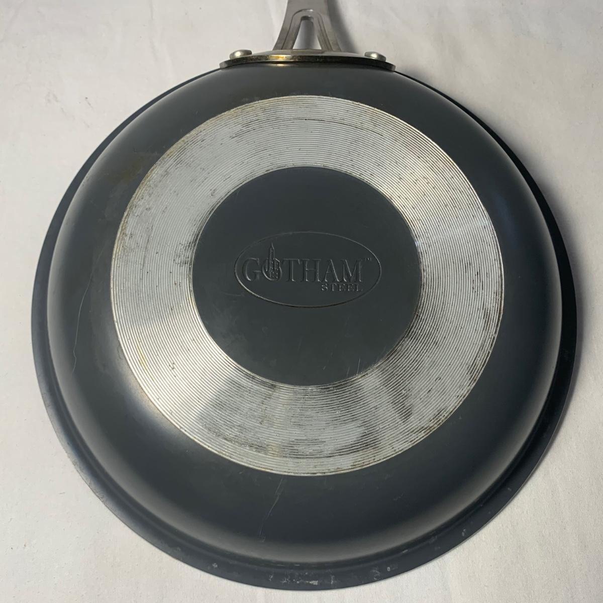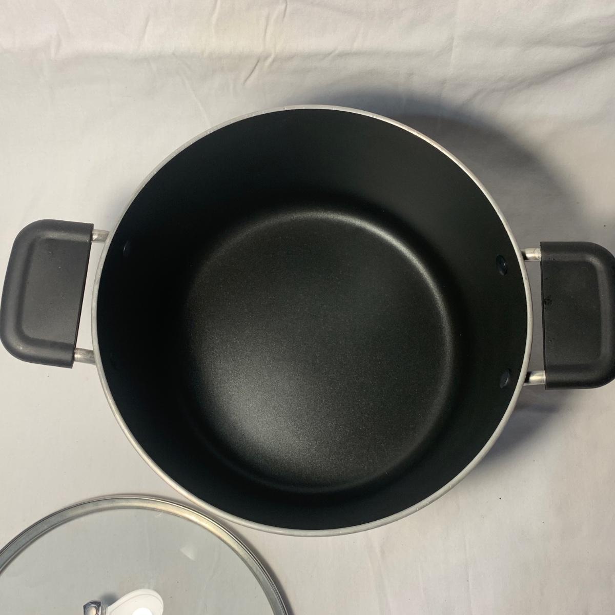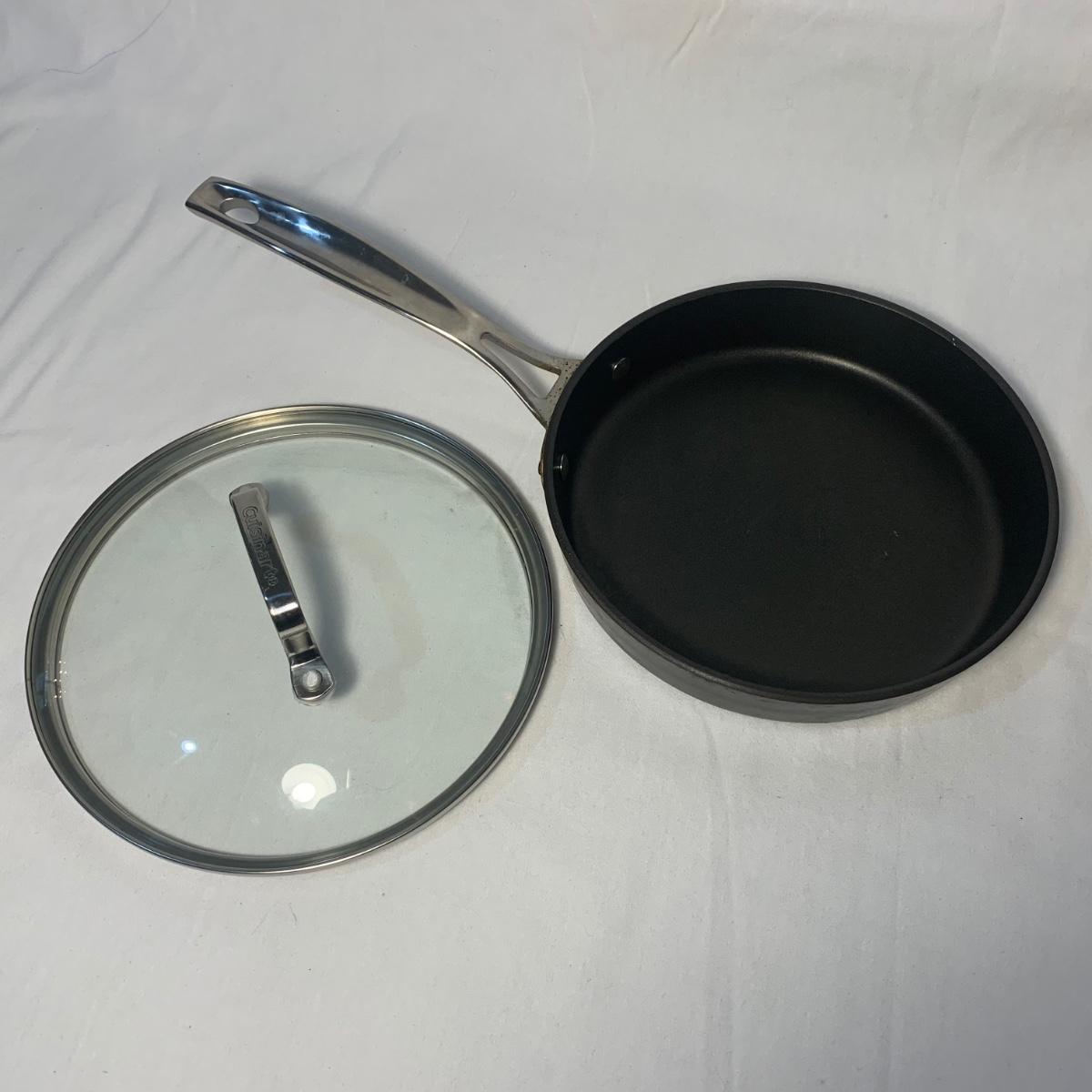 This lot includes three Titan Ware pots. One large soup pot with lid and two smaller lidded sauce pots. Lot also includes Cuisinart and Gotham Steel frying pans. Gotham Steel pan does not include a lid. All items are non-stick. See photos for more details.