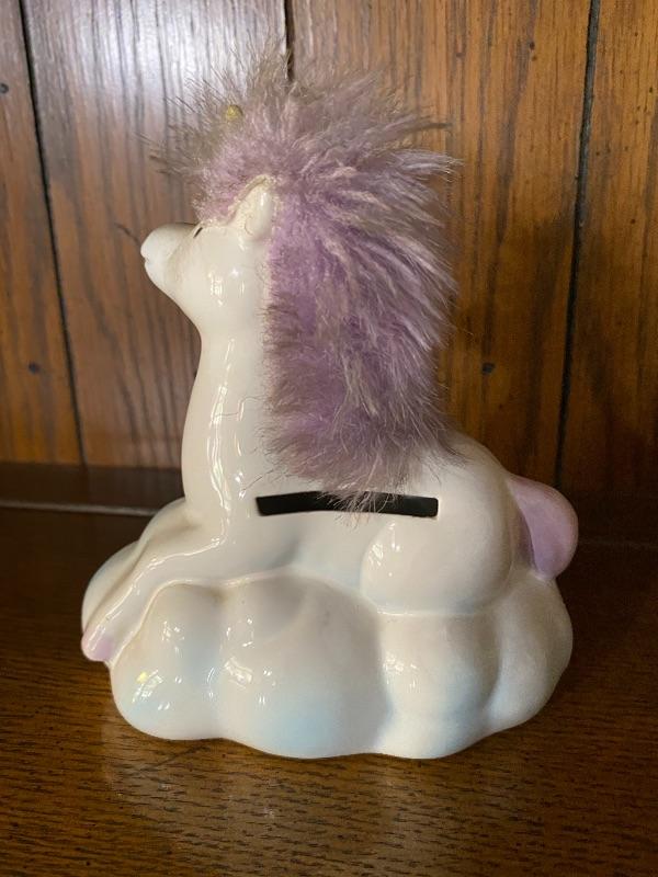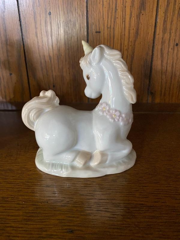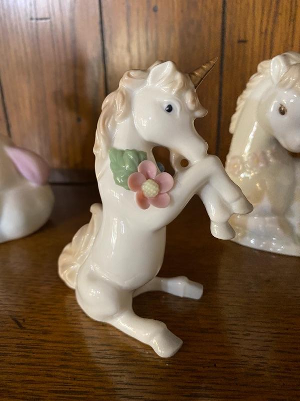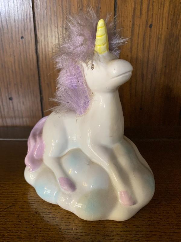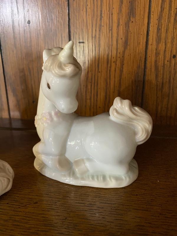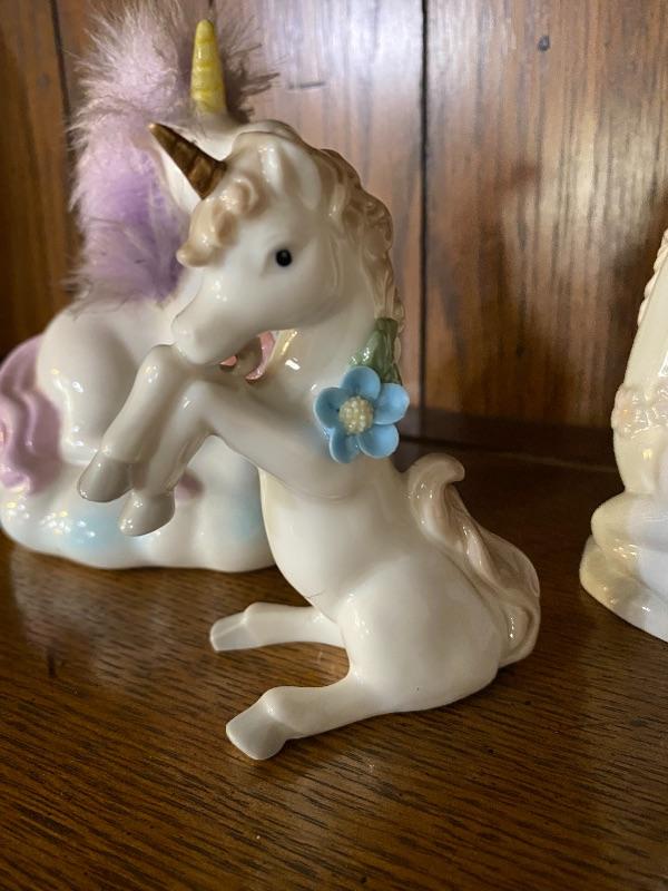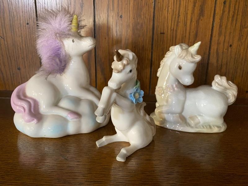 Three cute unicorn figurines. One is also a bank. Good condition except a little dust.