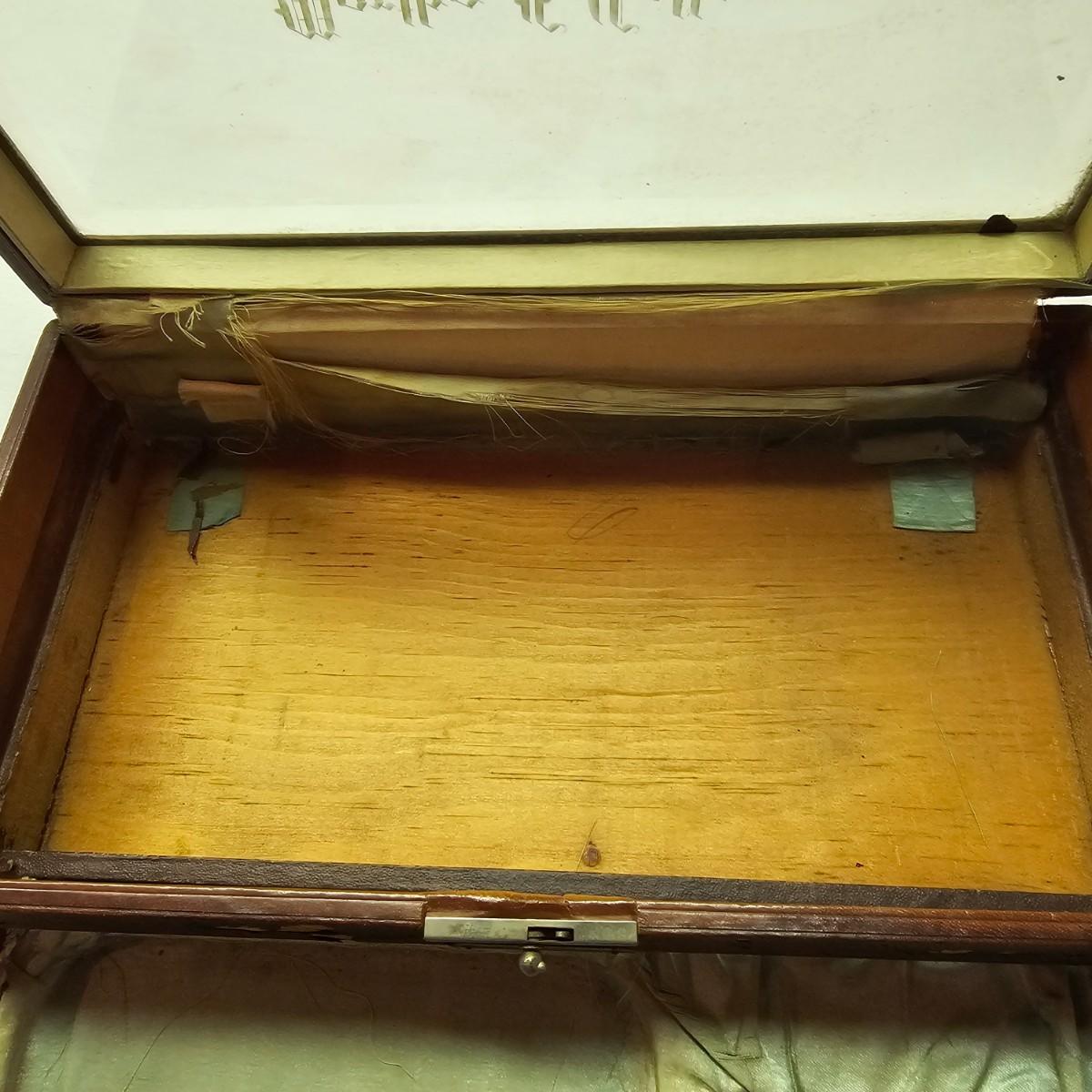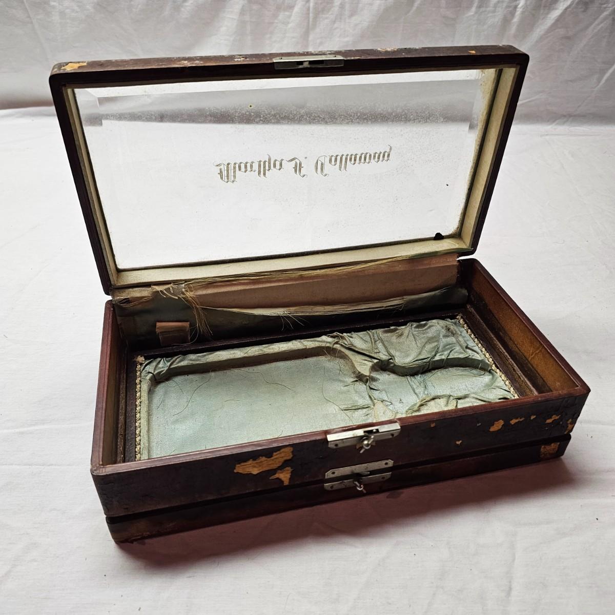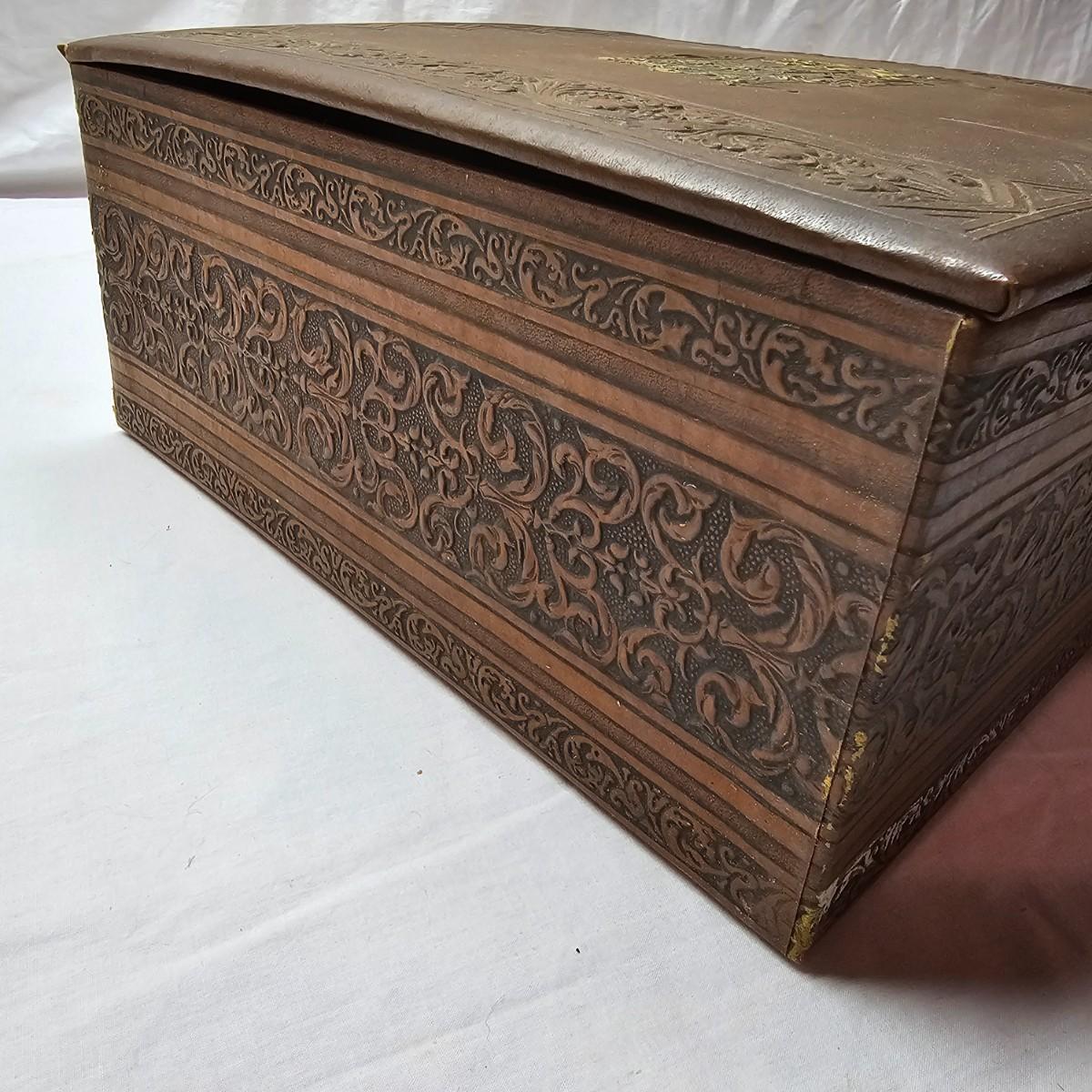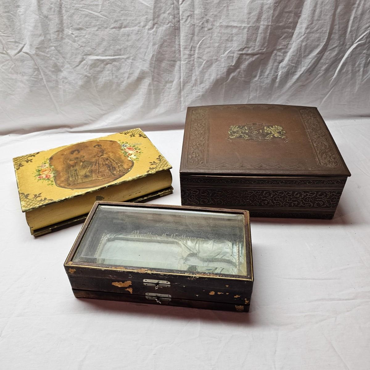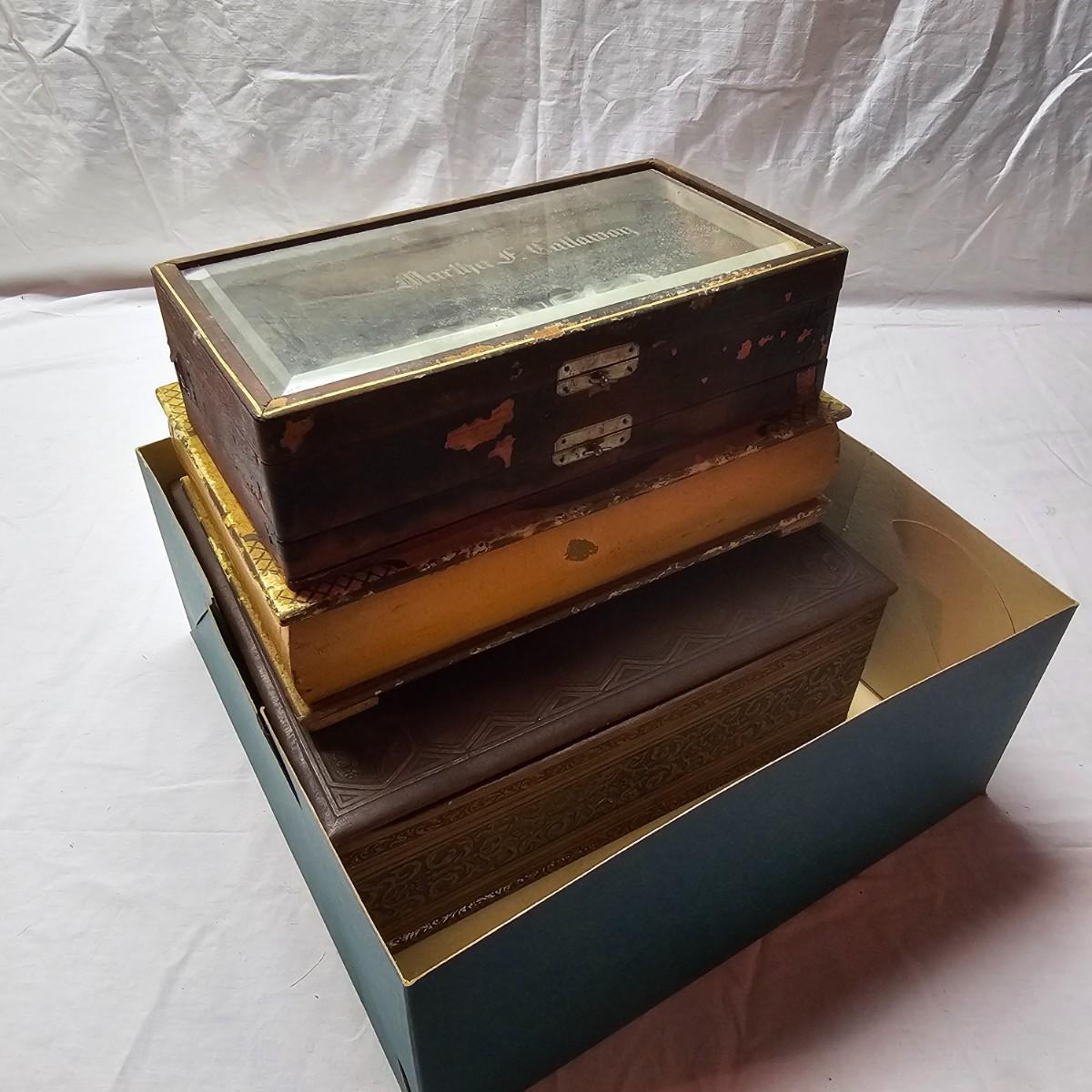 Three different sized vintage boxes. Large brown box has carved designs over hard paper, lid opens, measures 13.5" x 11.5" x 5.5"H. Back of lid is split. Yellowish wood box with picture on top is 13" x 9" x 3"H, has mirror on inside lid. Appears to be missing back feet. Glass top and covered wood box has name engraved in beveled top, also has pull-out drawer at bottom. Appears to have held a custom shaped object. Item is 12.25" x 6.5" x 3.5"H. Parts of outside covering are peeling. All three items have some discoloration and chipping. See photos for details. Shipping available.