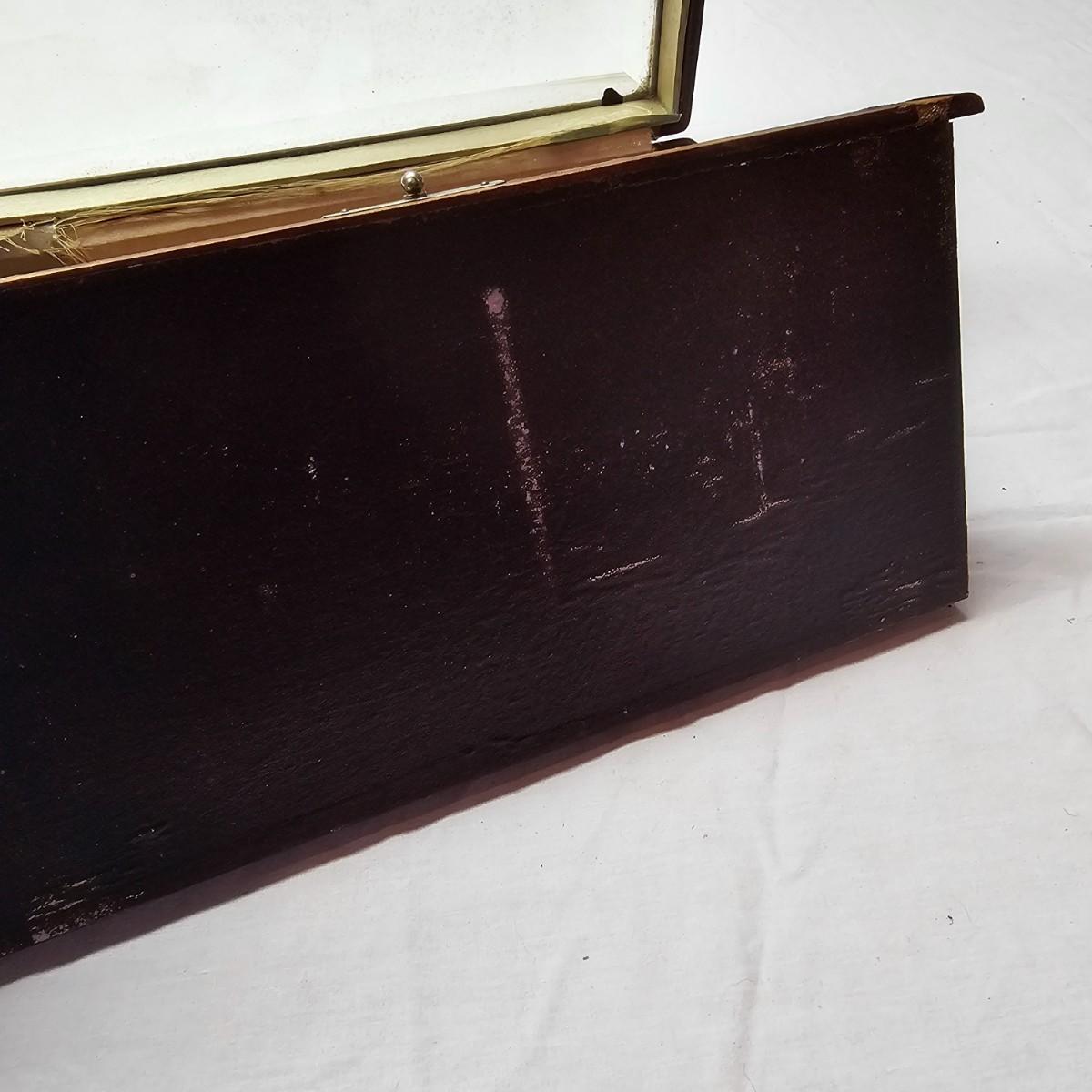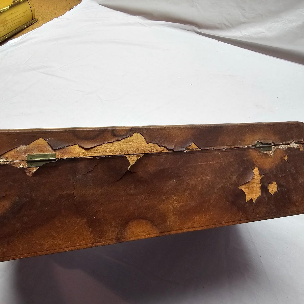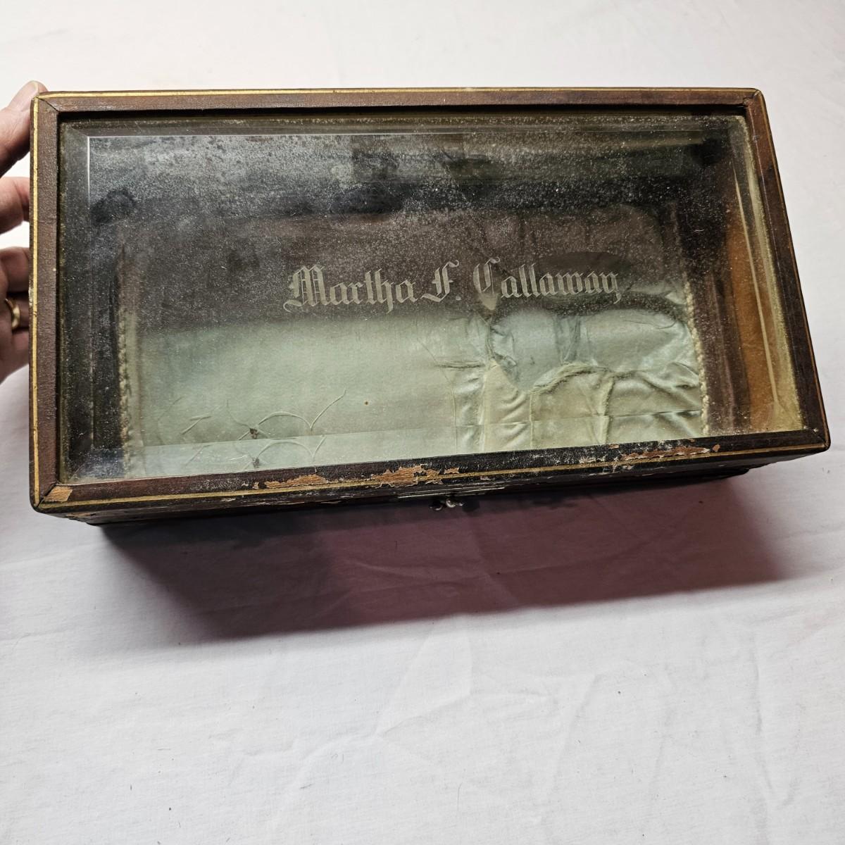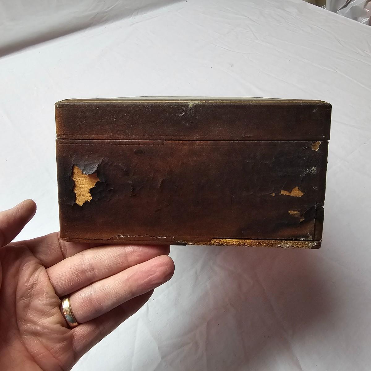 Three different sized vintage boxes. Large brown box has carved designs over hard paper, lid opens, measures 13.5" x 11.5" x 5.5"H. Back of lid is split. Yellowish wood box with picture on top is 13" x 9" x 3"H, has mirror on inside lid. Appears to be missing back feet. Glass top and covered wood box has name engraved in beveled top, also has pull-out drawer at bottom. Appears to have held a custom shaped object. Item is 12.25" x 6.5" x 3.5"H. Parts of outside covering are peeling. All three items have some discoloration and chipping. See photos for details. Shipping available.
