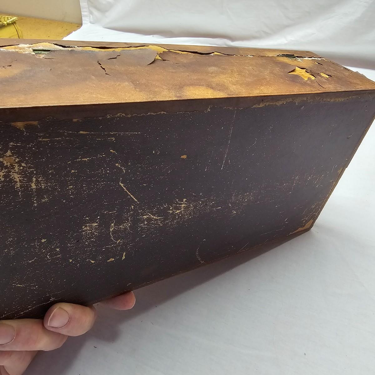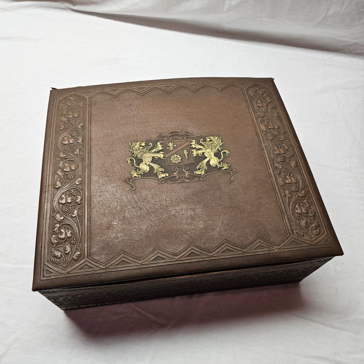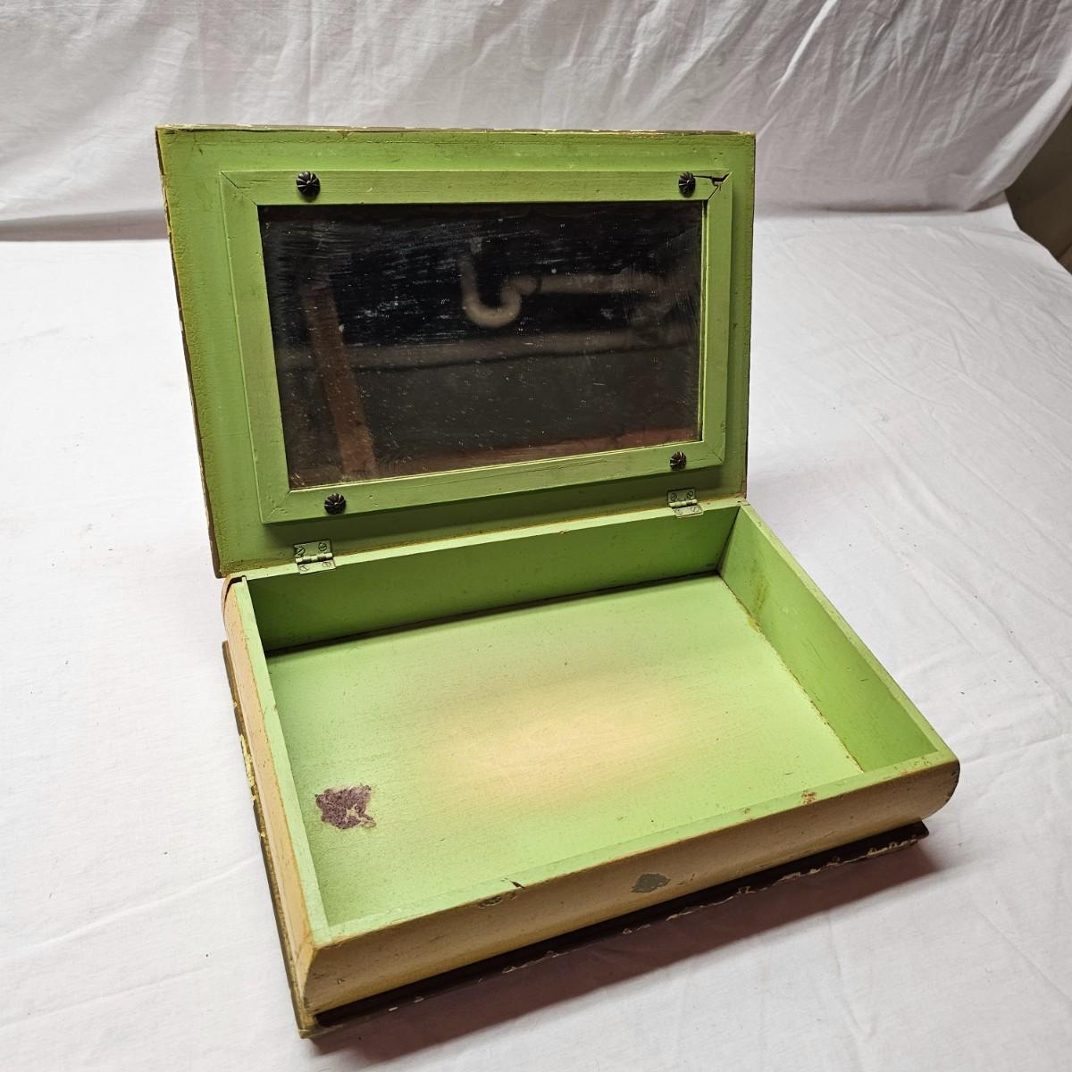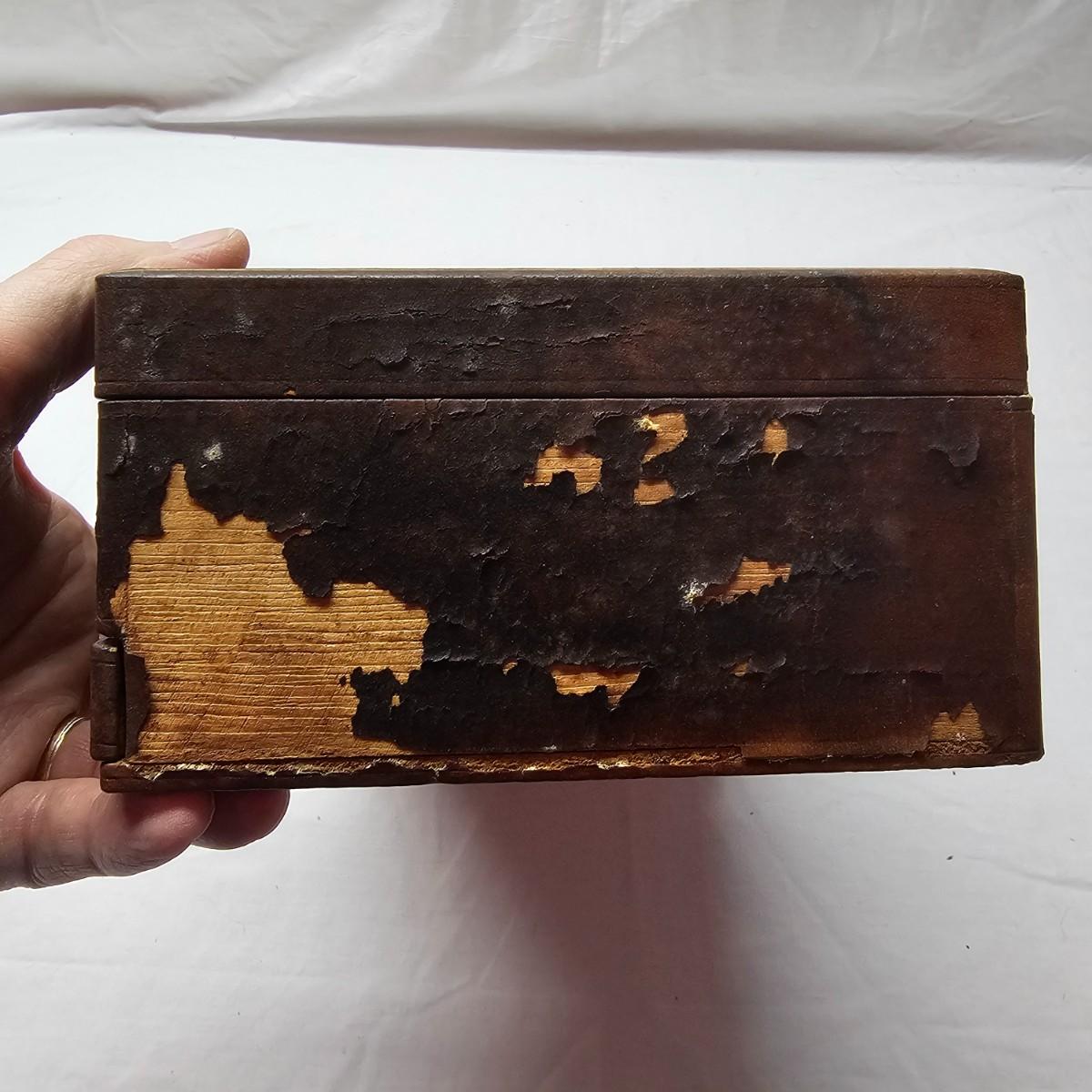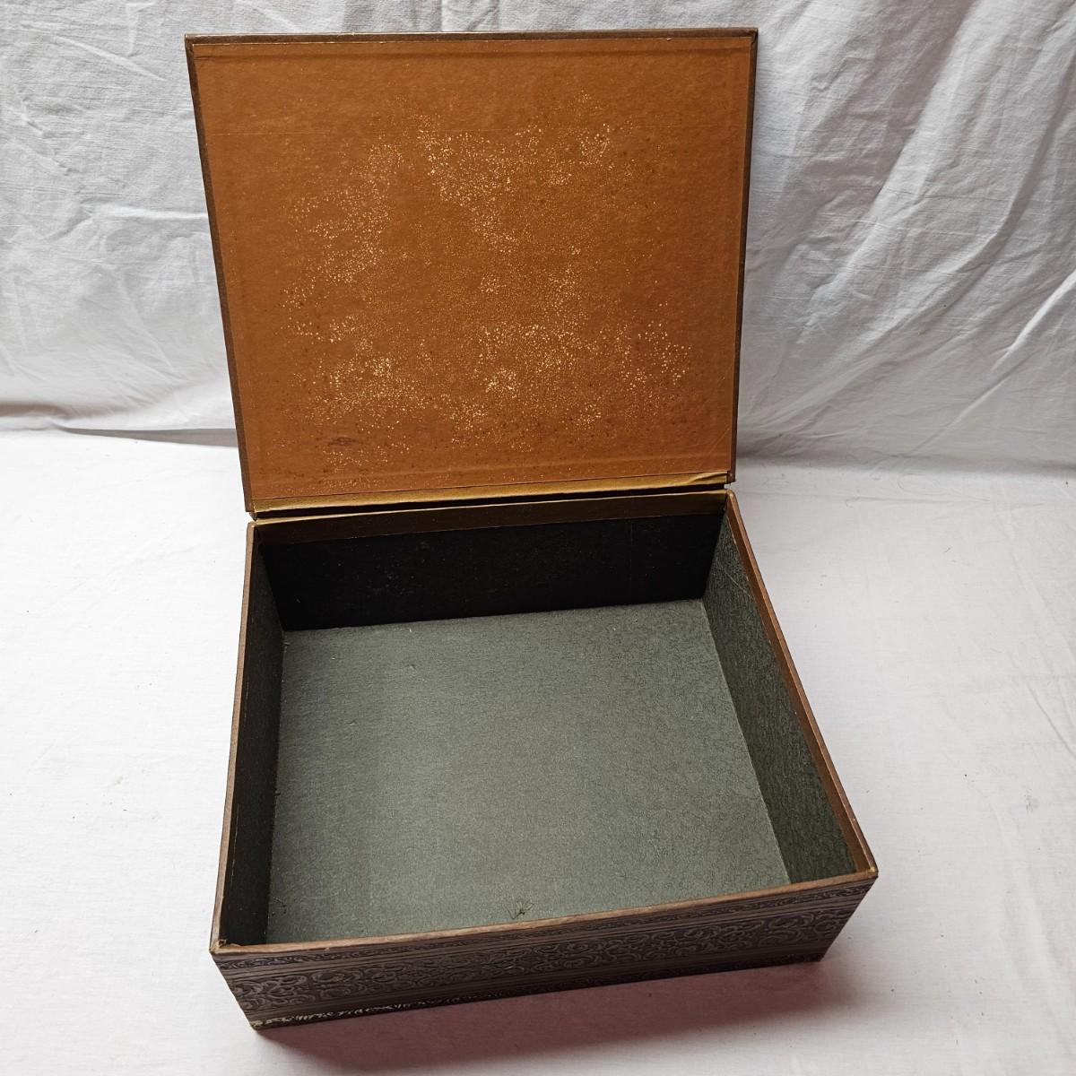 Three different sized vintage boxes. Large brown box has carved designs over hard paper, lid opens, measures 13.5" x 11.5" x 5.5"H. Back of lid is split. Yellowish wood box with picture on top is 13" x 9" x 3"H, has mirror on inside lid. Appears to be missing back feet. Glass top and covered wood box has name engraved in beveled top, also has pull-out drawer at bottom. Appears to have held a custom shaped object. Item is 12.25" x 6.5" x 3.5"H. Parts of outside covering are peeling. All three items have some discoloration and chipping. See photos for details. Shipping available.
