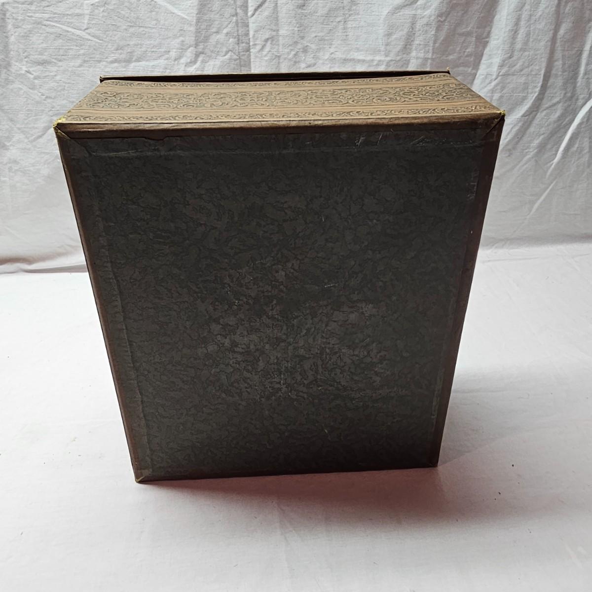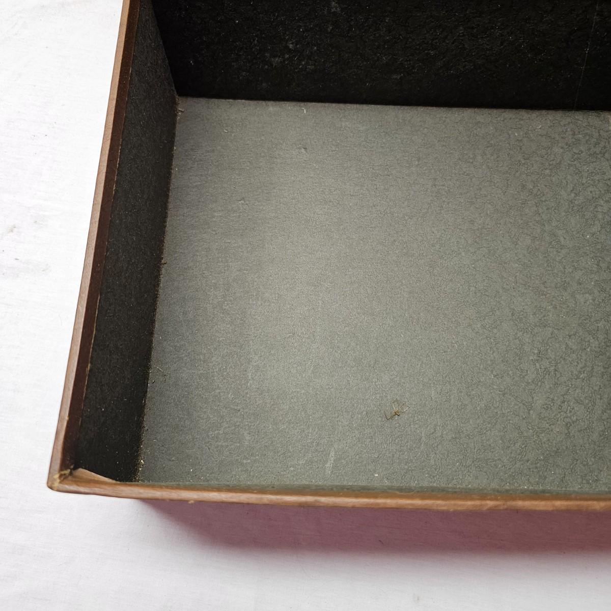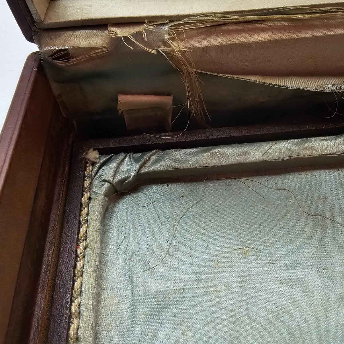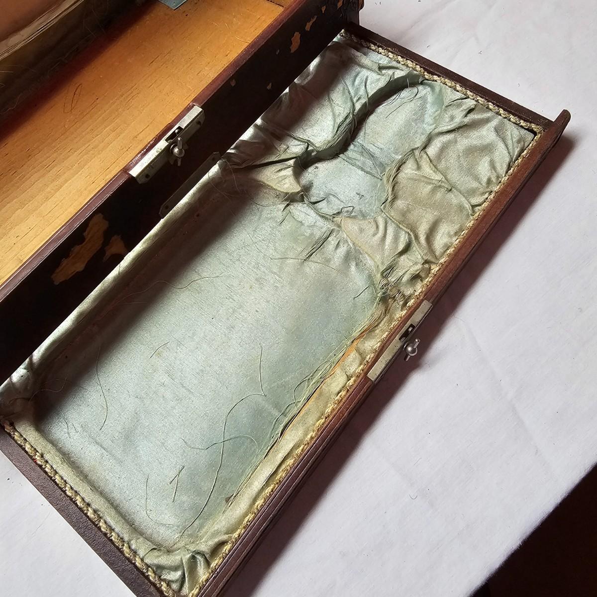Three different sized vintage boxes. Large brown box has carved designs over hard paper, lid opens, measures 13.5" x 11.5" x 5.5"H. Back of lid is split. Yellowish wood box with picture on top is 13" x 9" x 3"H, has mirror on inside lid. Appears to be missing back feet. Glass top and covered wood box has name engraved in beveled top, also has pull-out drawer at bottom. Appears to have held a custom shaped object. Item is 12.25" x 6.5" x 3.5"H. Parts of outside covering are peeling. All three items have some discoloration and chipping. See photos for details. Shipping available.