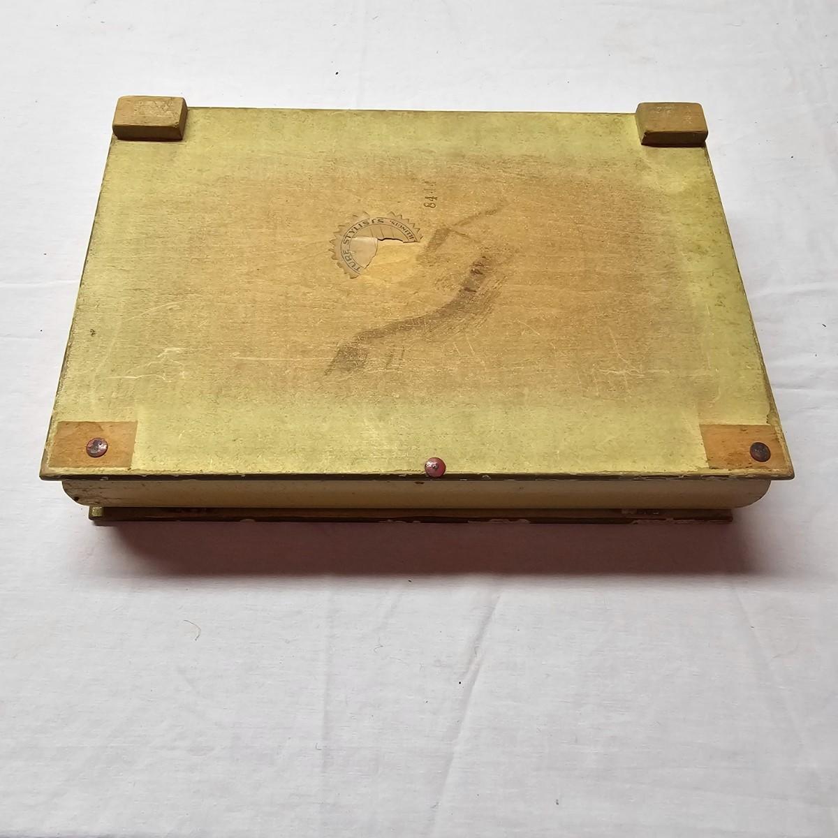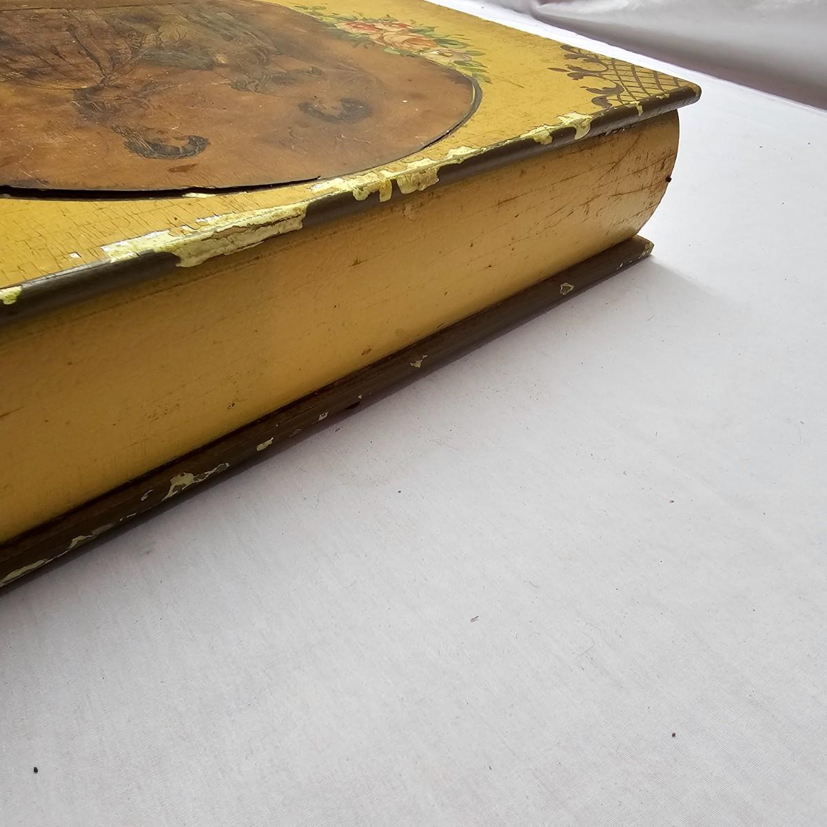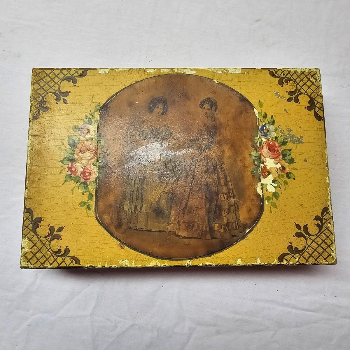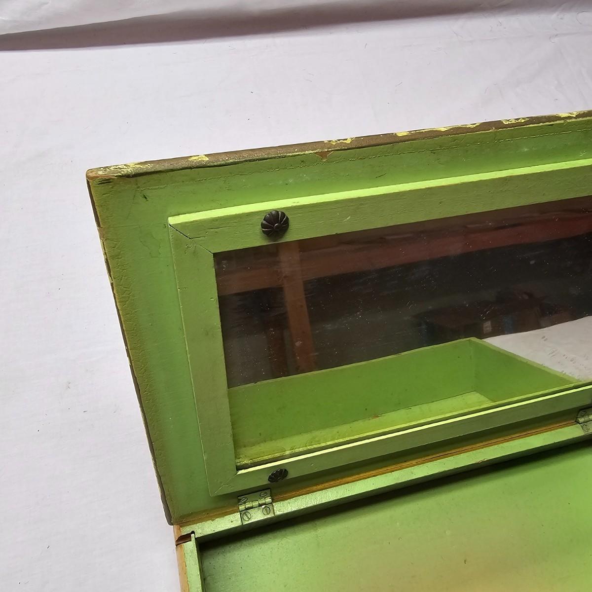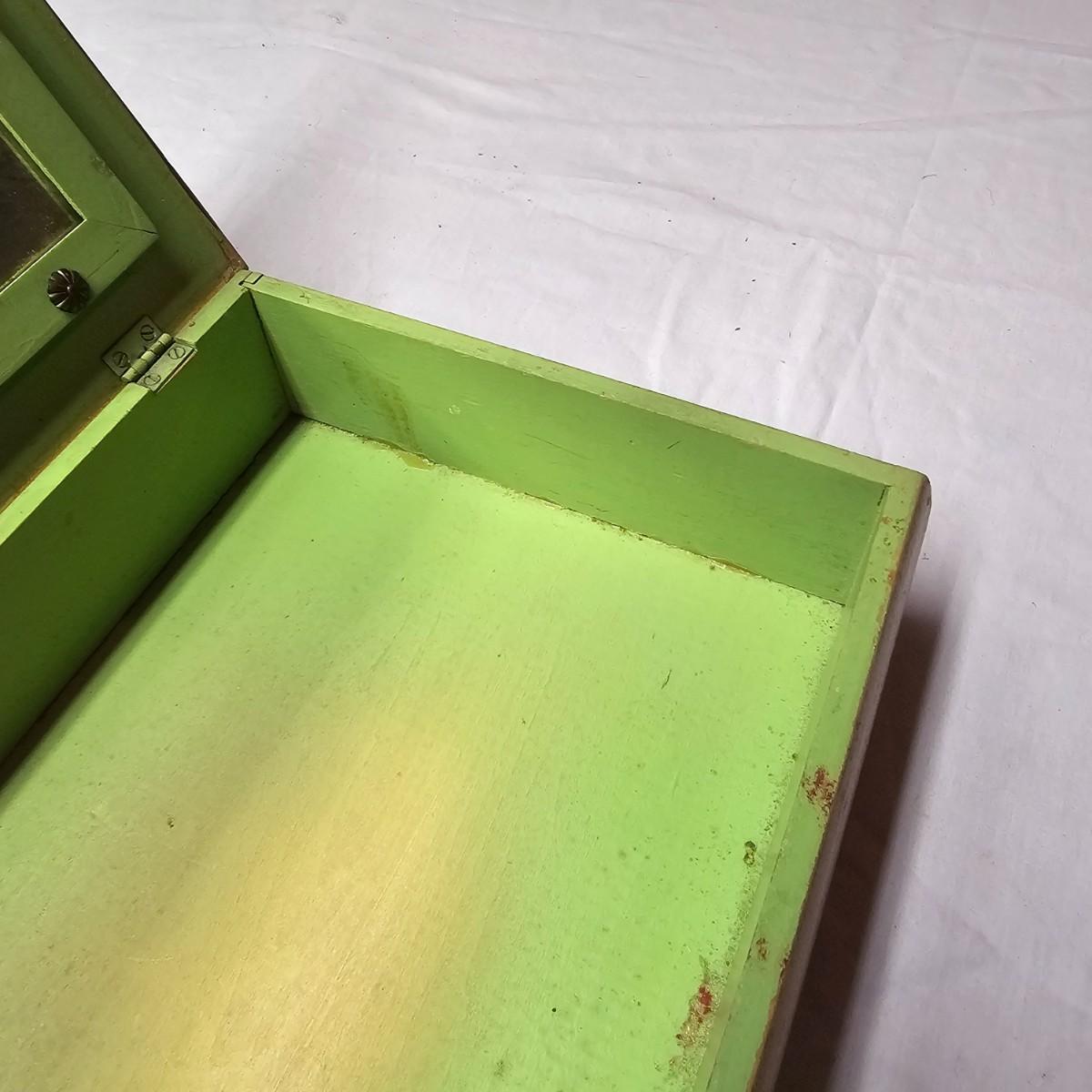 Three different sized vintage boxes. Large brown box has carved designs over hard paper, lid opens, measures 13.5" x 11.5" x 5.5"H. Back of lid is split. Yellowish wood box with picture on top is 13" x 9" x 3"H, has mirror on inside lid. Appears to be missing back feet. Glass top and covered wood box has name engraved in beveled top, also has pull-out drawer at bottom. Appears to have held a custom shaped object. Item is 12.25" x 6.5" x 3.5"H. Parts of outside covering are peeling. All three items have some discoloration and chipping. See photos for details. Shipping available.