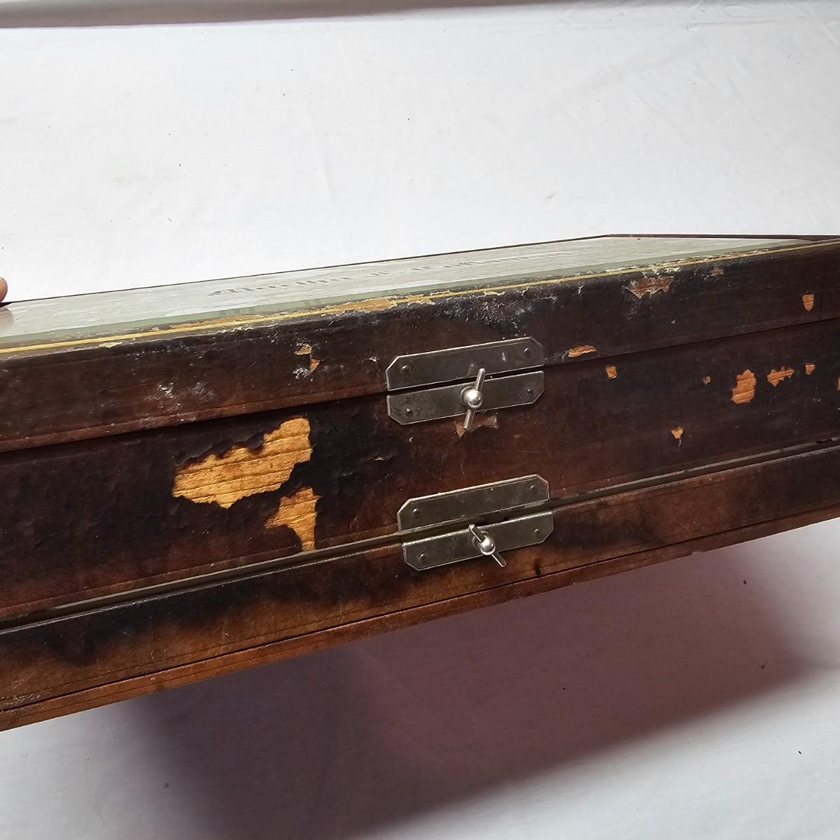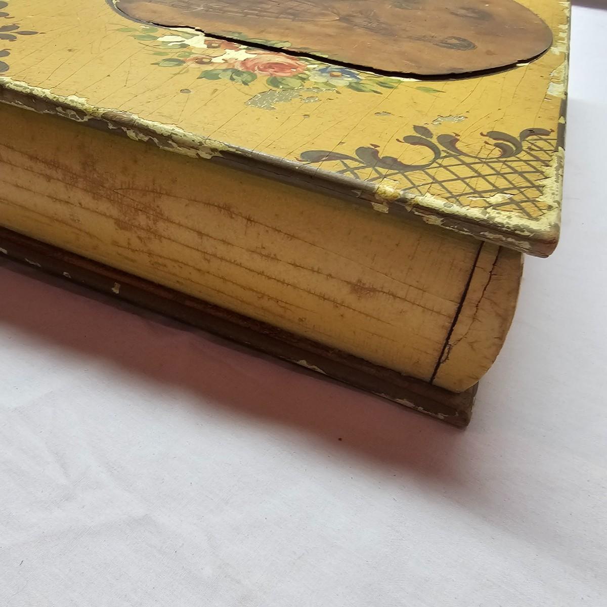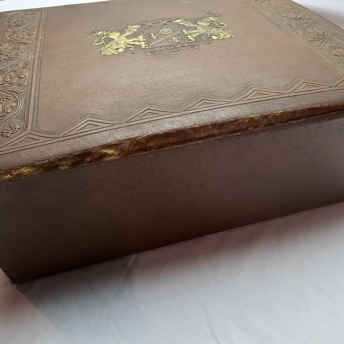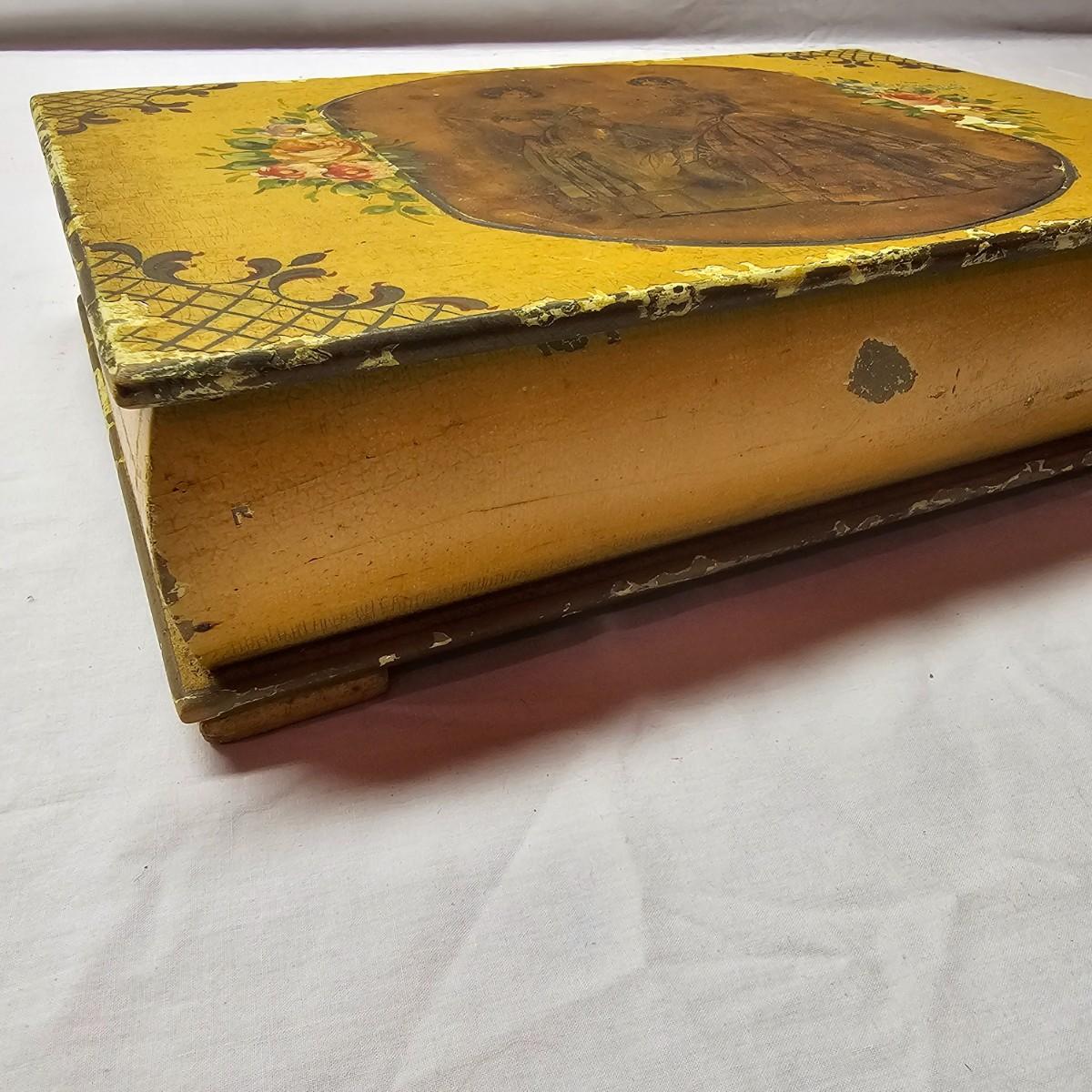 Three different sized vintage boxes. Large brown box has carved designs over hard paper, lid opens, measures 13.5" x 11.5" x 5.5"H. Back of lid is split. Yellowish wood box with picture on top is 13" x 9" x 3"H, has mirror on inside lid. Appears to be missing back feet. Glass top and covered wood box has name engraved in beveled top, also has pull-out drawer at bottom. Appears to have held a custom shaped object. Item is 12.25" x 6.5" x 3.5"H. Parts of outside covering are peeling. All three items have some discoloration and chipping. See photos for details. Shipping available.