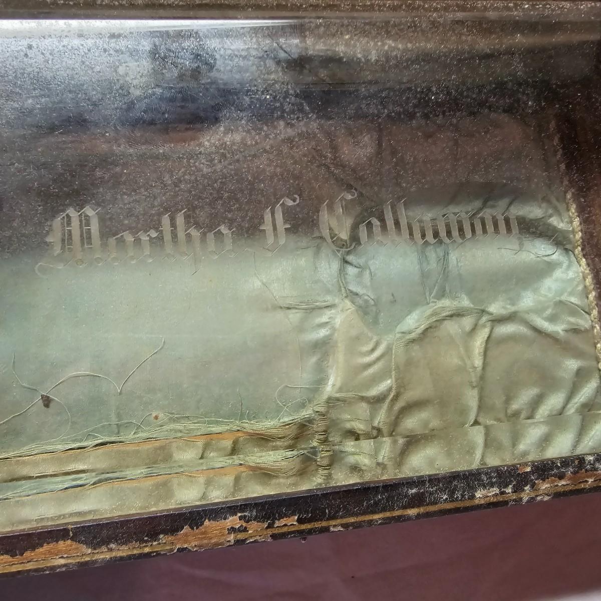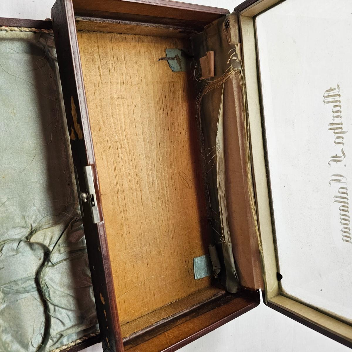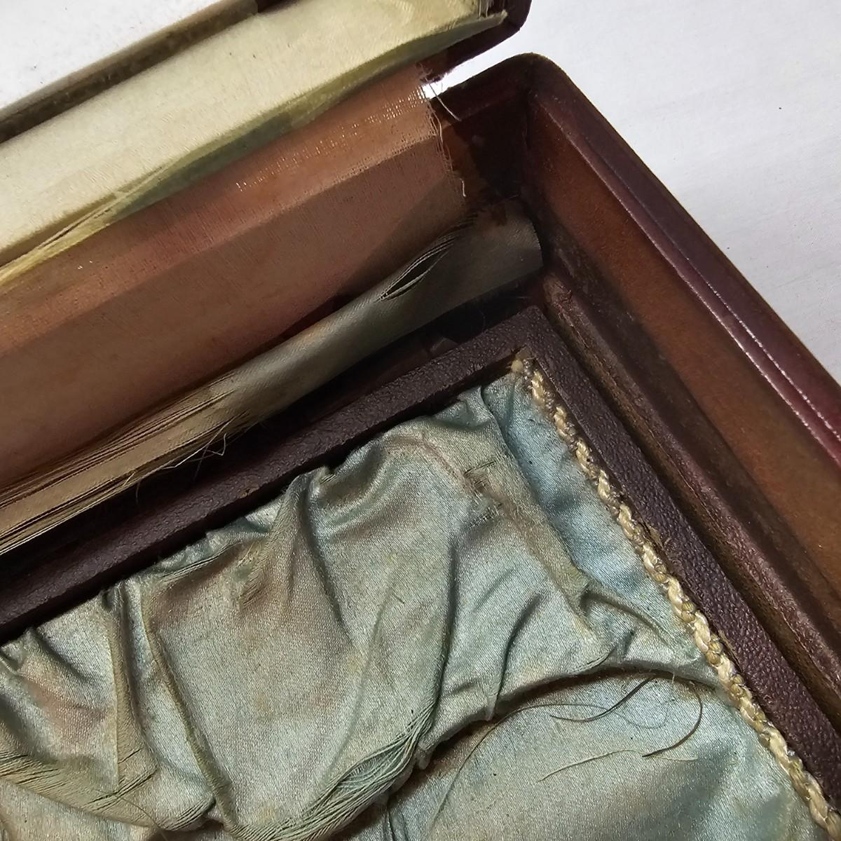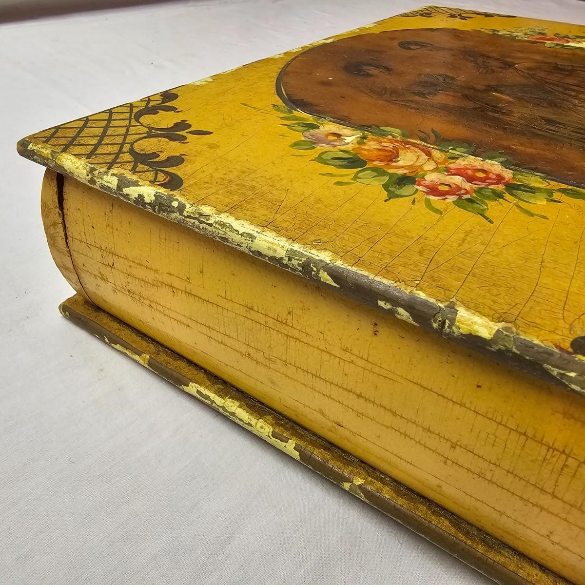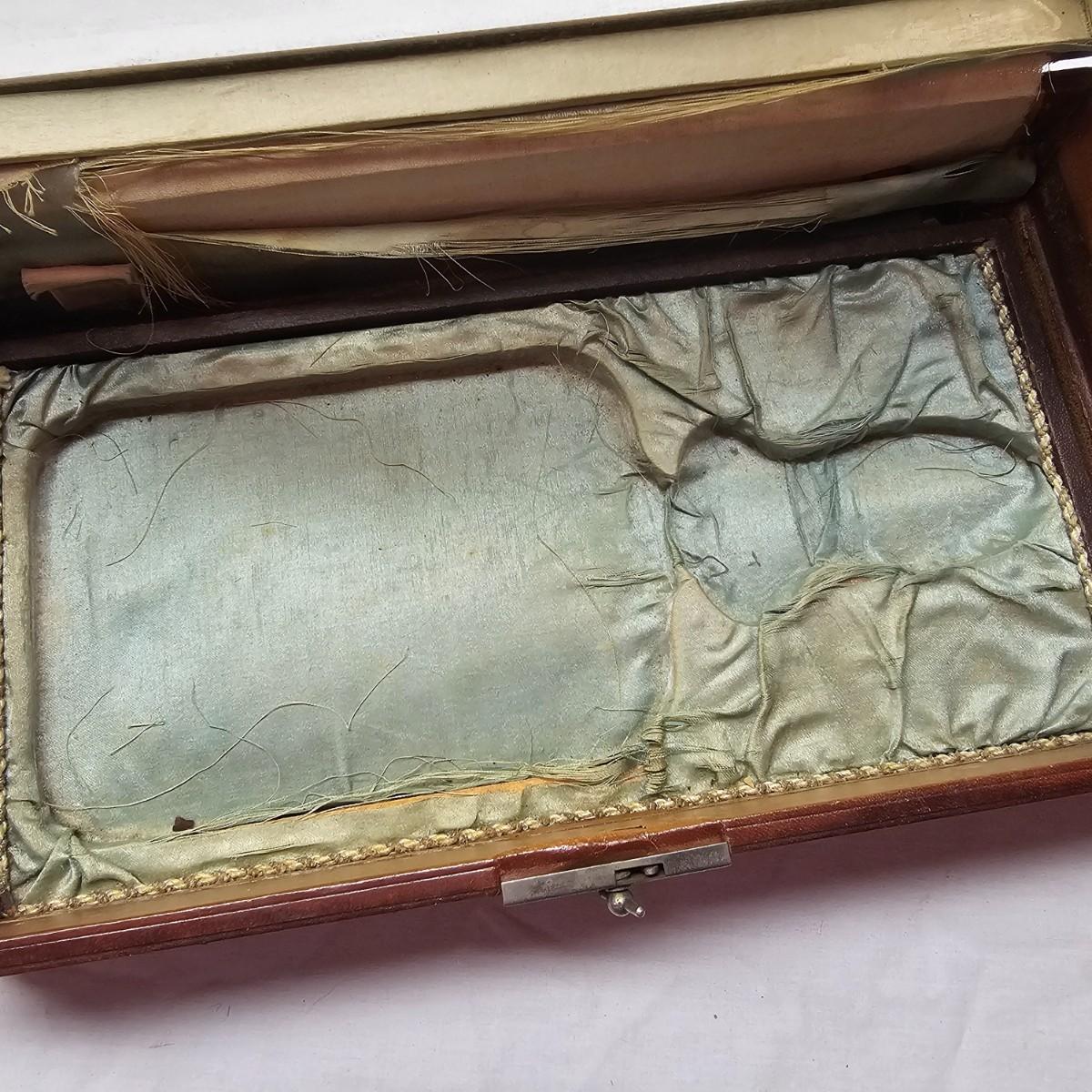Three different sized vintage boxes. Large brown box has carved designs over hard paper, lid opens, measures 13.5" x 11.5" x 5.5"H. Back of lid is split. Yellowish wood box with picture on top is 13" x 9" x 3"H, has mirror on inside lid. Appears to be missing back feet. Glass top and covered wood box has name engraved in beveled top, also has pull-out drawer at bottom. Appears to have held a custom shaped object. Item is 12.25" x 6.5" x 3.5"H. Parts of outside covering are peeling. All three items have some discoloration and chipping. See photos for details. Shipping available.