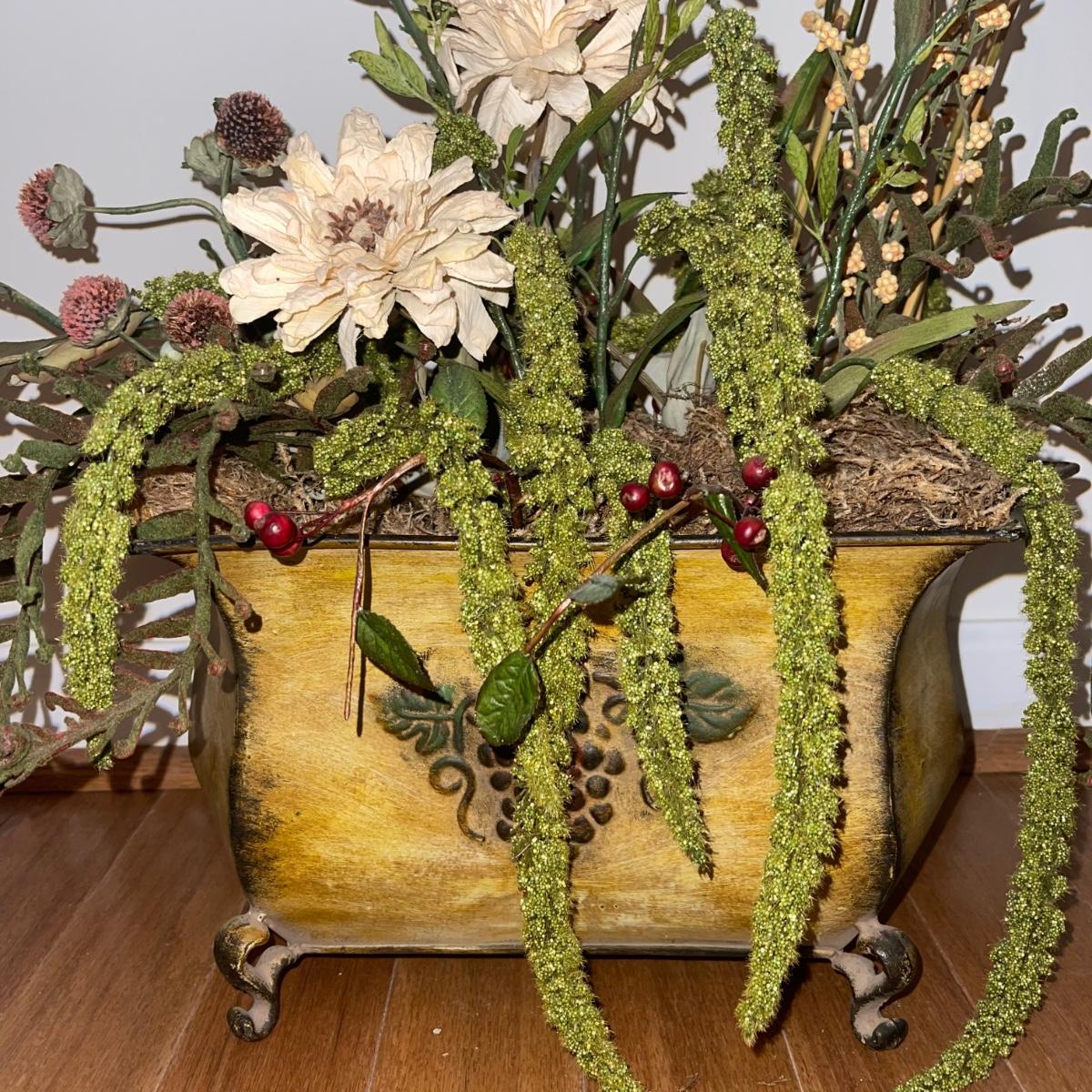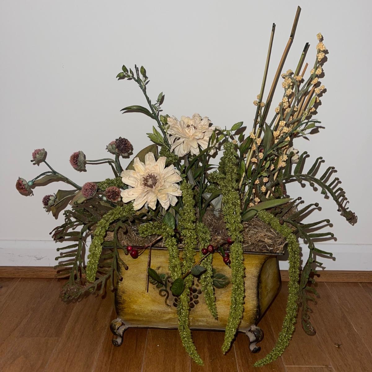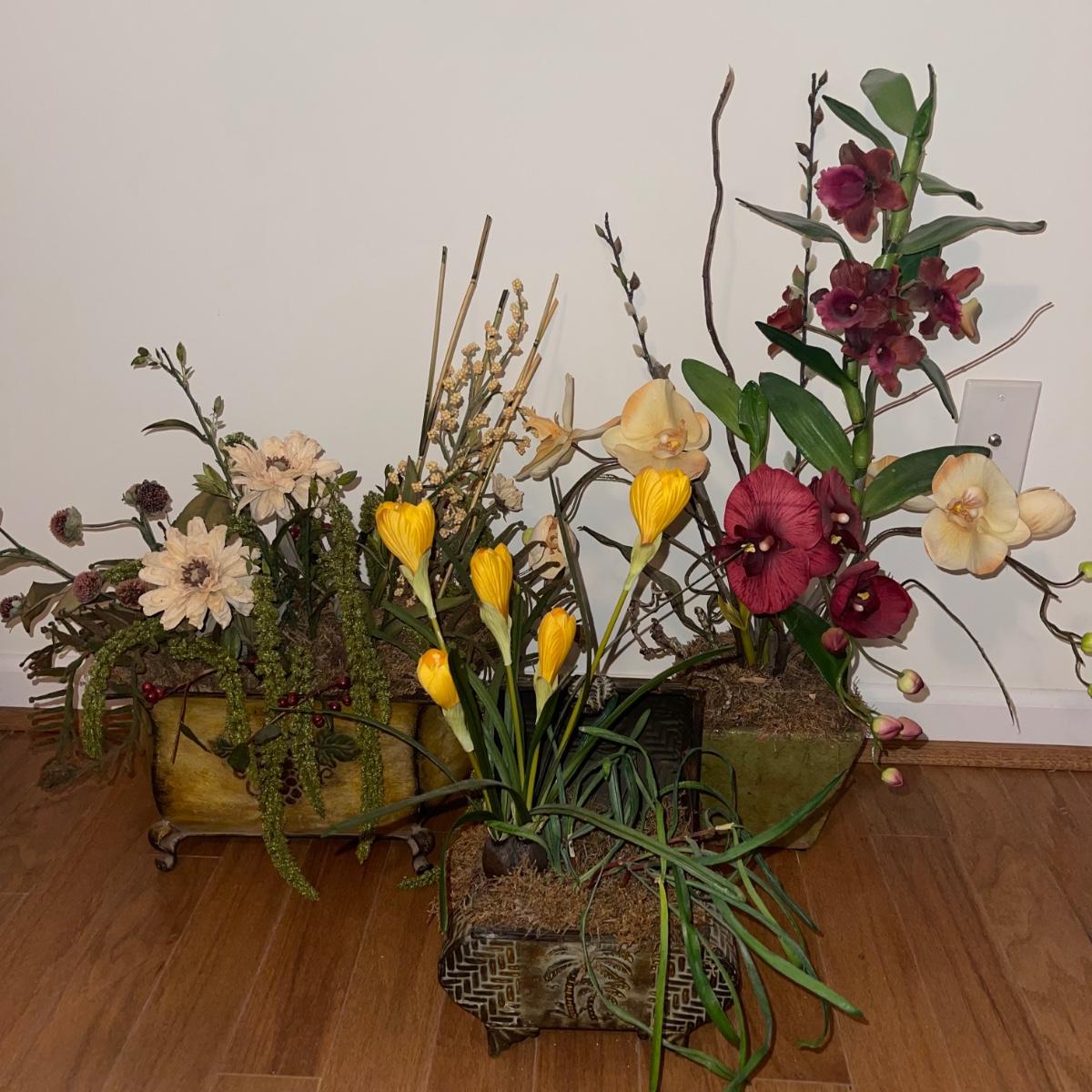 Three unique faux floral arrangements in different pots. There is a smaller square ceramic pot with orchids, a wide metal clawfoot tub-style pot with wildflowers, and a metal lidded chest with tulips. The wildflower pot is about 16” from side to side and the orchids are just under 27” tall.