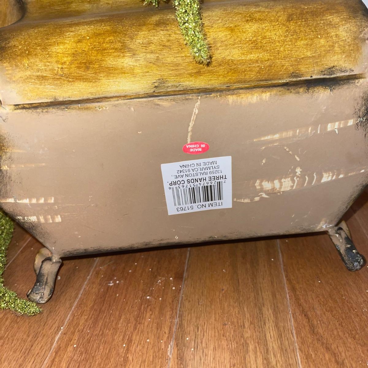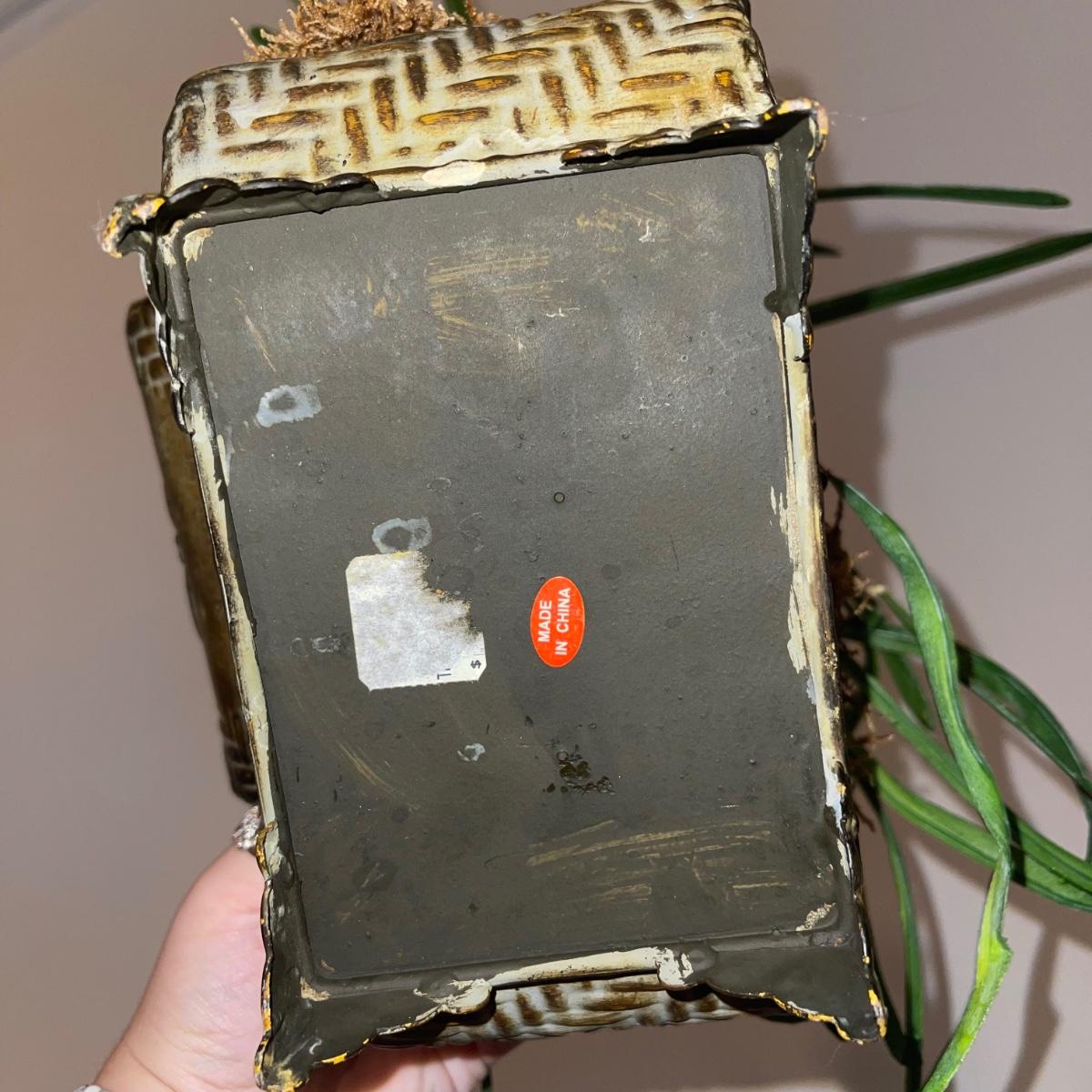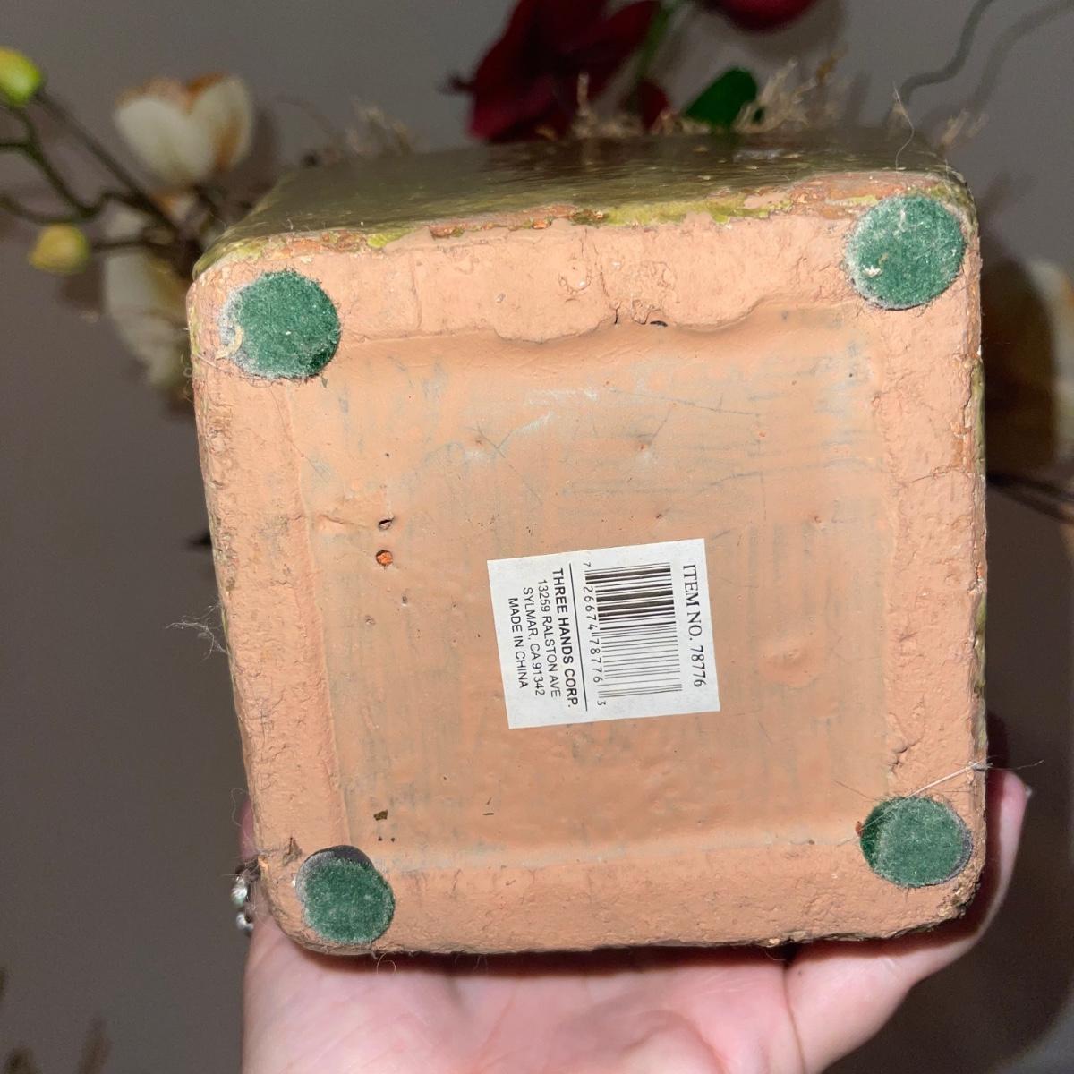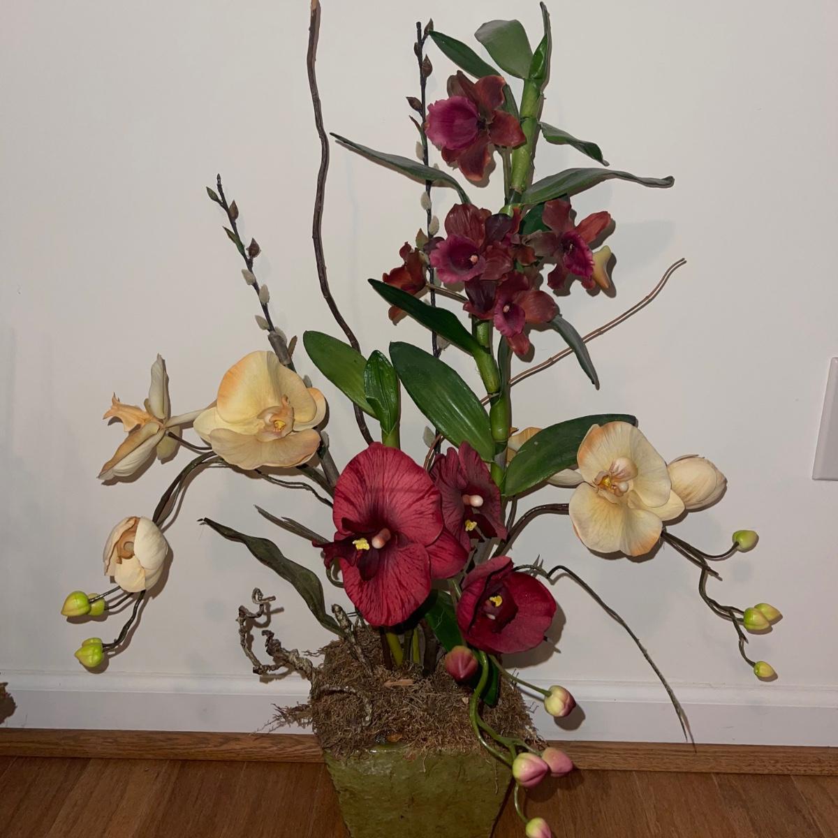 Three unique faux floral arrangements in different pots. There is a smaller square ceramic pot with orchids, a wide metal clawfoot tub-style pot with wildflowers, and a metal lidded chest with tulips. The wildflower pot is about 16” from side to side and the orchids are just under 27” tall.