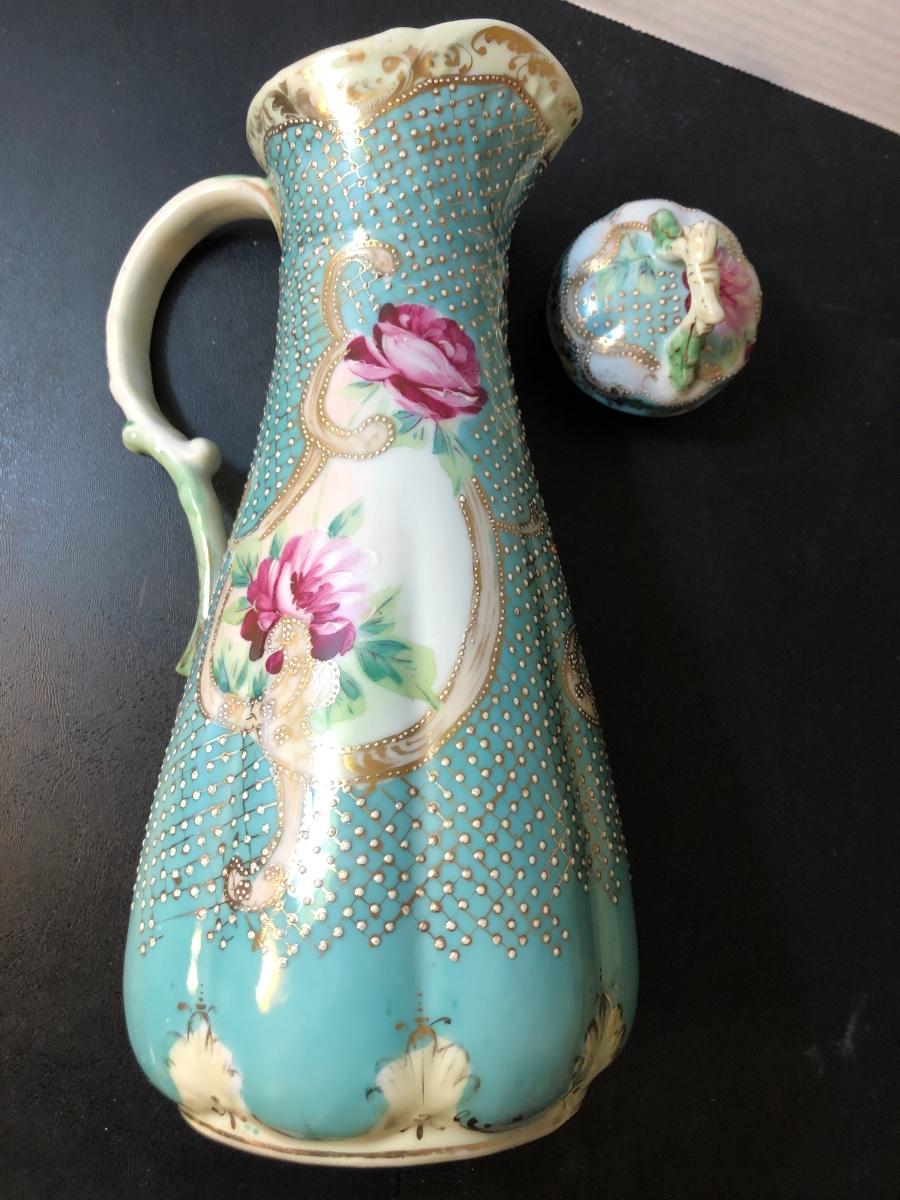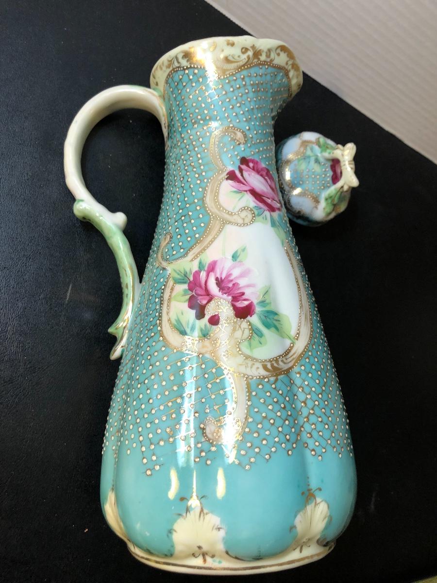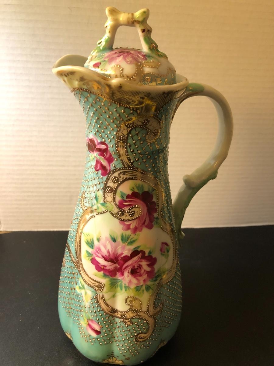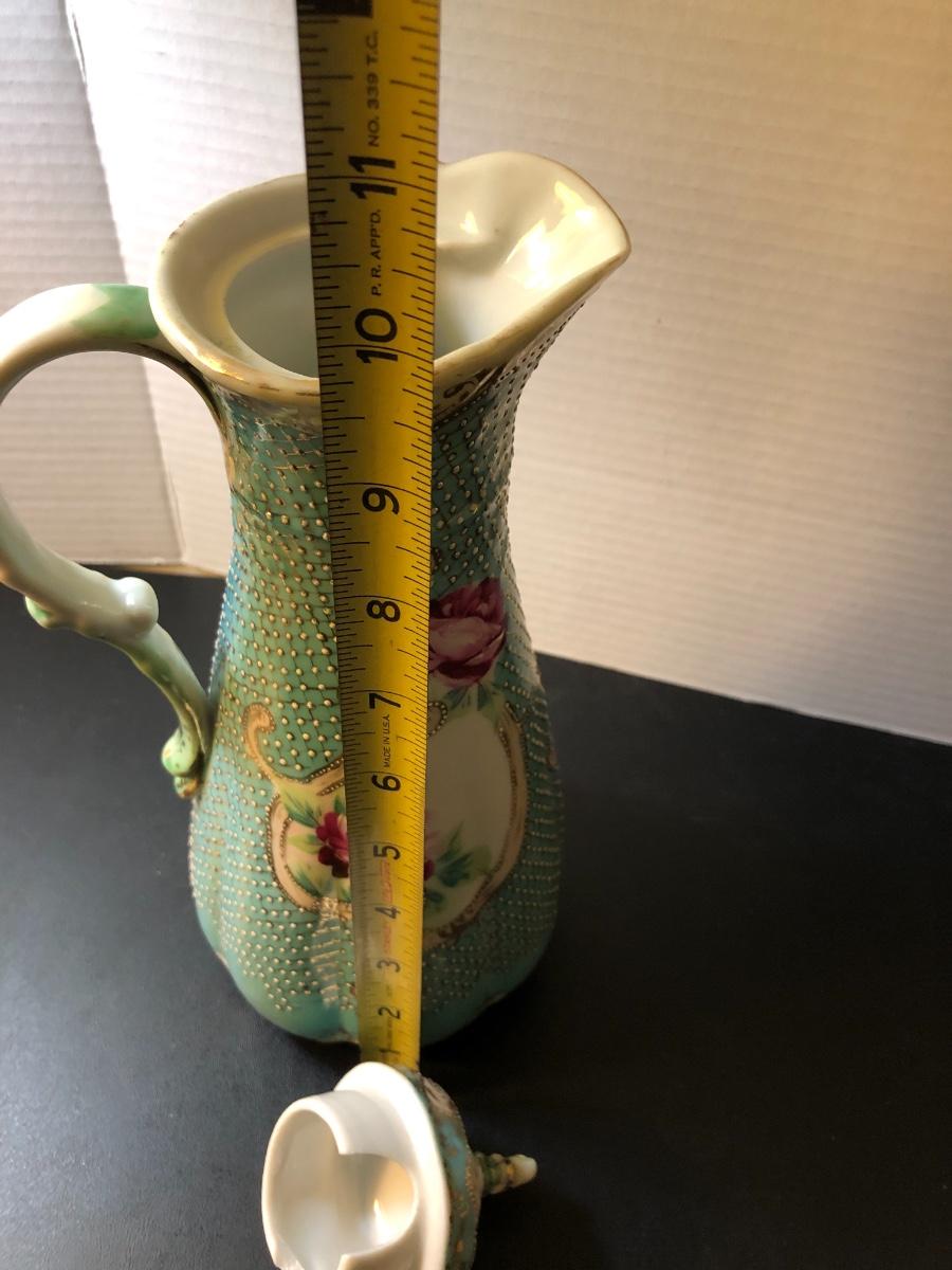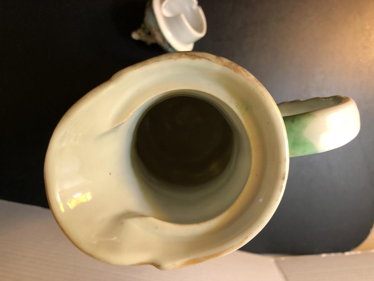 As always - NEVER A BUYER'S PREMIUM - NO CREDIT CARD FEES - All items start at $10 and are being auctioned with NO RESERVES to the high bidder. Bottom of lid to pitcher is chipped. See photos...