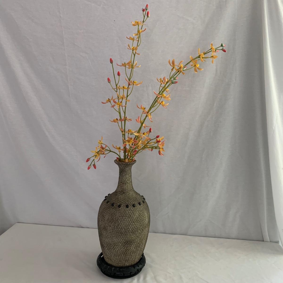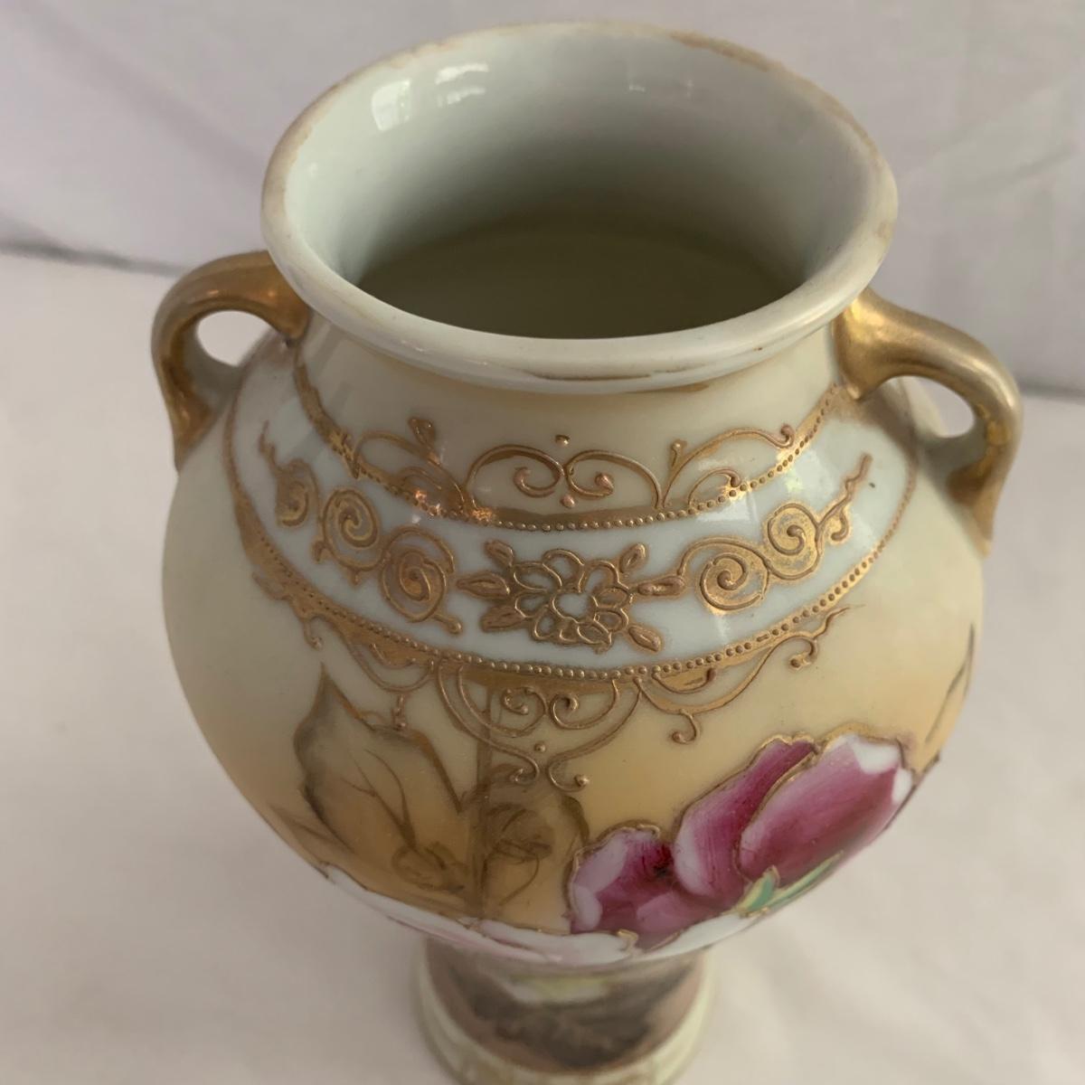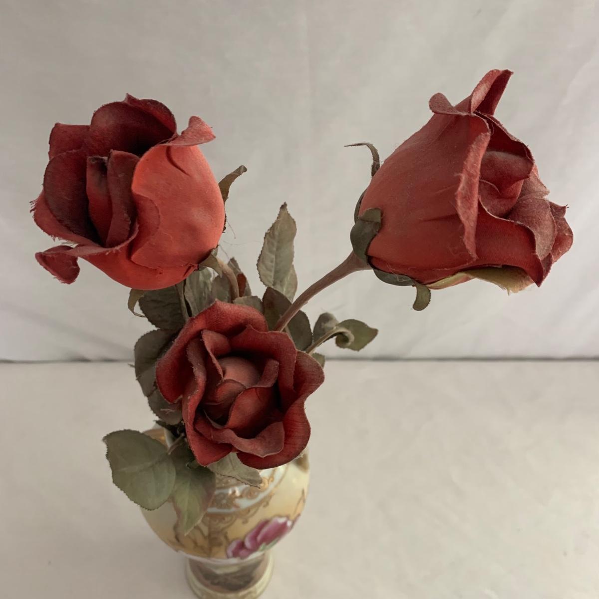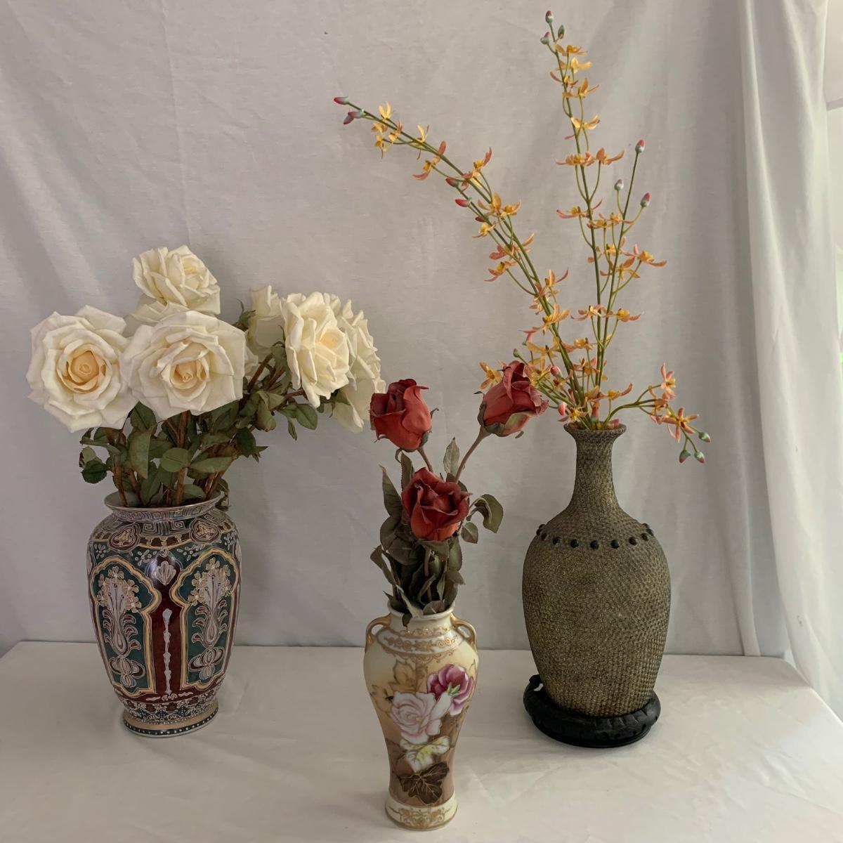 Three lovely vases with faux flowers. Two of the vases with the colorful ornate decorations are glass. They both are textured to the touch. The smaller one is marked “Nippon Hand Painted”. The larger colorful vase measures approximately 8”D at its largest part and 12”H. The third vase with the skinny neck has a resin feel and comes with a wood base. The flowers are a bit dusty.