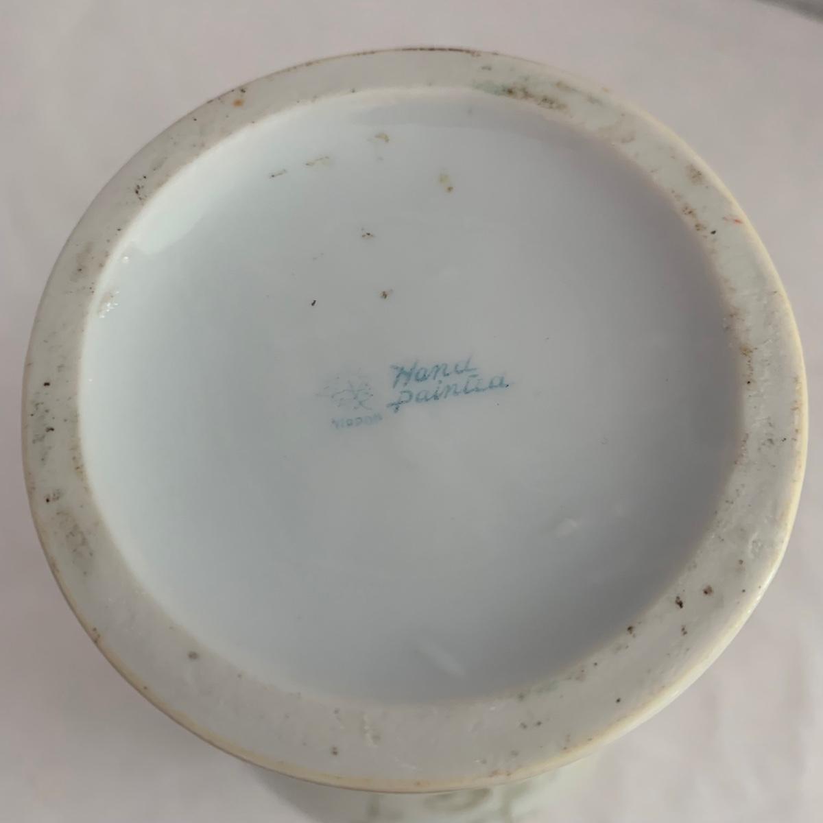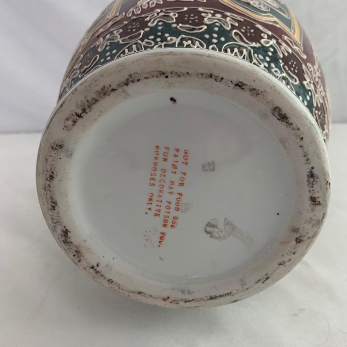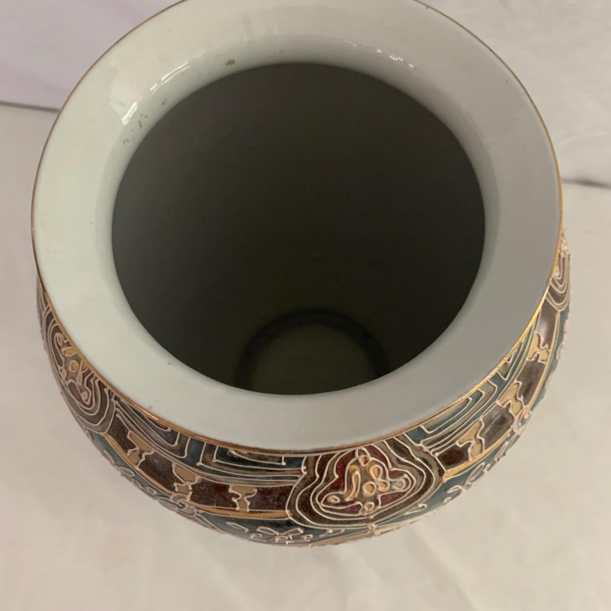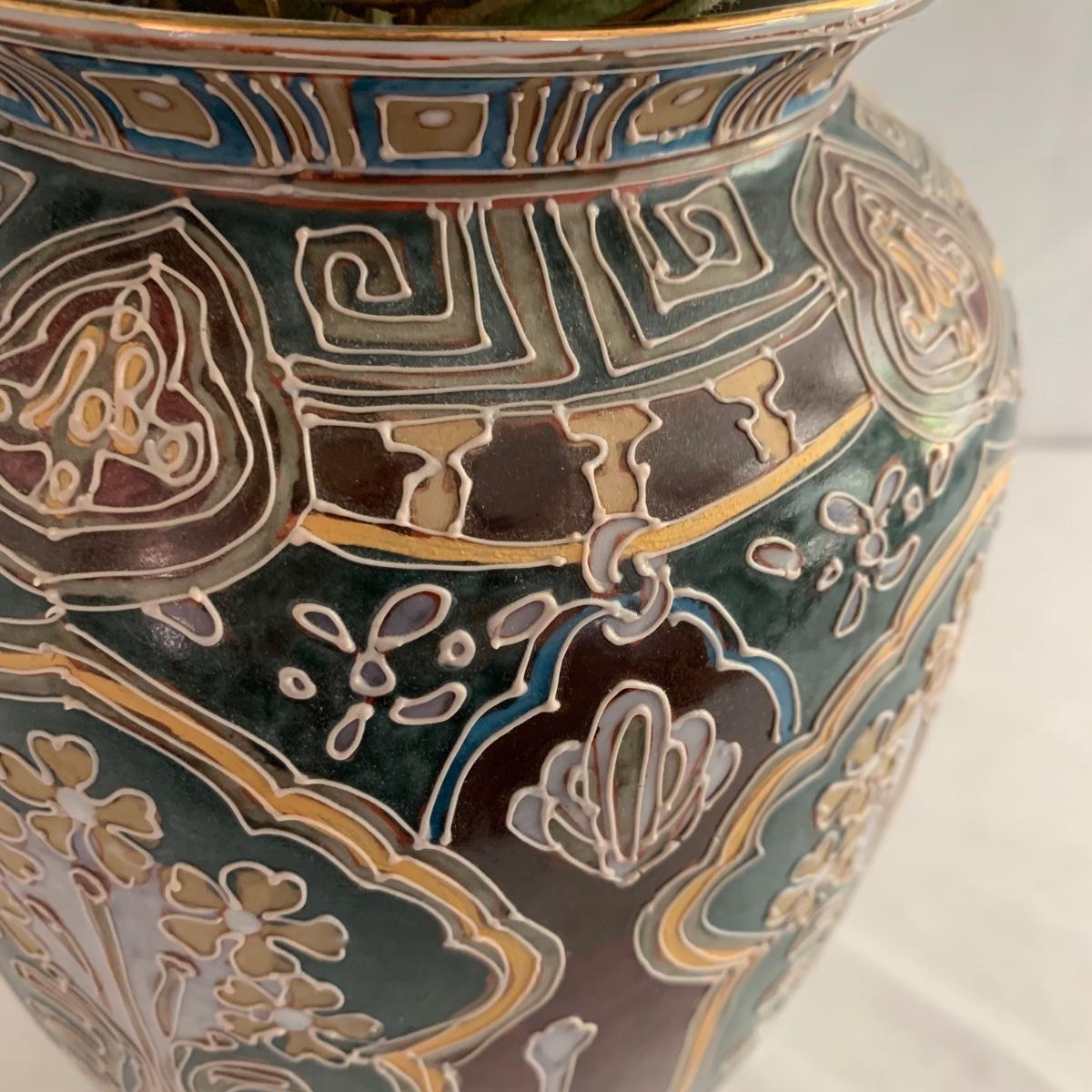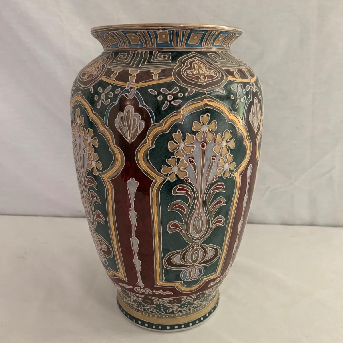 Three lovely vases with faux flowers. Two of the vases with the colorful ornate decorations are glass. They both are textured to the touch. The smaller one is marked “Nippon Hand Painted”. The larger colorful vase measures approximately 8”D at its largest part and 12”H. The third vase with the skinny neck has a resin feel and comes with a wood base. The flowers are a bit dusty.