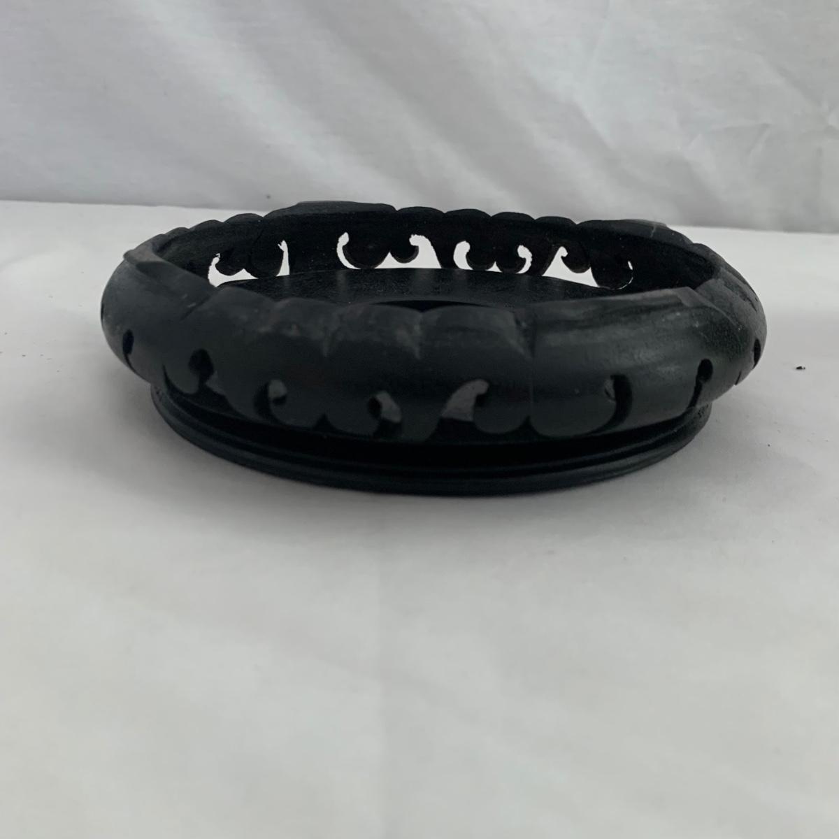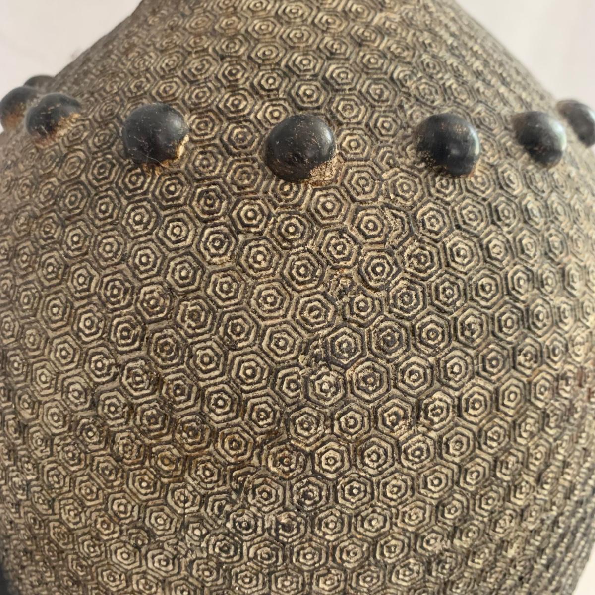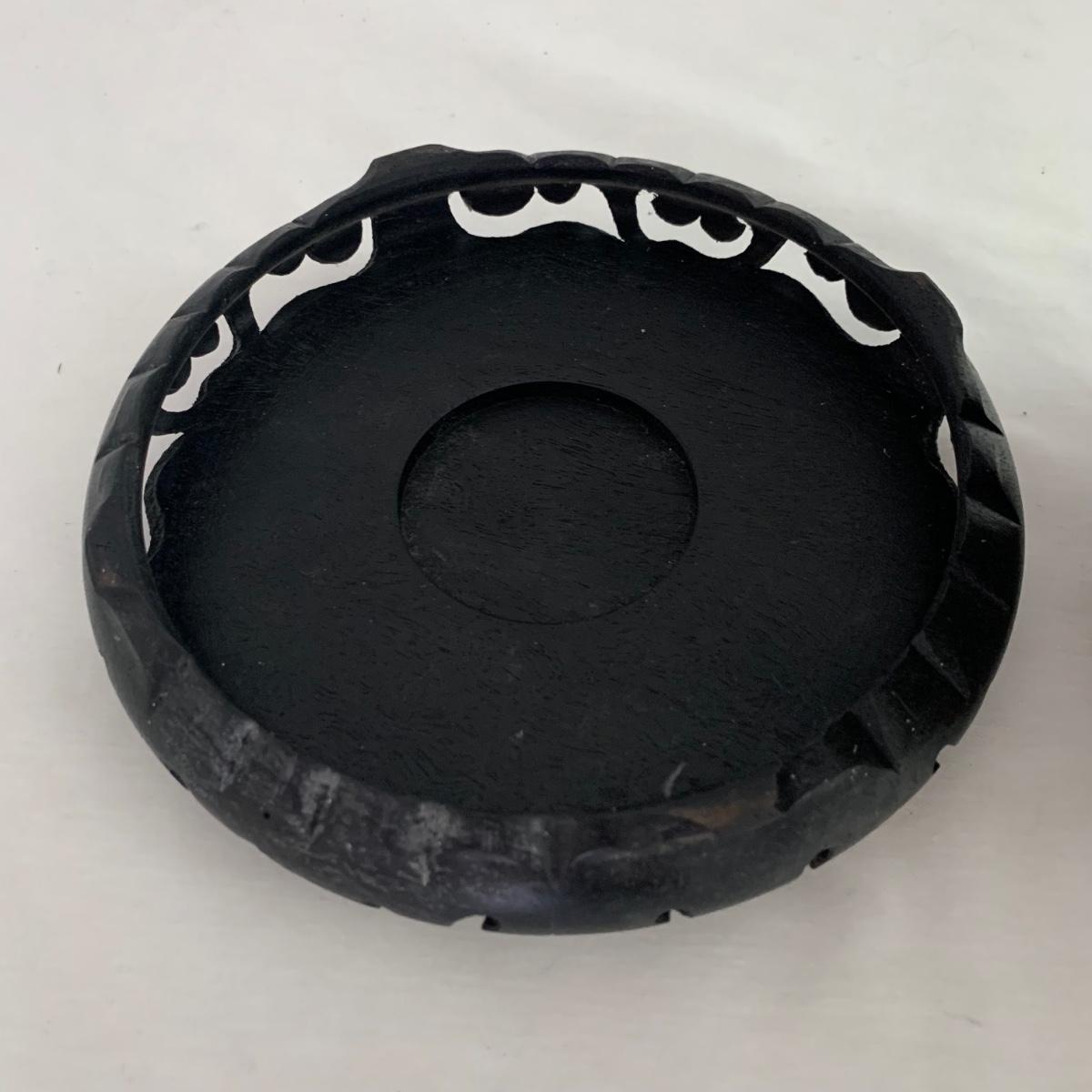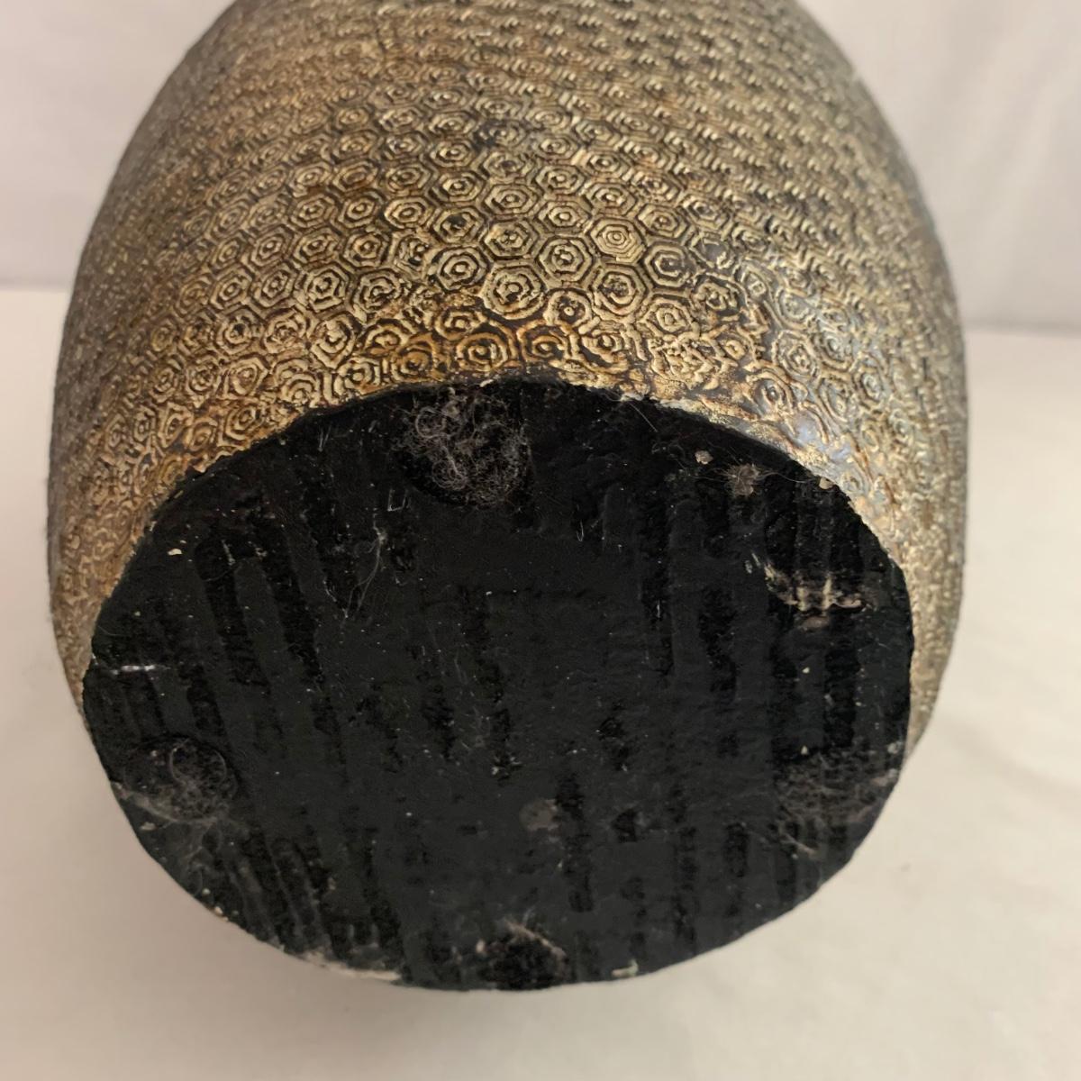 Three lovely vases with faux flowers. Two of the vases with the colorful ornate decorations are glass. They both are textured to the touch. The smaller one is marked “Nippon Hand Painted”. The larger colorful vase measures approximately 8”D at its largest part and 12”H. The third vase with the skinny neck has a resin feel and comes with a wood base. The flowers are a bit dusty.