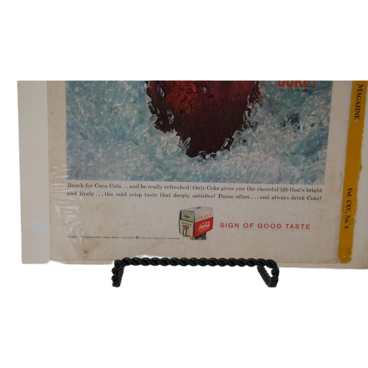 Three vintage Coca-Cola advertisements. One dated June 1959, one dated February 1956, and one dated April 1959. All were taken from The National Geogrpahic Magazine and kept in these loose scrapbook sheets. Varying condition, overall good shape for their age. Each magazine advertisement measures approximately L 7" x H 10". Lot weighs 4 oz. (C83)
