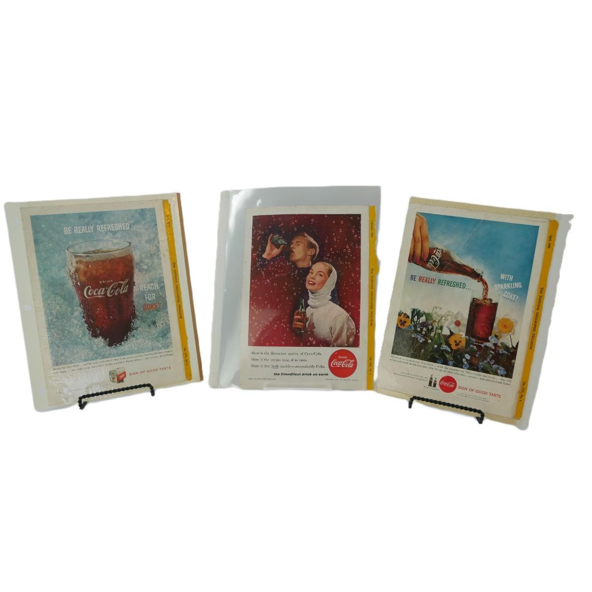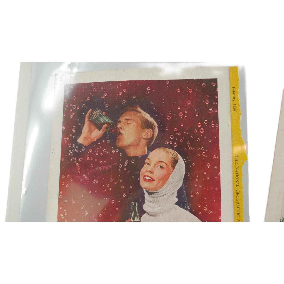 Three vintage Coca-Cola advertisements. One dated June 1959, one dated February 1956, and one dated April 1959. All were taken from The National Geogrpahic Magazine and kept in these loose scrapbook sheets. Varying condition, overall good shape for their age. Each magazine advertisement measures approximately L 7" x H 10". Lot weighs 4 oz. (C83)