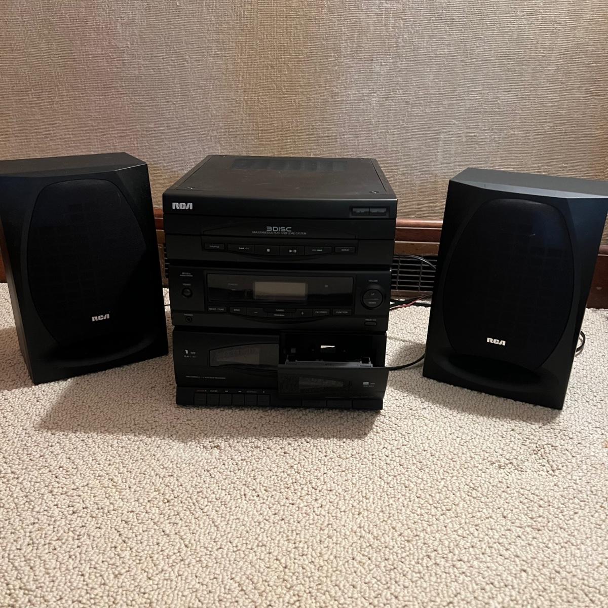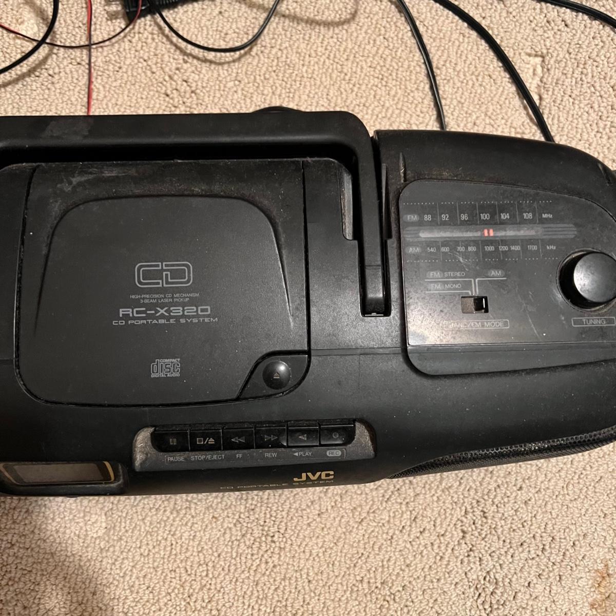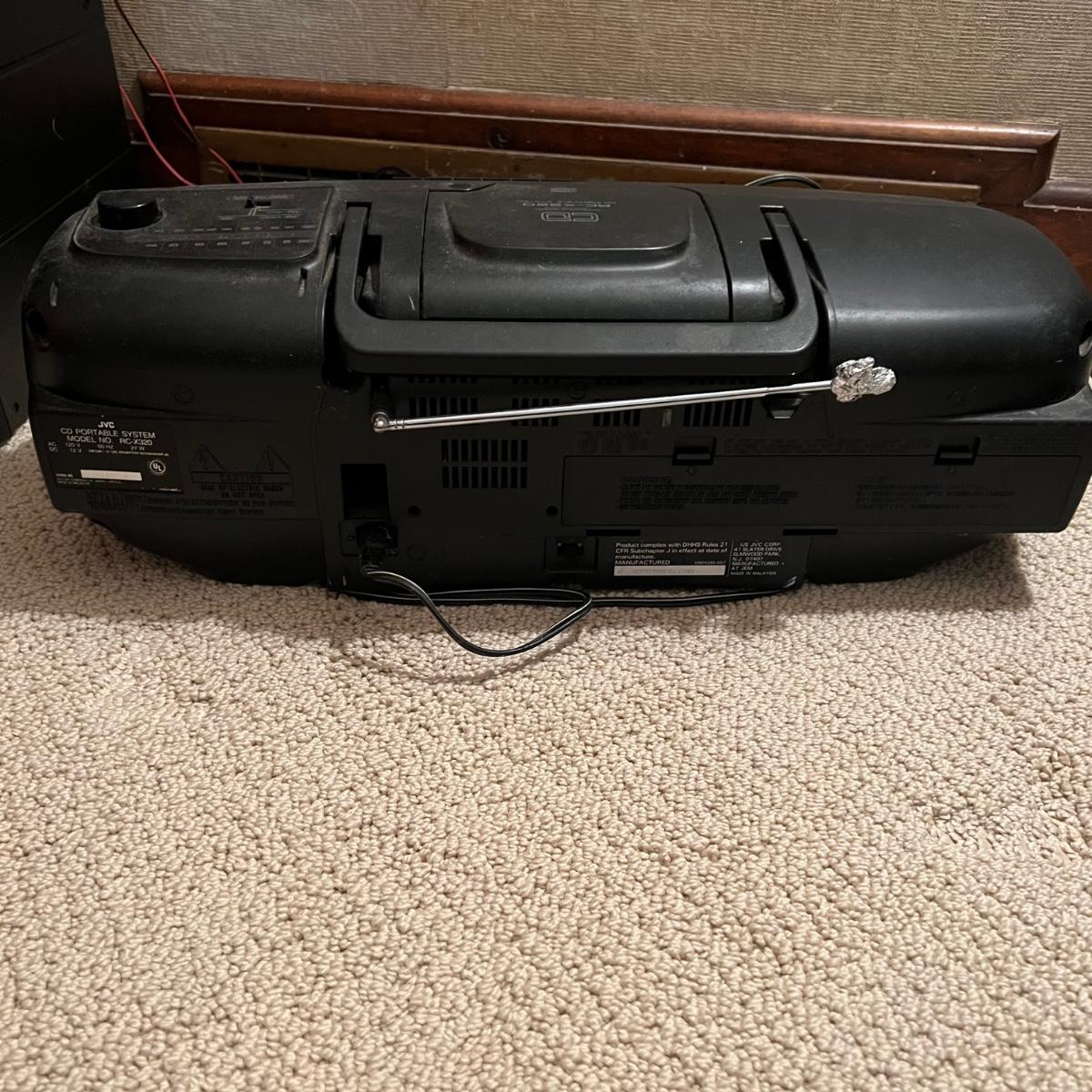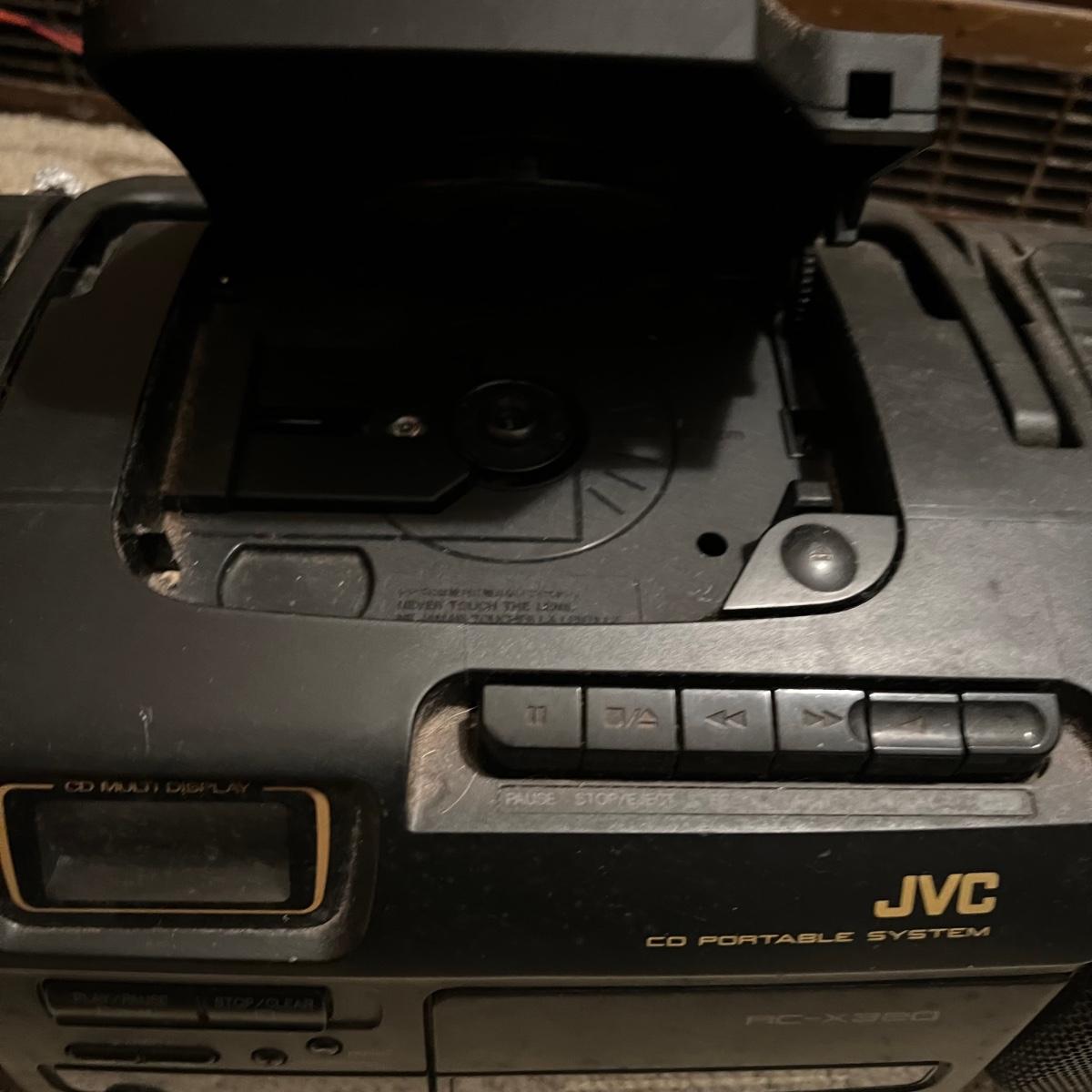 Three different Audio Units. A stand-alone Sony CD player, a JVC radio, cassette tape and CD box and a stacked cassette, radio and RCA CD, radio and duel cassette unit with two wired in RCA speakers. Some surface dust. All items powered on when plugged in.