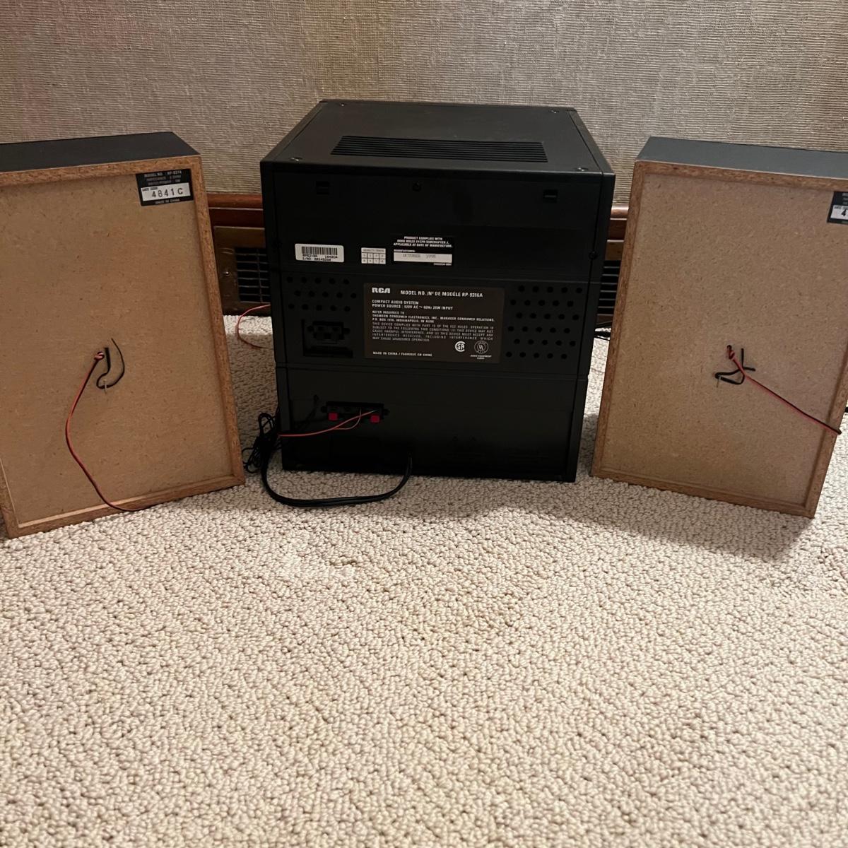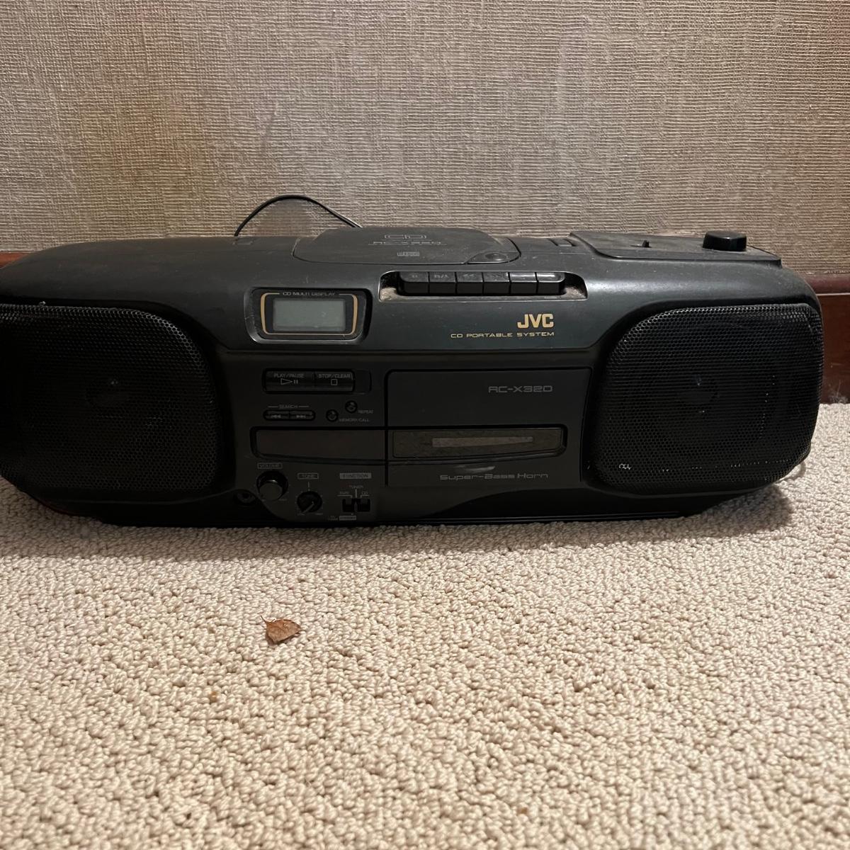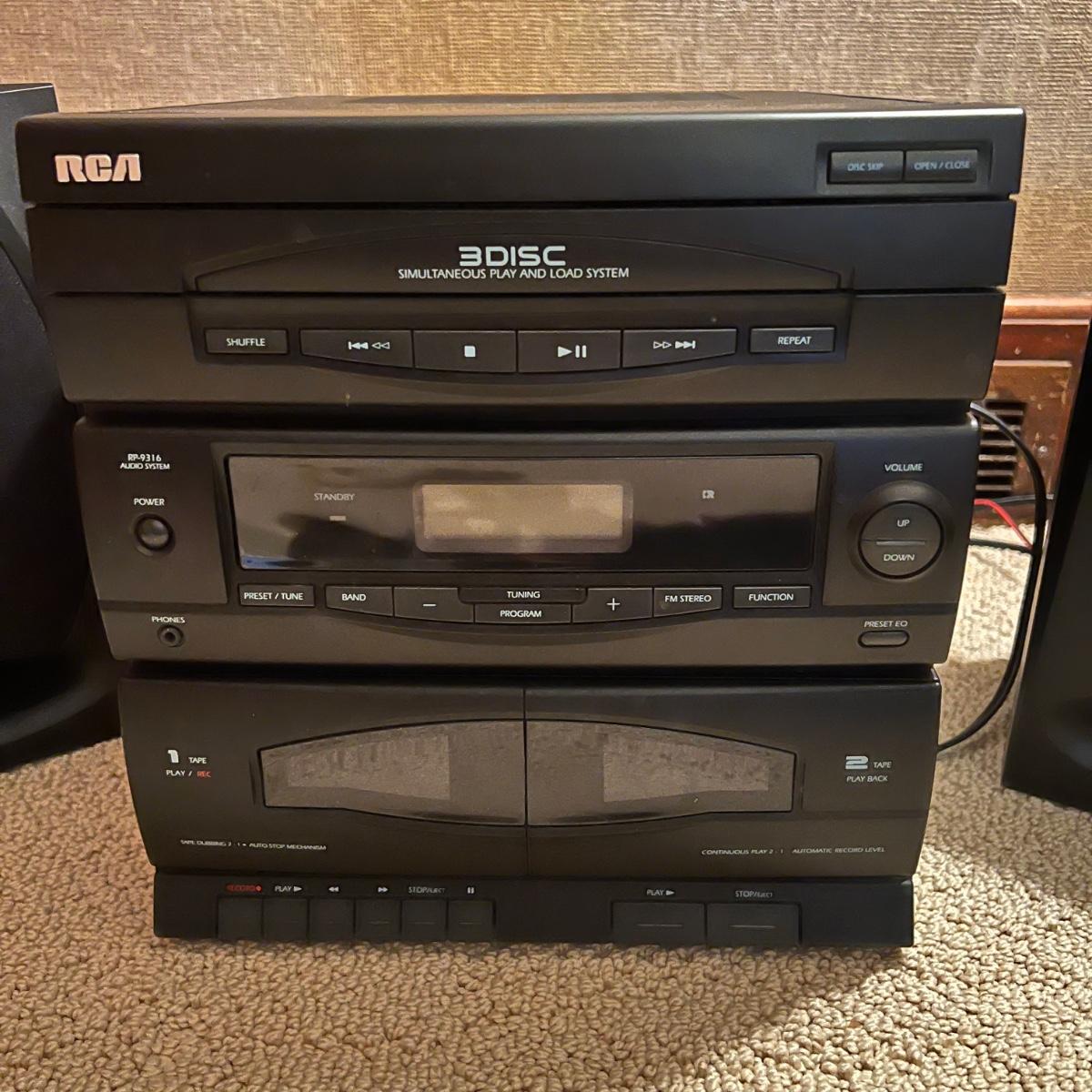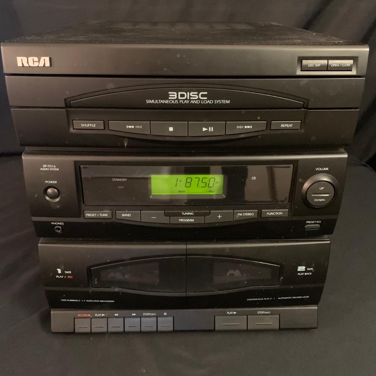 Three different Audio Units. A stand-alone Sony CD player, a JVC radio, cassette tape and CD box and a stacked cassette, radio and RCA CD, radio and duel cassette unit with two wired in RCA speakers. Some surface dust. All items powered on when plugged in.