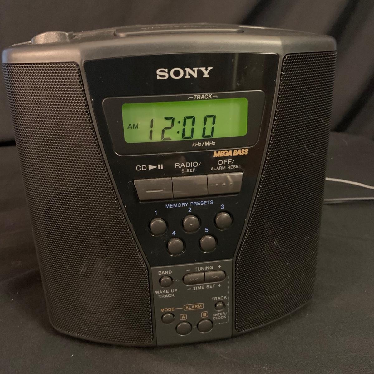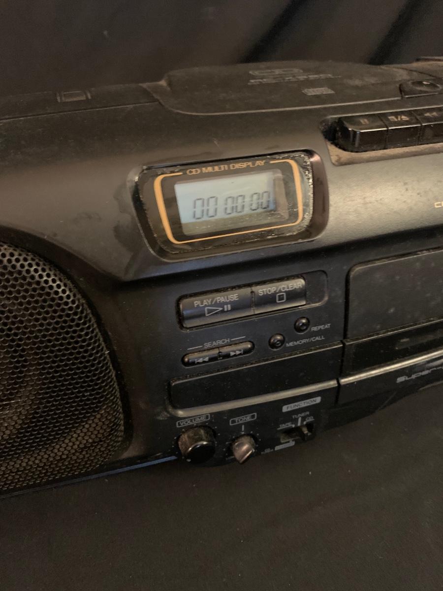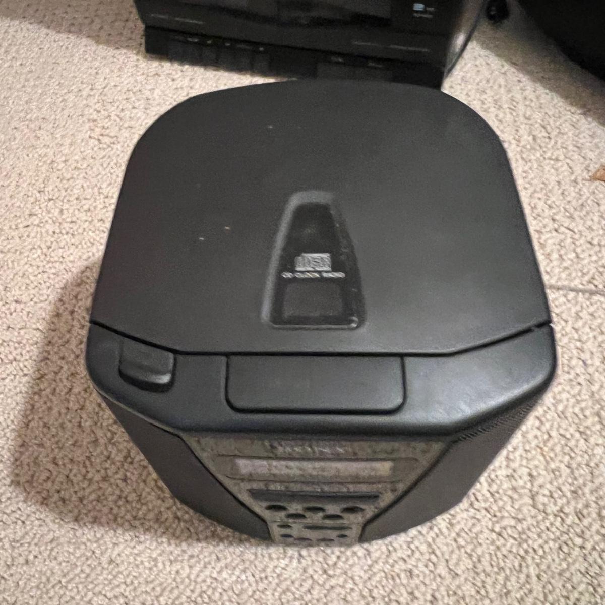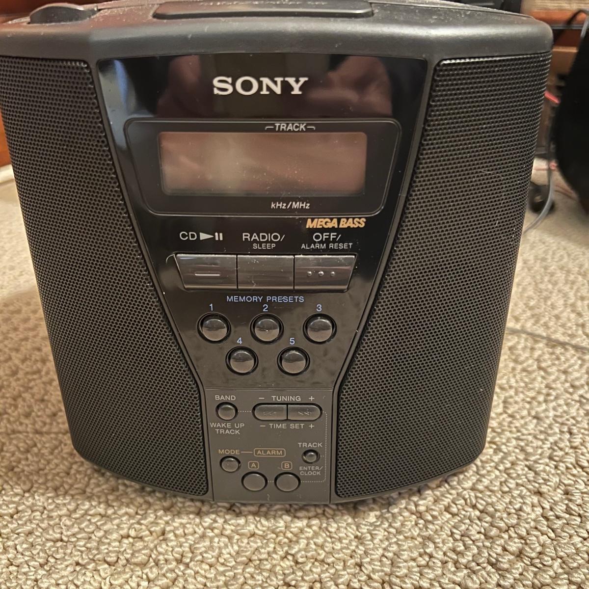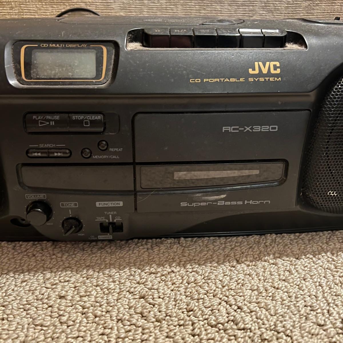 Three different Audio Units. A stand-alone Sony CD player, a JVC radio, cassette tape and CD box and a stacked cassette, radio and RCA CD, radio and duel cassette unit with two wired in RCA speakers. Some surface dust. All items powered on when plugged in.