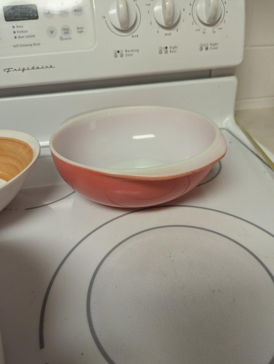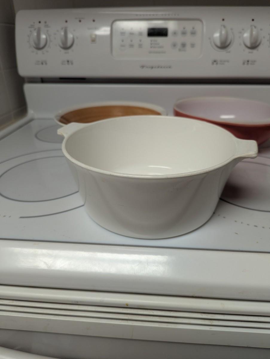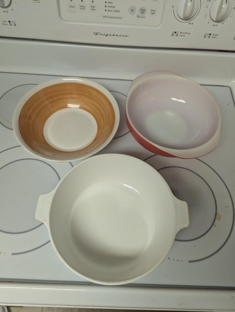 Three vintage bowls, one is like a casserole dish.