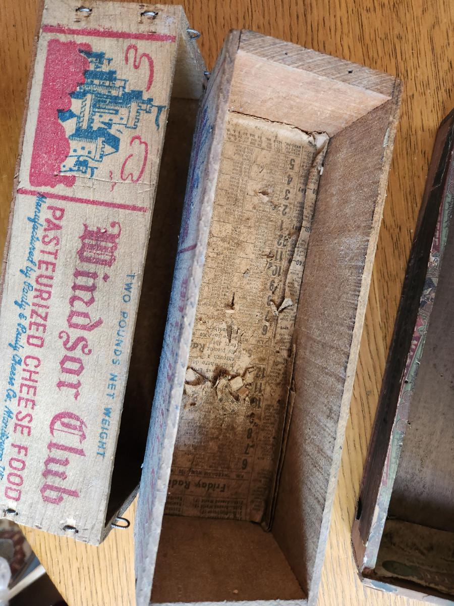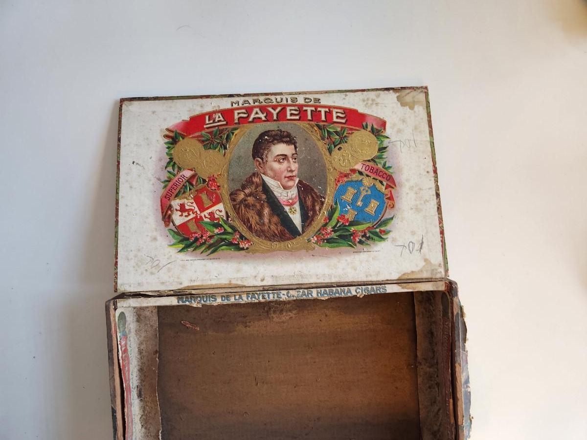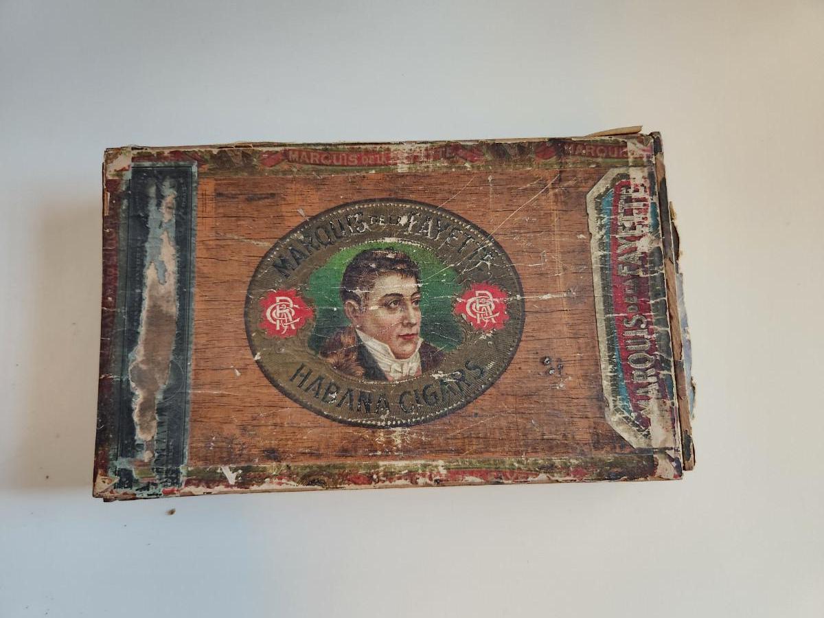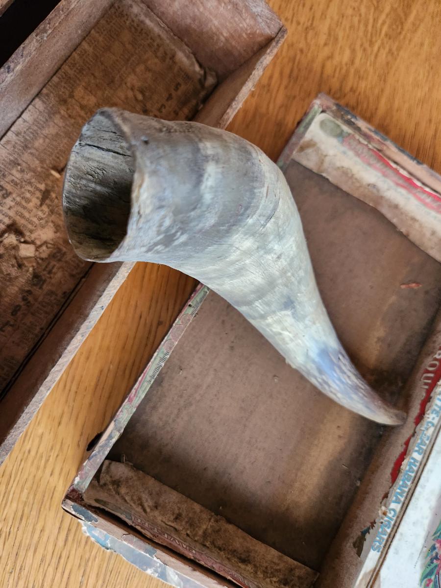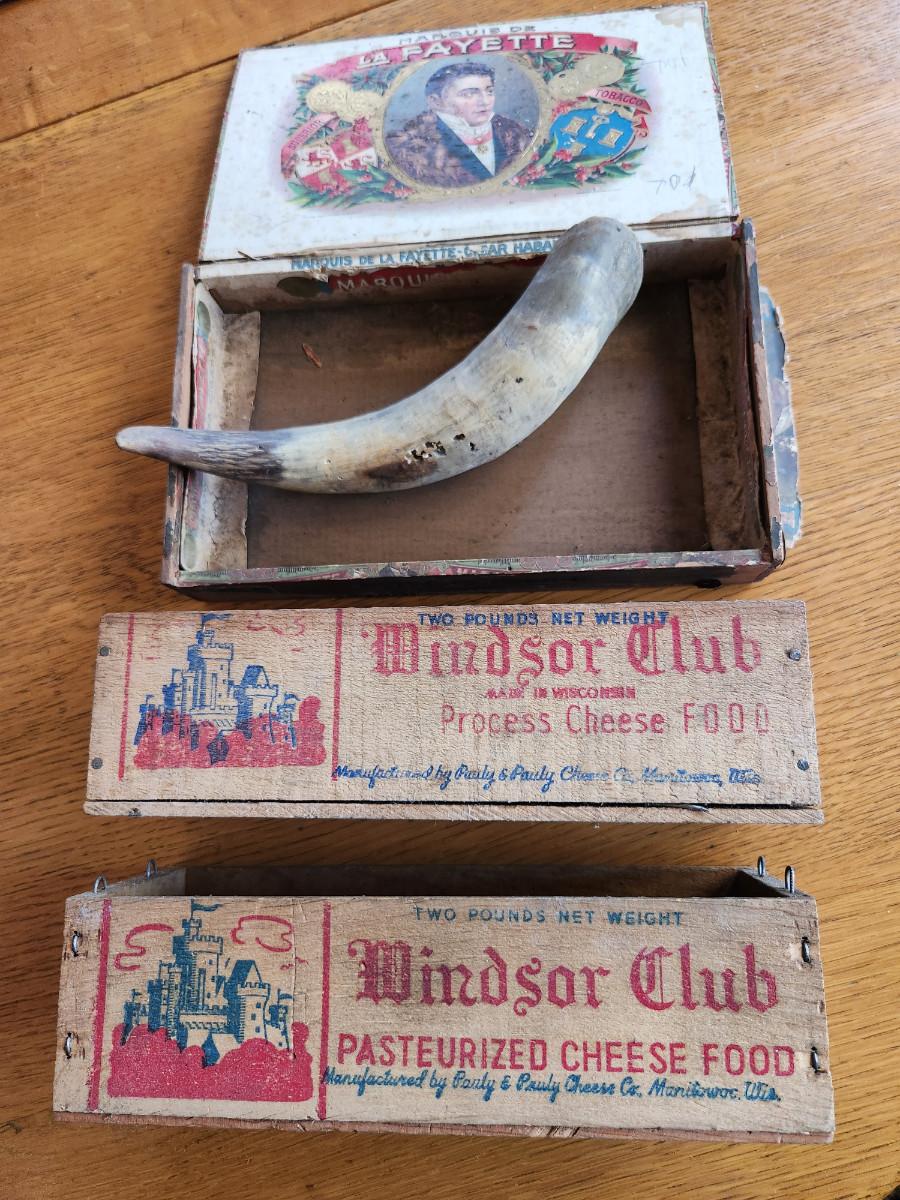 Thia auction lot is for Three Vintage Boxes and a Horn. Two are old Windsor Club wooden cheese boxes, another is an old Marquis de LaFayette Cigar Box and the other is a old horn that appears to have been previously rigged to hold powder or at least looks that way. Kinda rough but might be useful for someone purpose.