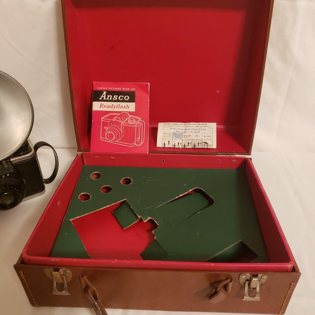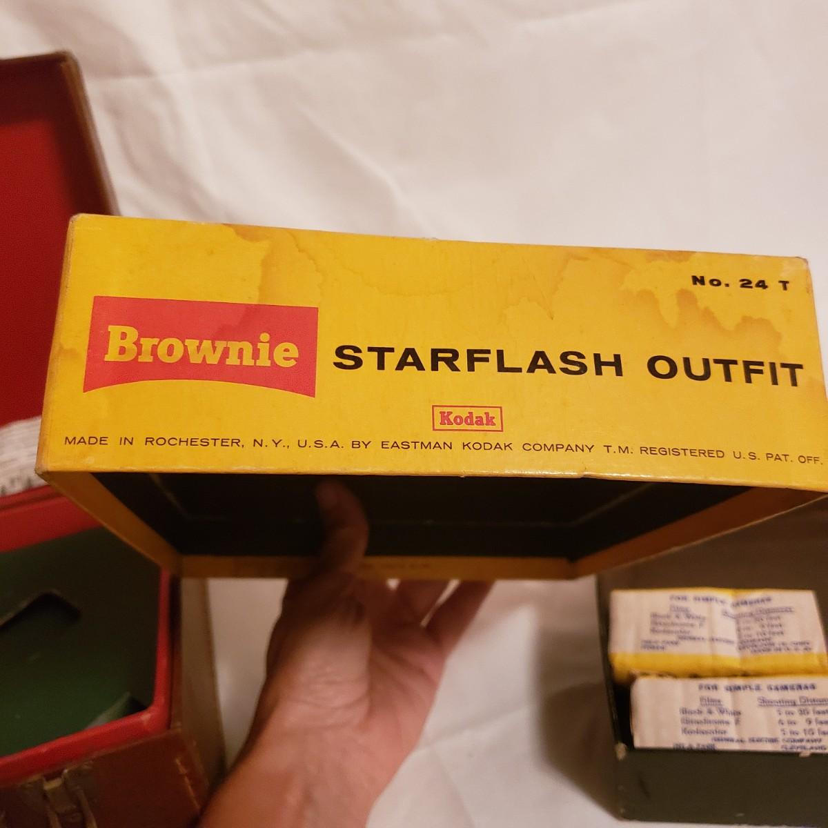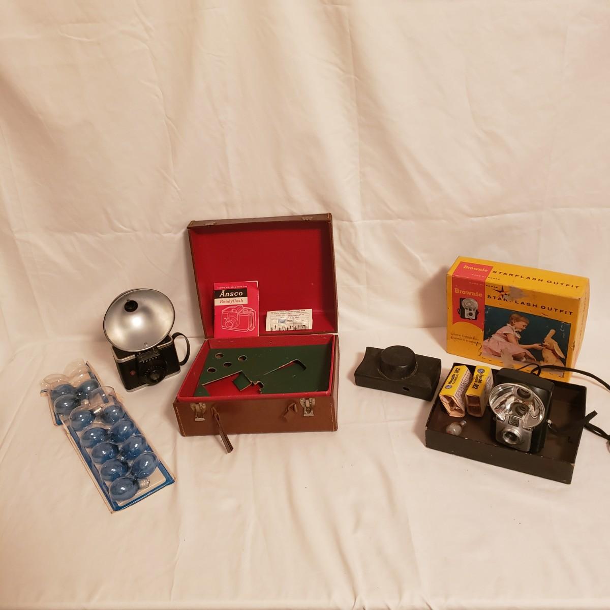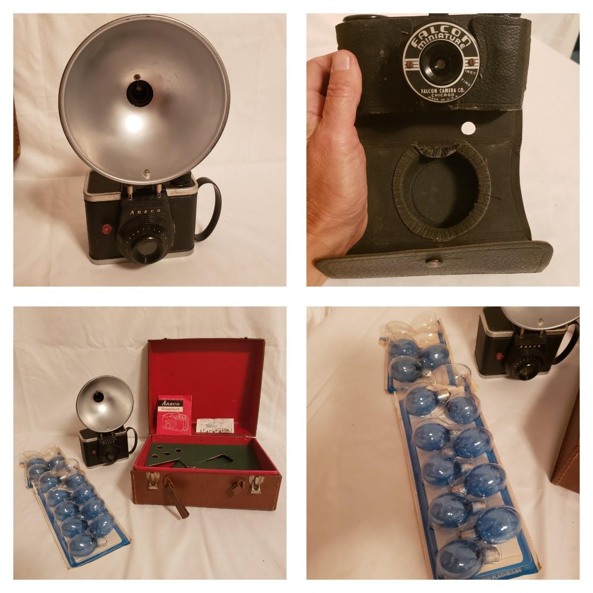 This is a vintage camera lot with three cameras. The Kodak Brownie is the Starflash Outfit. Comes in the original box and has bulbs. The Falcon Miniature (5.5" x 2.5" x 3.5"H) comes in a hard case. The case appears to be hard cardboard or thin leather, its hard to tell. It still snaps! The Ansco camera comes in its original box! The leather handle is broken. Camera comes with blue bulbs from Kmart! See pictures for details.