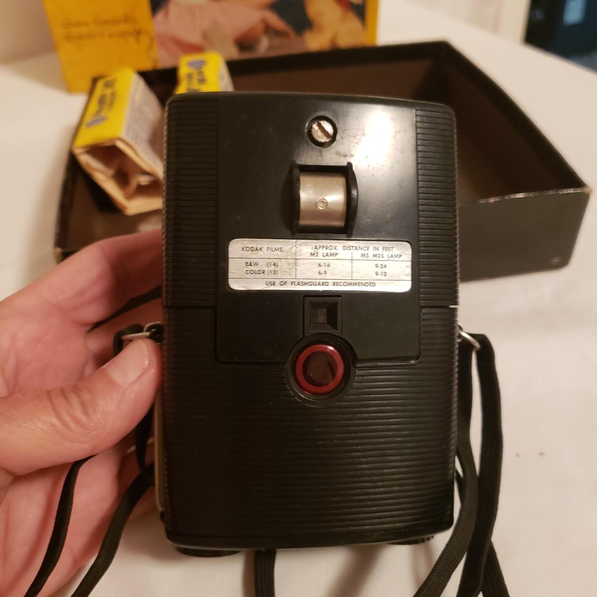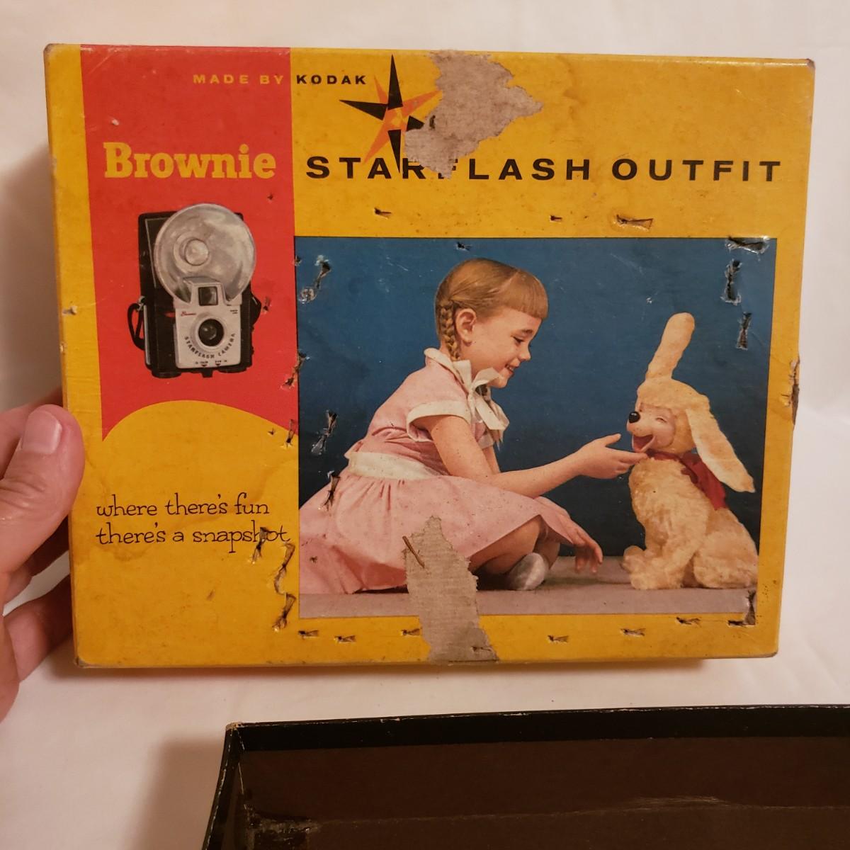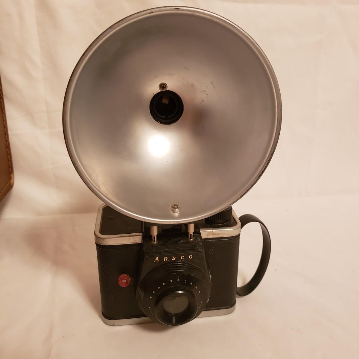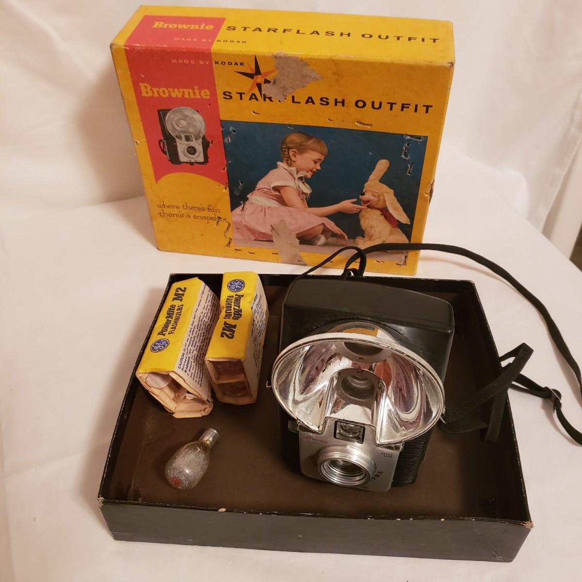 This is a vintage camera lot with three cameras. The Kodak Brownie is the Starflash Outfit. Comes in the original box and has bulbs. The Falcon Miniature (5.5" x 2.5" x 3.5"H) comes in a hard case. The case appears to be hard cardboard or thin leather, its hard to tell. It still snaps! The Ansco camera comes in its original box! The leather handle is broken. Camera comes with blue bulbs from Kmart! See pictures for details.