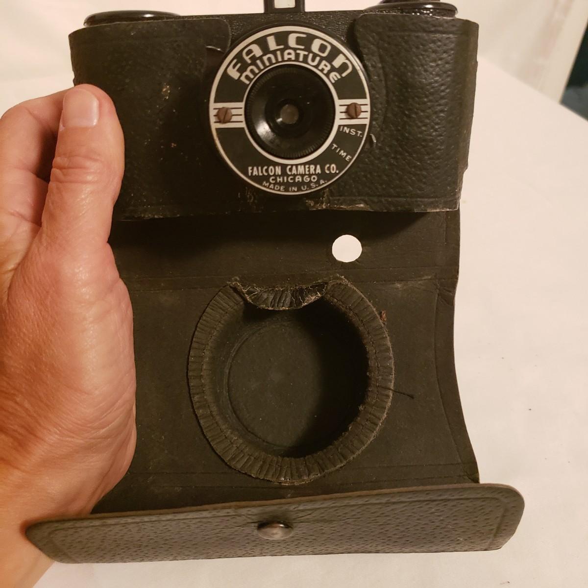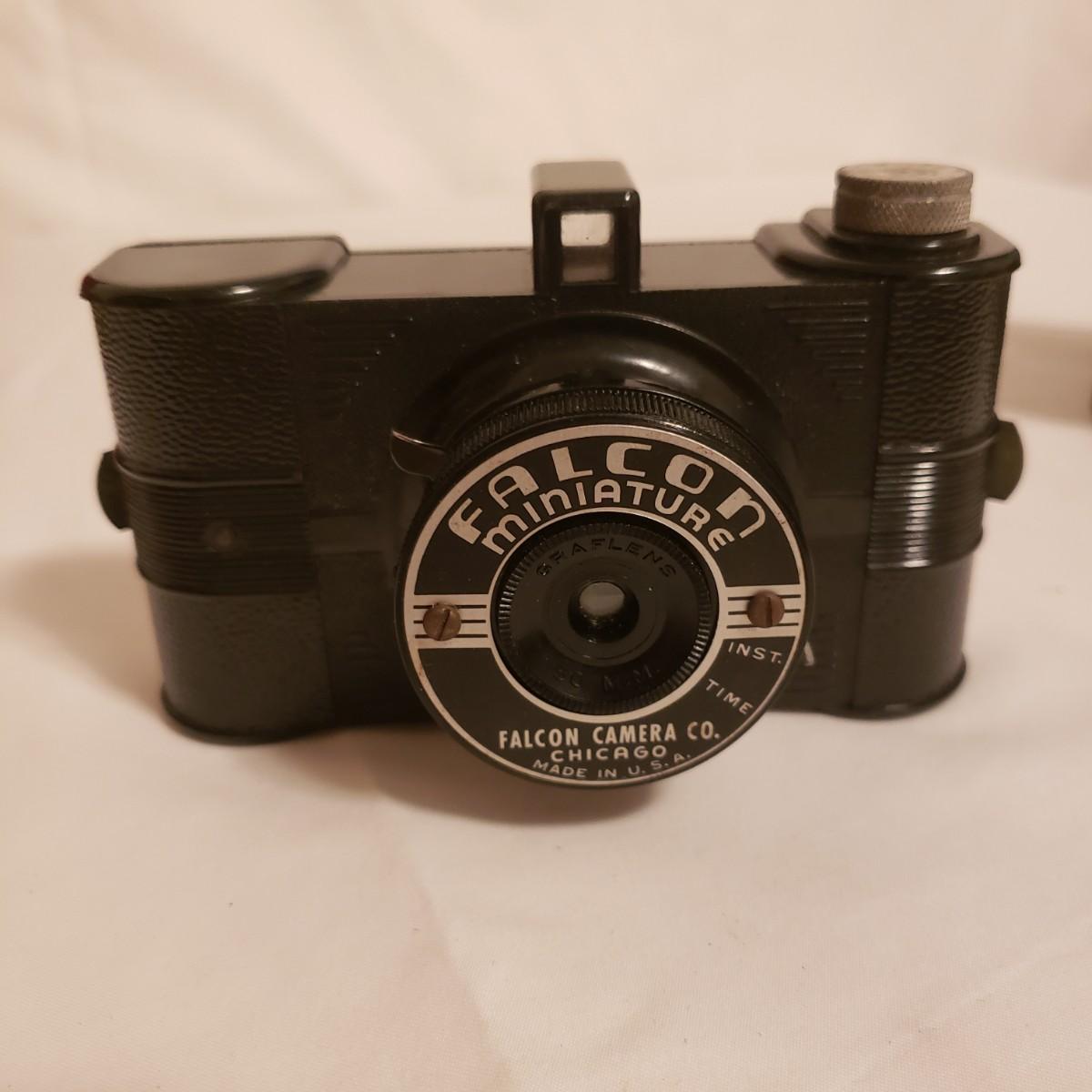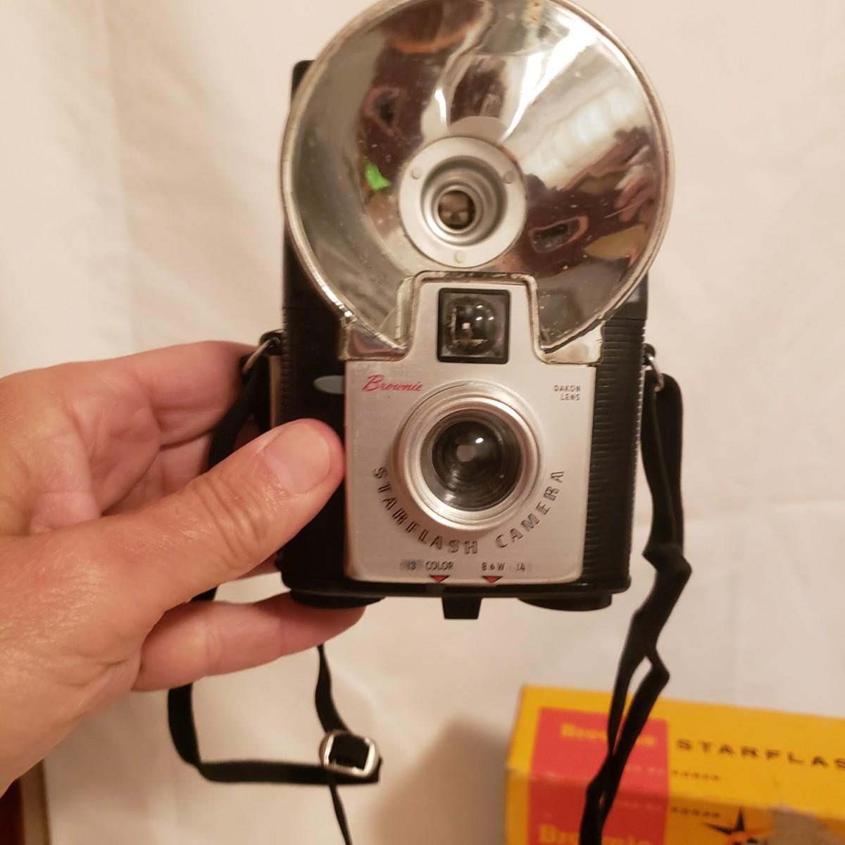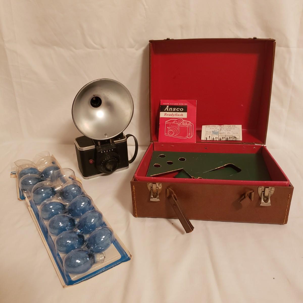 This is a vintage camera lot with three cameras. The Kodak Brownie is the Starflash Outfit. Comes in the original box and has bulbs. The Falcon Miniature (5.5" x 2.5" x 3.5"H) comes in a hard case. The case appears to be hard cardboard or thin leather, its hard to tell. It still snaps! The Ansco camera comes in its original box! The leather handle is broken. Camera comes with blue bulbs from Kmart! See pictures for details.