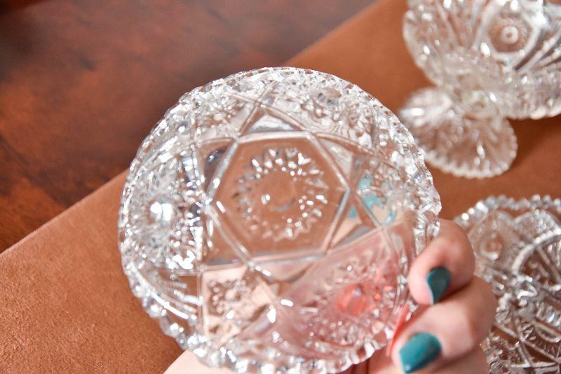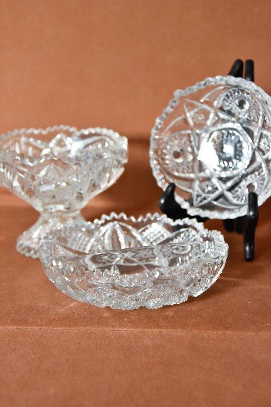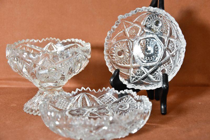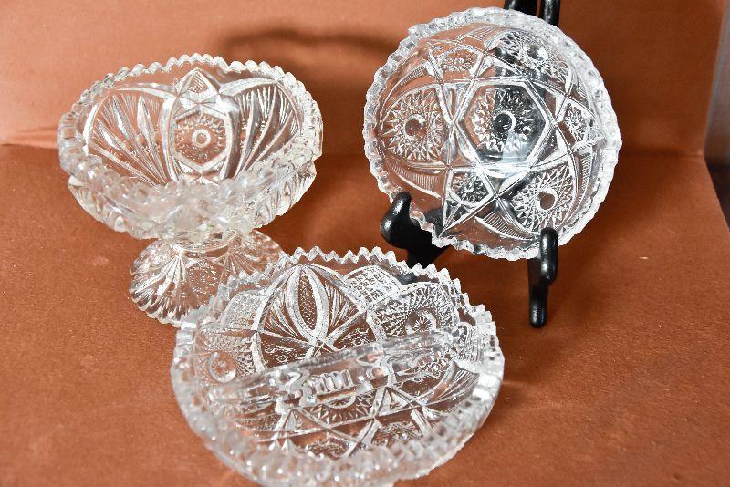 Three styles of cut glass candy/serving dishes. One divided, and one standing.
