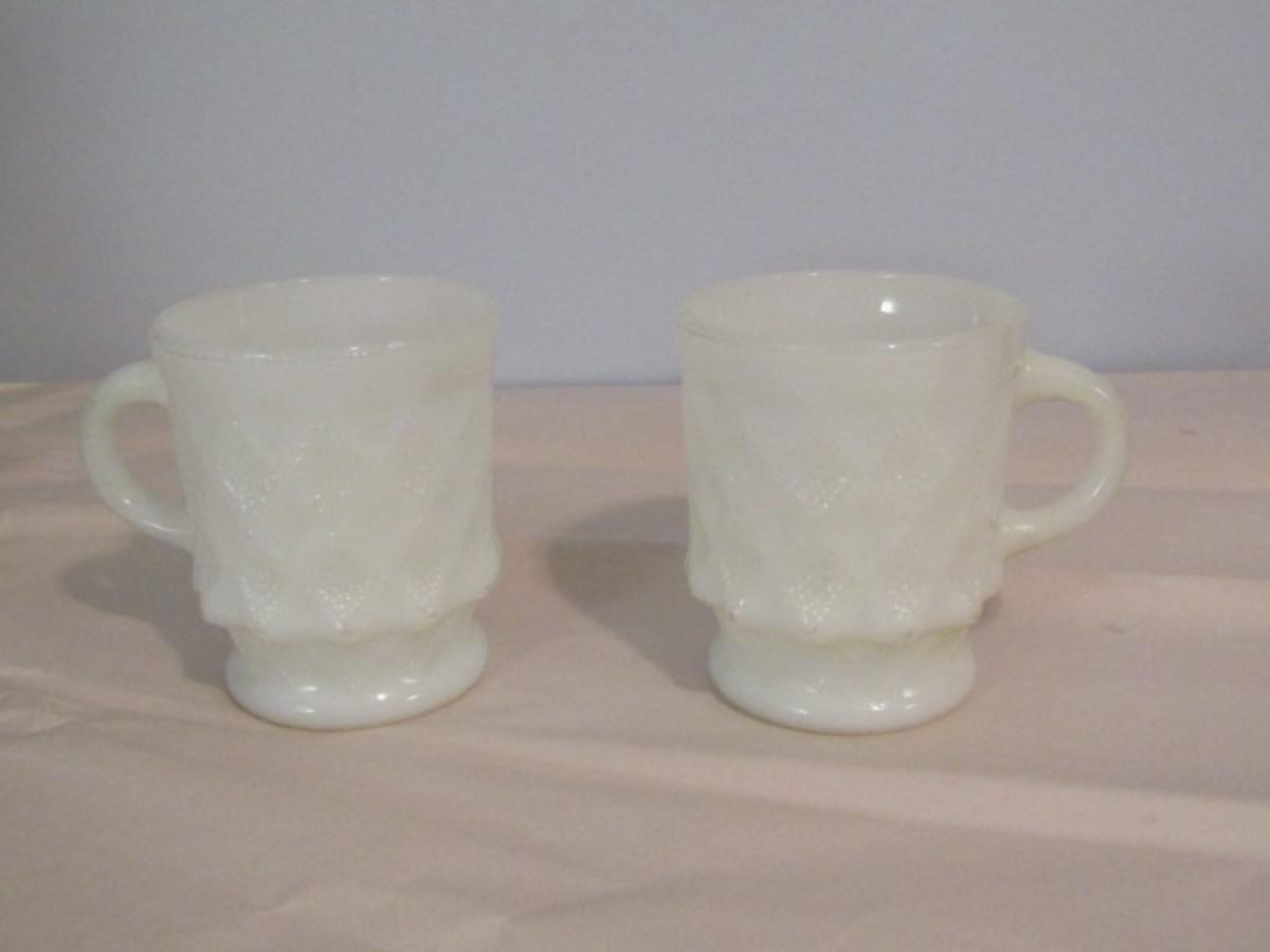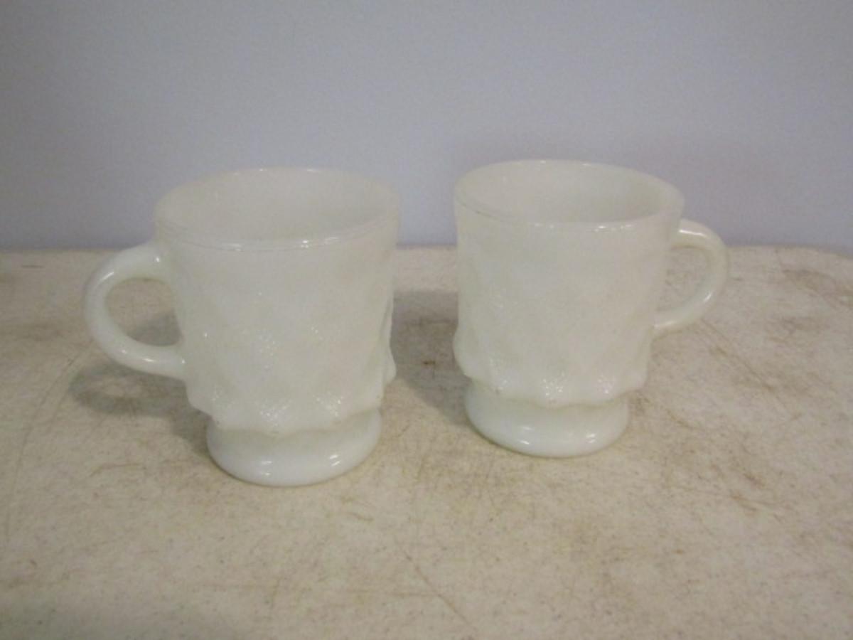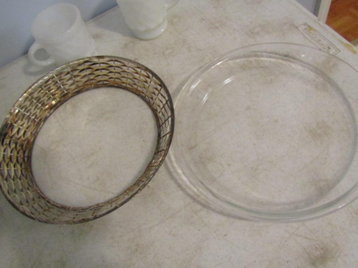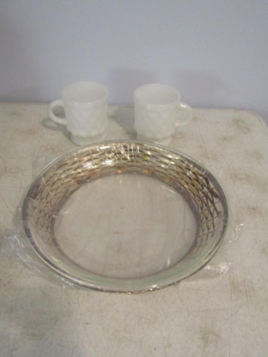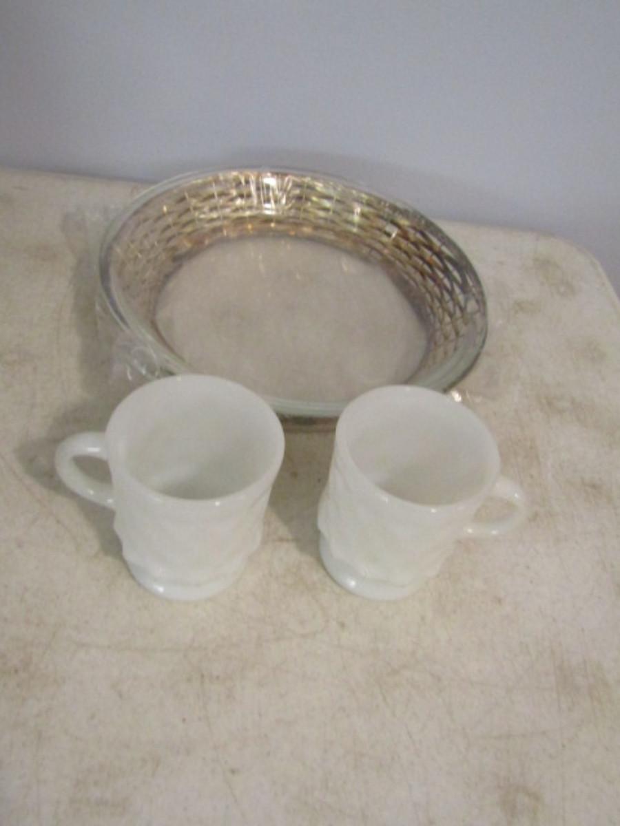 Fire King Pieces- Pie Plate with Metal Sleeve and Two Kimberly Mugs (E)