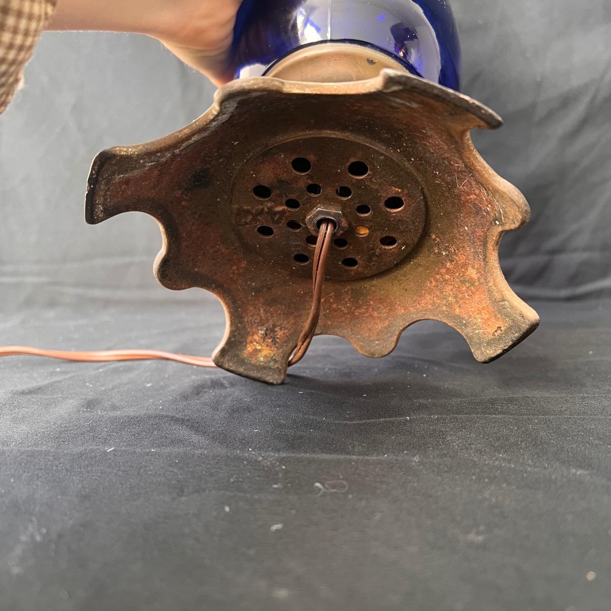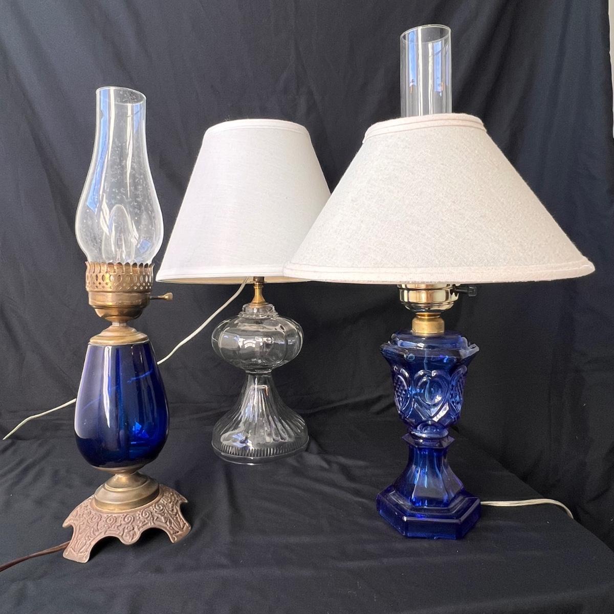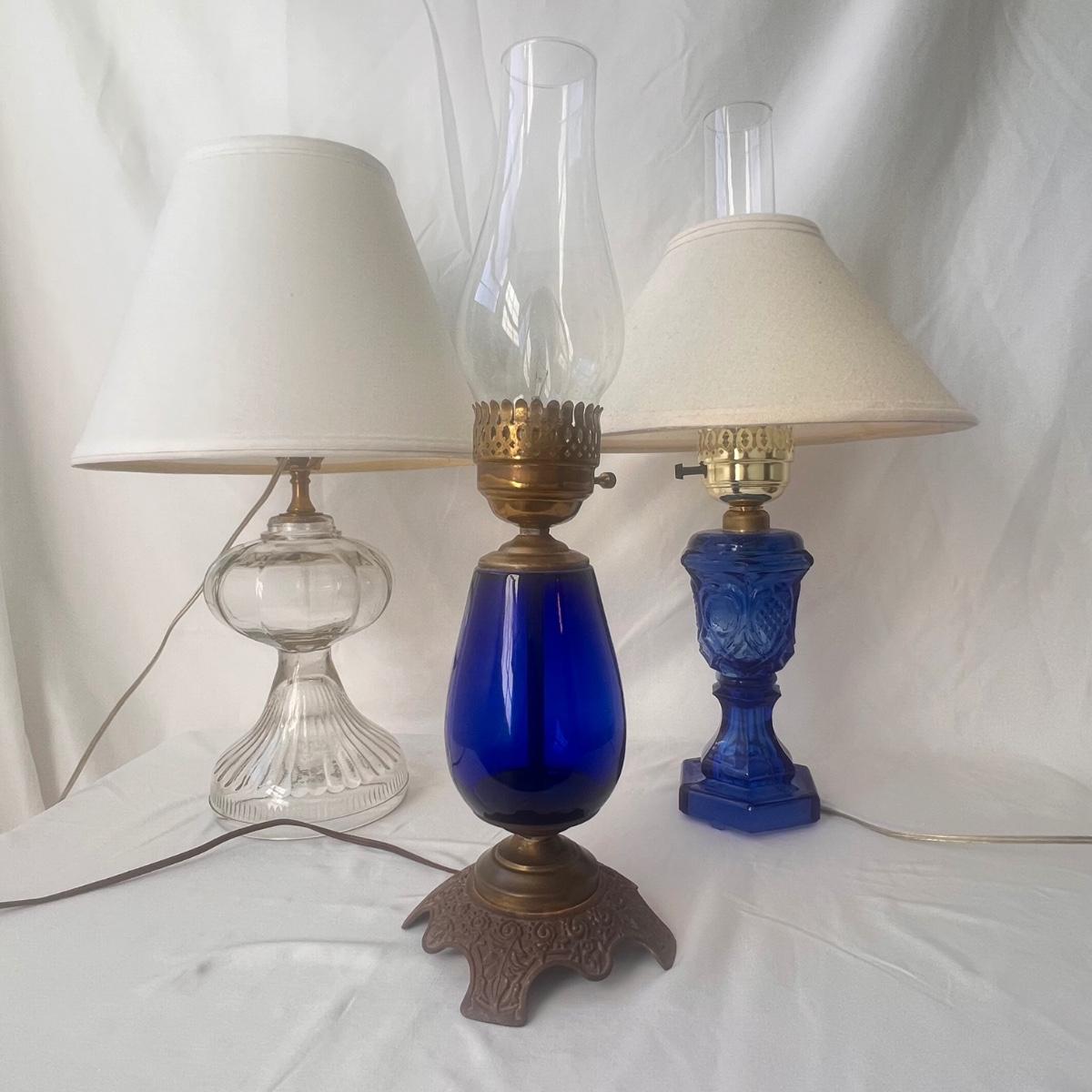 This lot includes three vintage glass lamps of various sizes. The clear lamp measures 11” x 19.5”H. The cobalt blue lamp with the cast iron base measures 6” x 19”H. The other blue lamp measures 11” x 21”H. Measurements are with globes and shades on. All lamps appear to be old oil lamps that have been converted into electric lamps. All lamps powered on when plugged in. Shipping available. Shipping can be costly. We suggest contacting our preferred local shipping provider, Postage Express, with dimensions and getting an estimate before bidding: (828) 255-9250 or shipping@postageexpressnc.com.