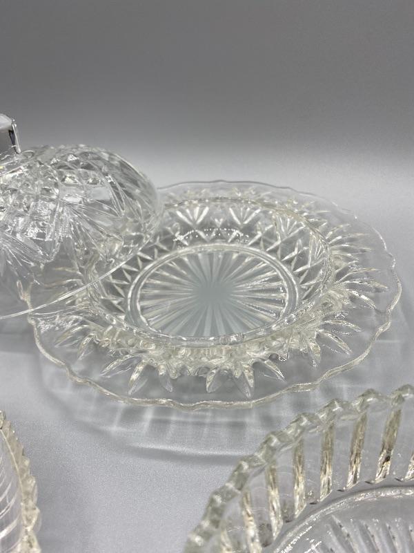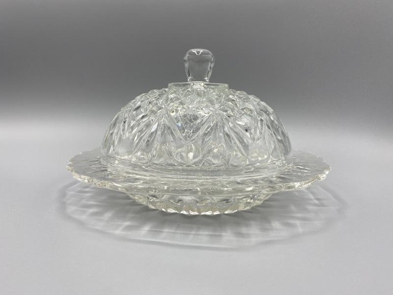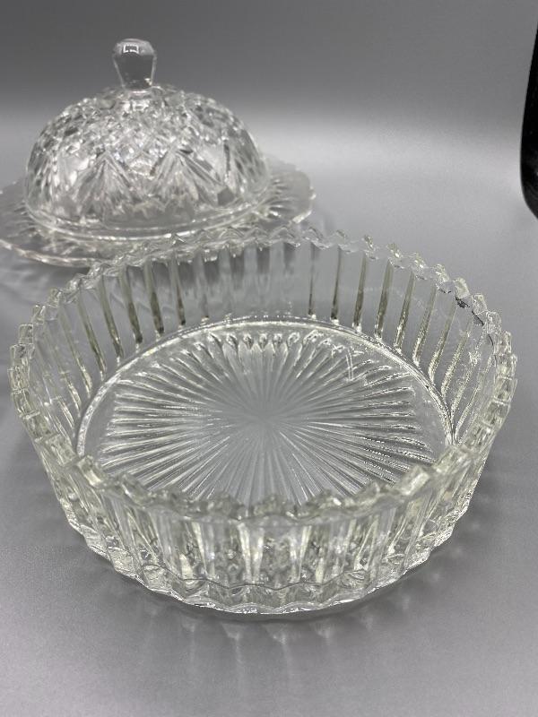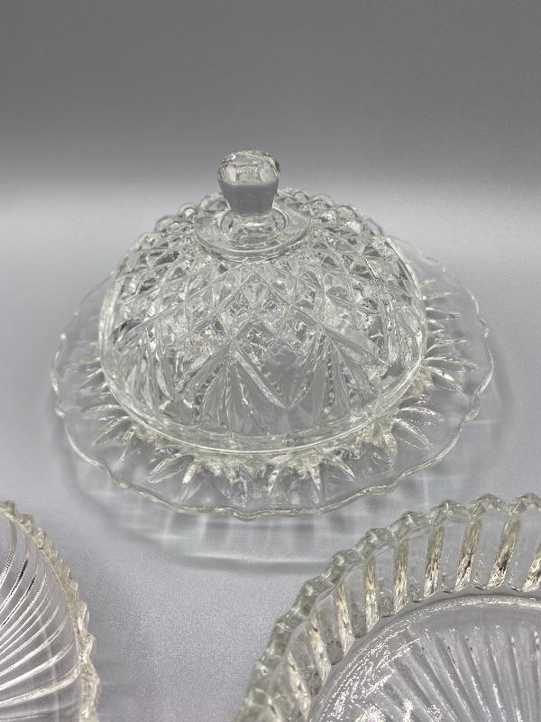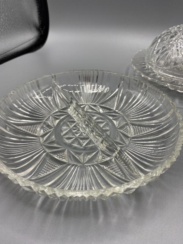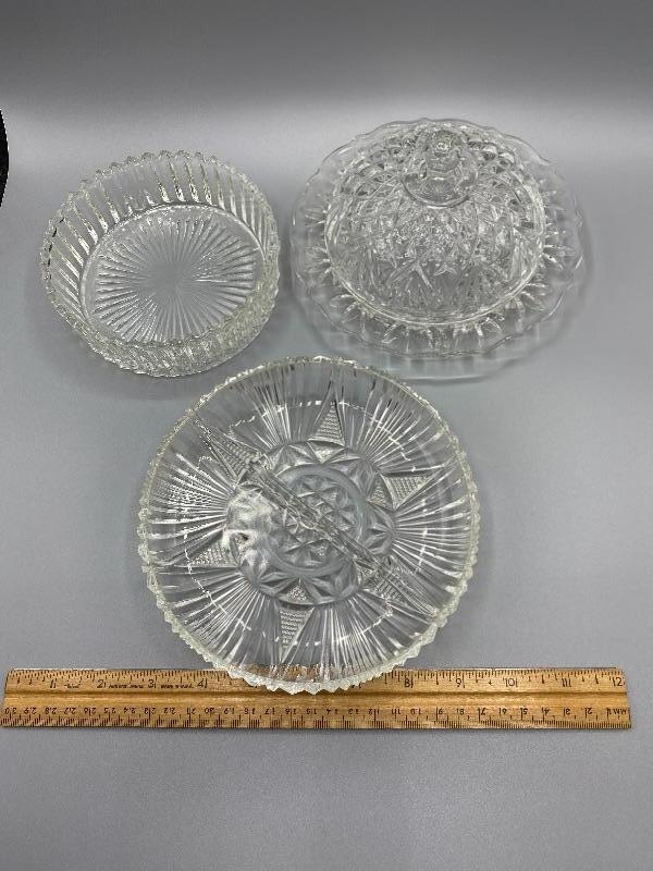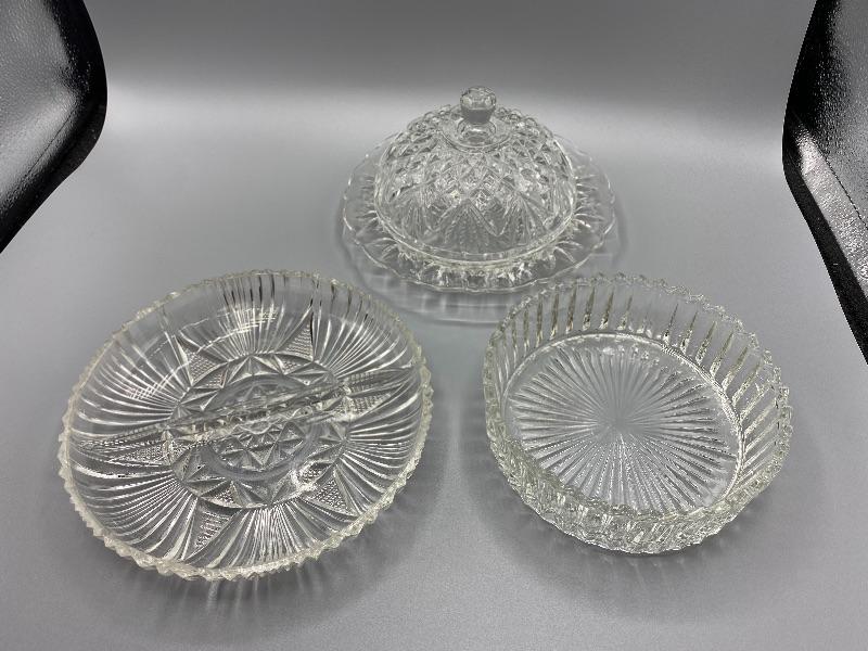 Three vintage glass serving pieces. Clear cut glass. Includes a lidded cheese/butter plate, divided round dish, and a shallow relish bowl. Good condition.