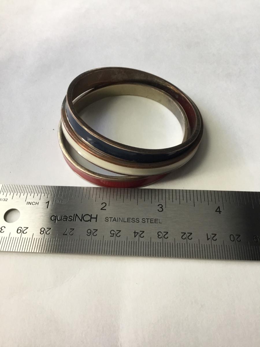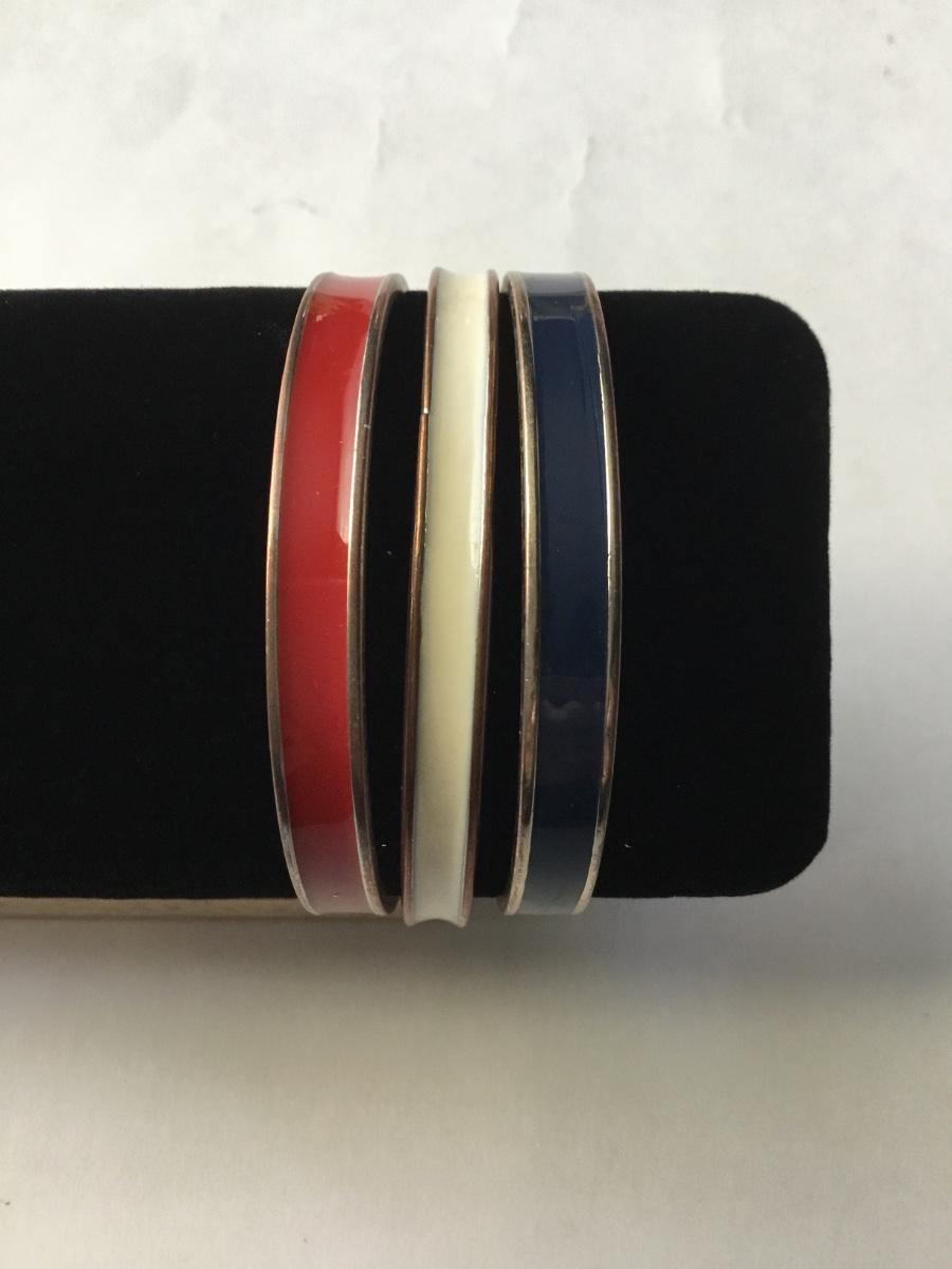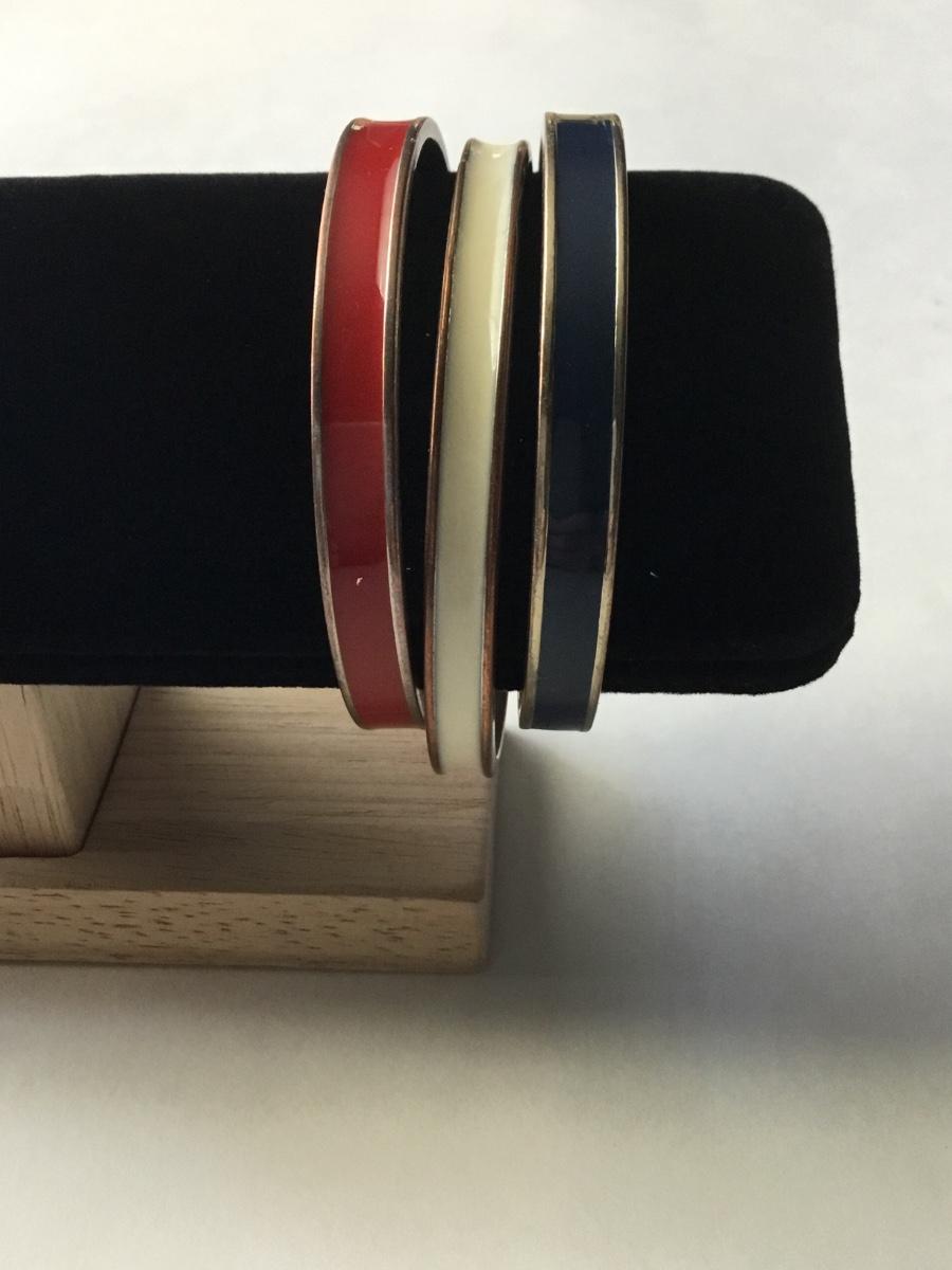 Three vintage gold tone plated red, white, and blue enamel hinged bangle bracelets