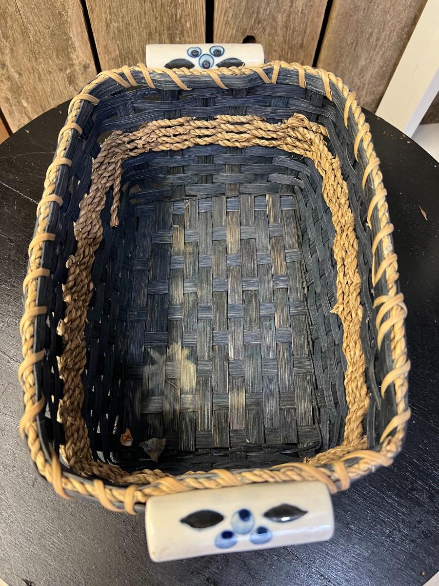 Rectangular navy blue porcelain handled handwoven basket