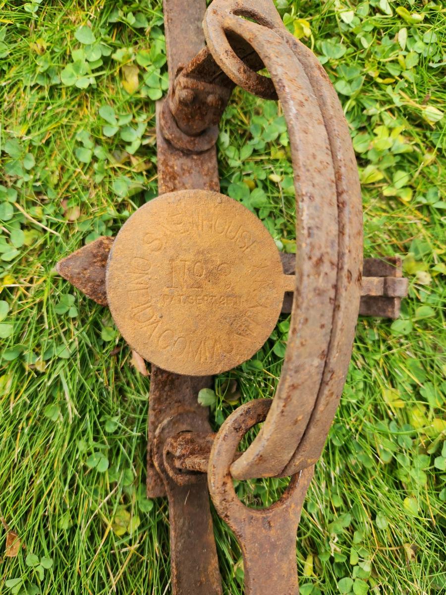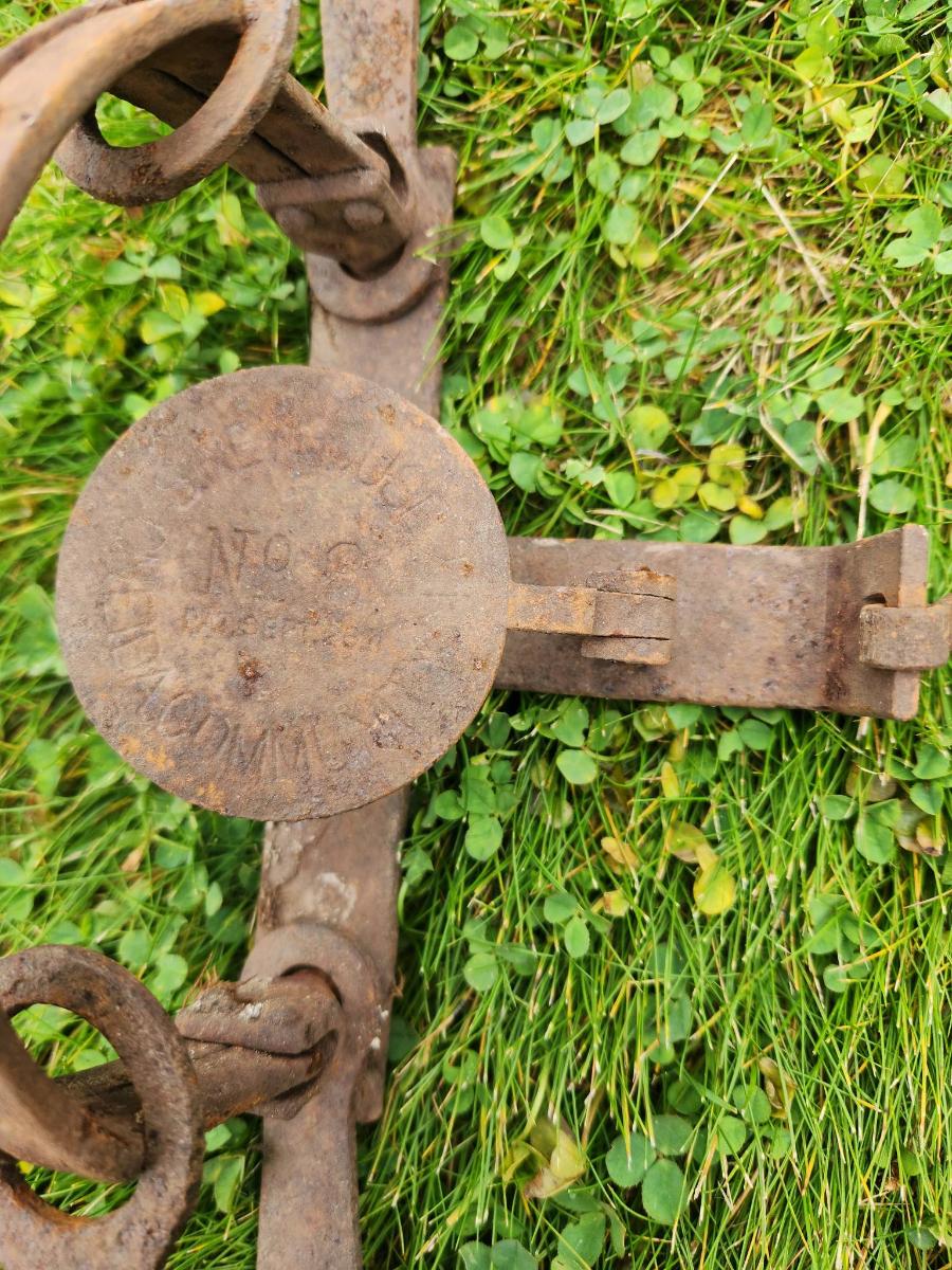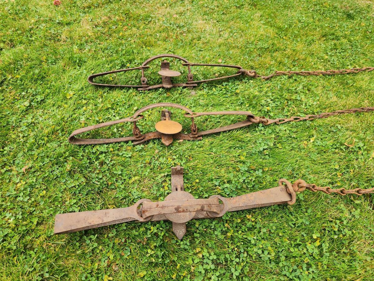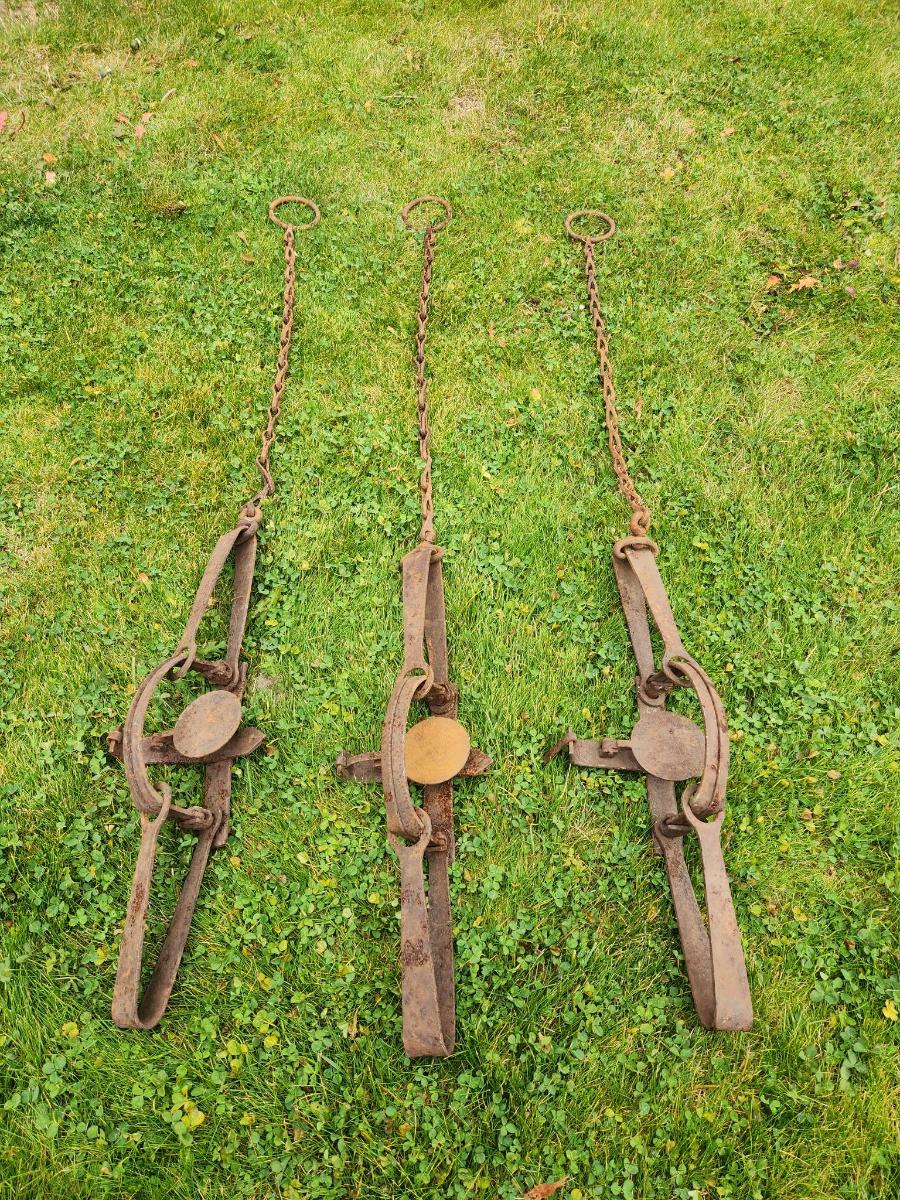 Three vintage iron animal traps featuring attached chains. Each trap is constructed from heavy iron and displays wear from age and use, including rust and patina. The design includes trigger mechanisms and stamped markings on the pressure plates, with faint text visible, though difficult to fully decipher. These units are likely collectible or display pieces.