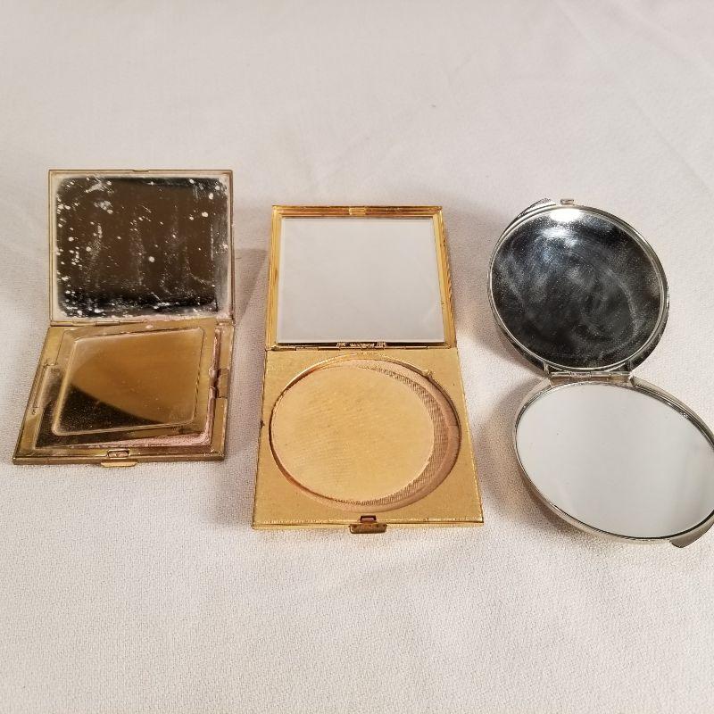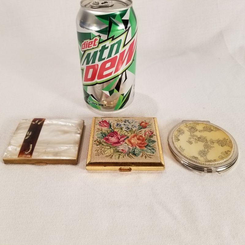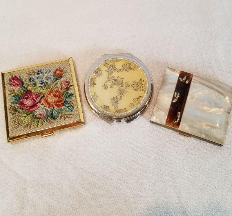 Vintage Ladies Compacts. One is brass with needlepoint face, mirror and powder inside. The second appears to be "bakelite" and mother of pearl with mirror and powder inside. The third is stainless with acrylic floral accent cover and a double mirror inside. Condition is good and consistent for the age of the three compacts.