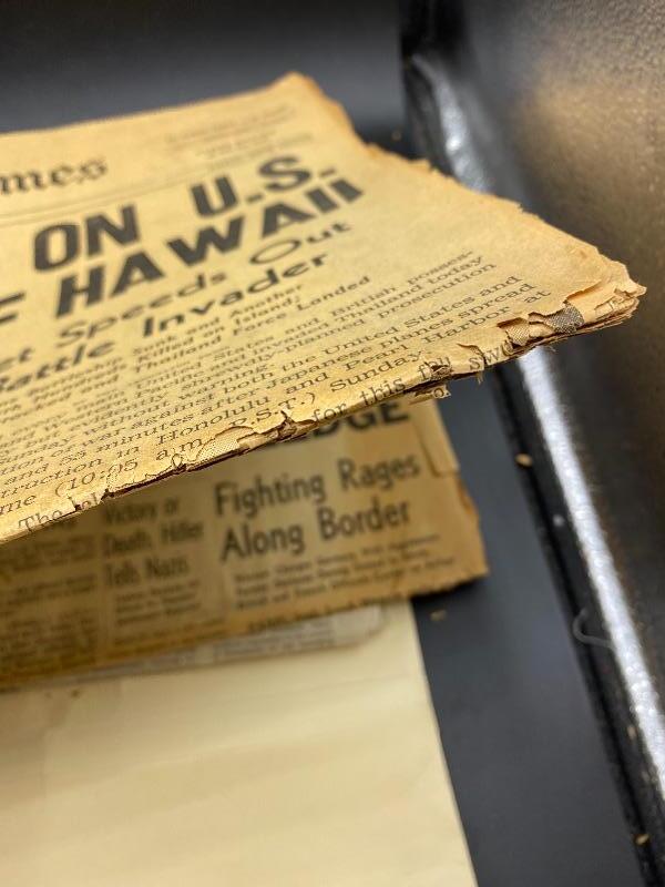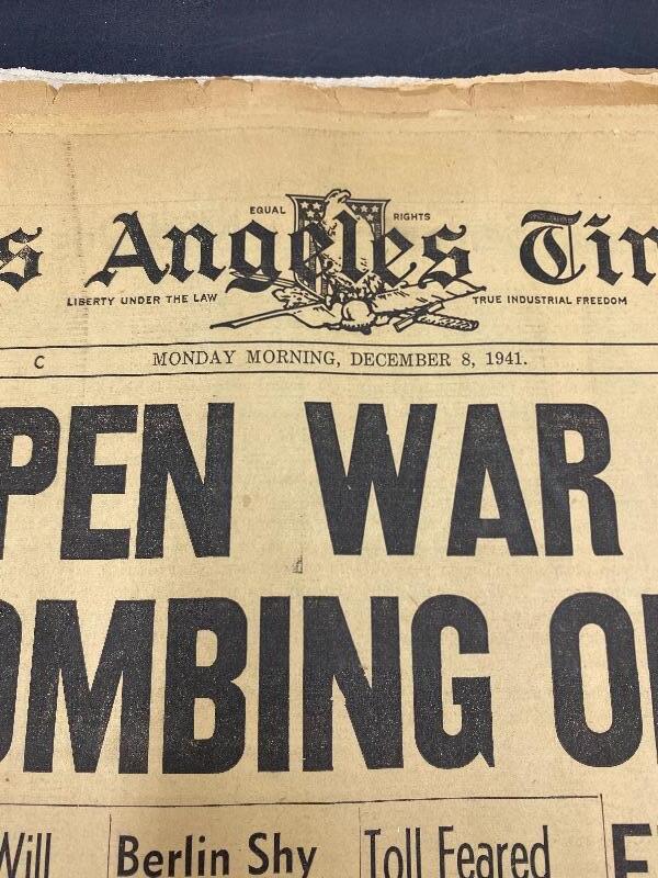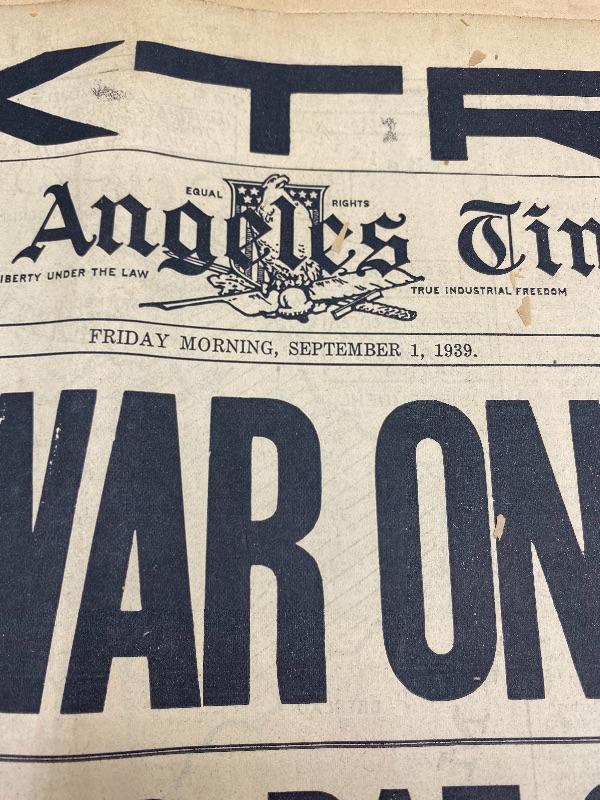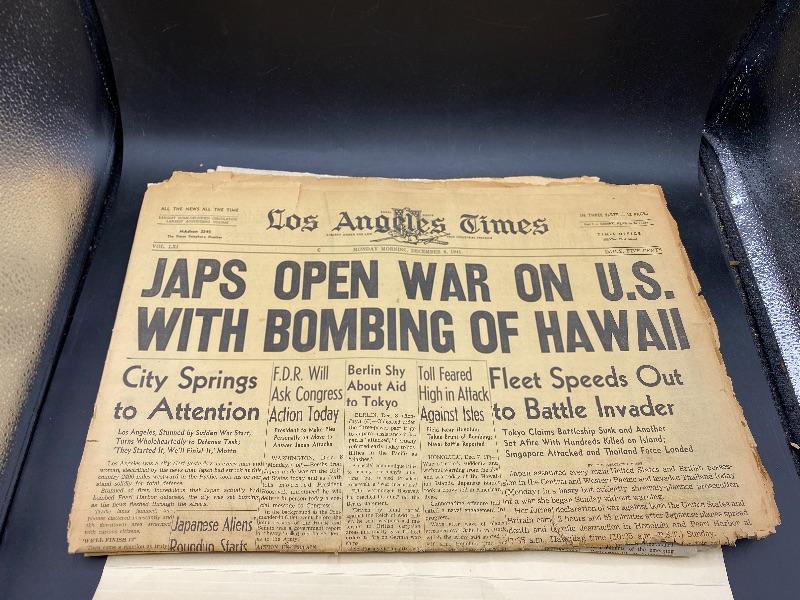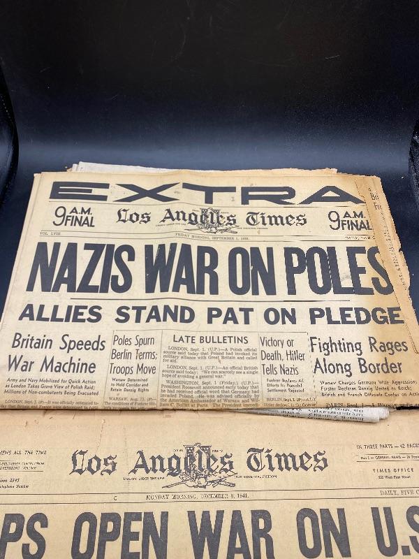 Set of 3 front page headlines from the Los Angeles Times. Front page sections. Headlines include Nazis War On Poles -September 1, 1939, Japs Open War on U.S. With Bombing of Hawaii - December 8, 1941, & Soviet Union Set To End Dec. 31 - December 18, 1991. The WWII papers have some wear along edges. All are in good frameable condition.