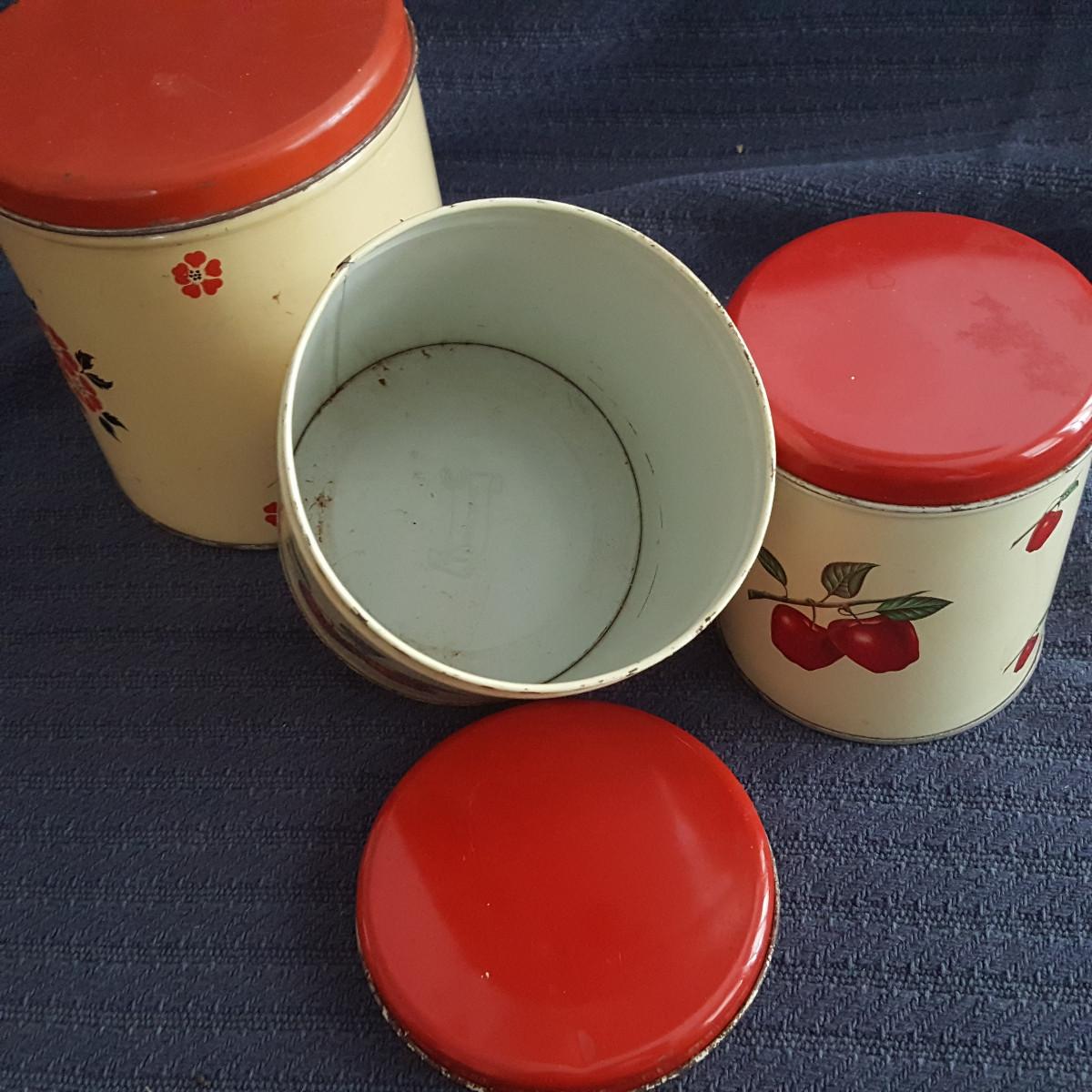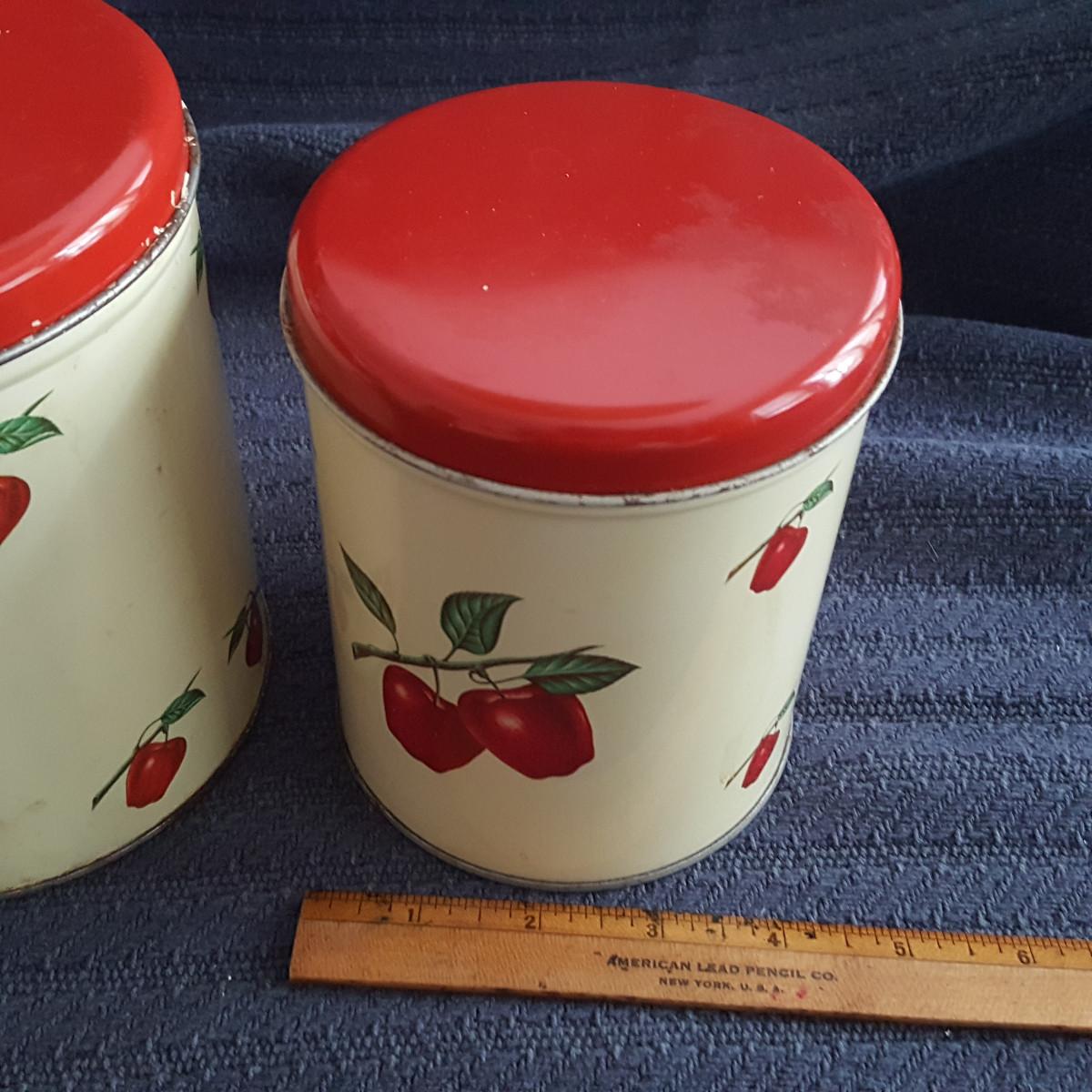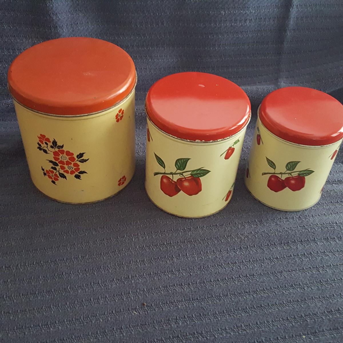 This auction lot is for 3 Vintage Metal Canisters. The set does not exactly match but has been used in this manner for years. The large canister has a diameter of about 6-inches and stands about 6.5-inches tall, the middle is about 5-inches and the smallest is about 4-inches. They have the appropriate small dents and bruises one would expect of items this age but the graphics are great. All are marked "Decorware" on the bottom. Where you gonna find 'em.