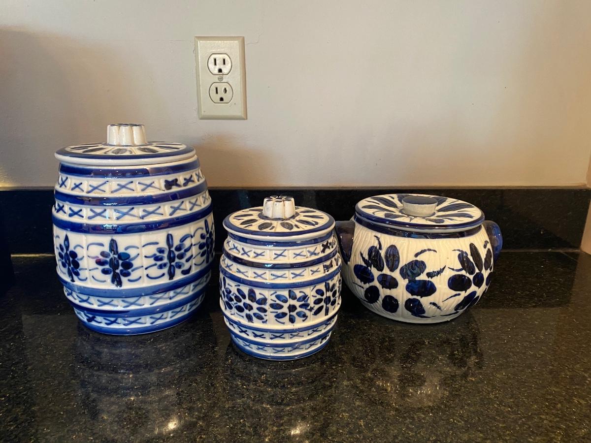 Three vintage porcelain covered canisters from Brazil. Approx 9h x 7dia (large); 6h x 5dia (small); 5-1/2h x 8dia (med). Exc condition