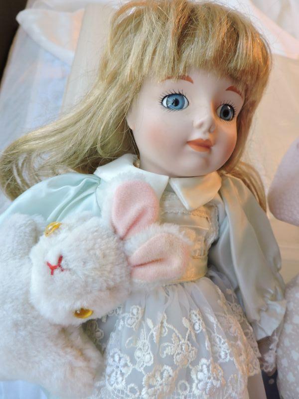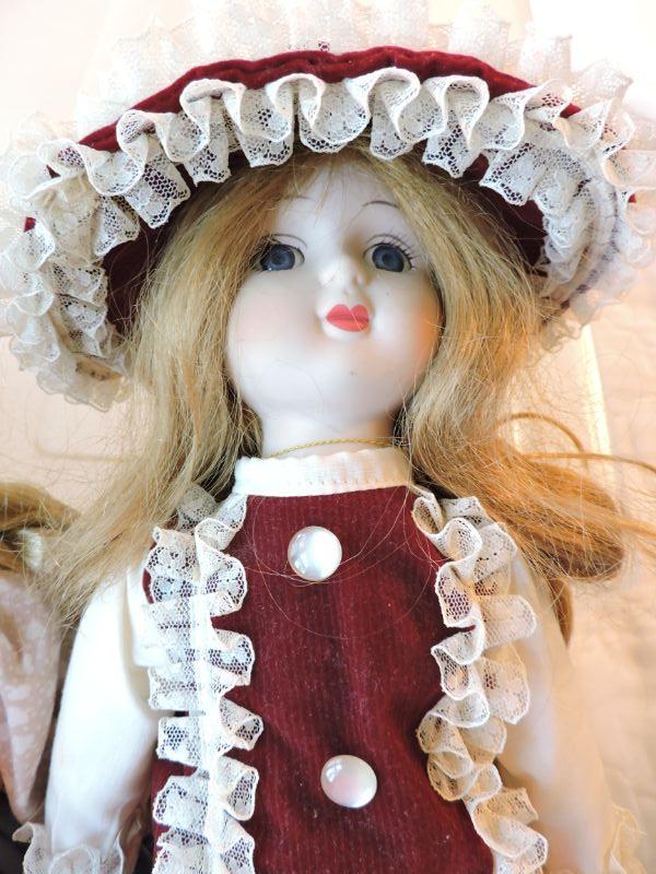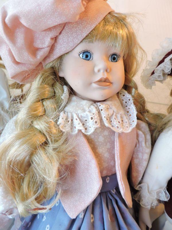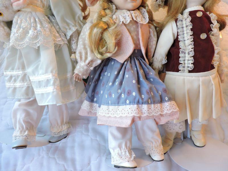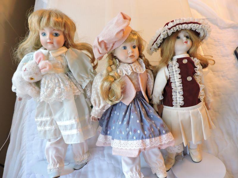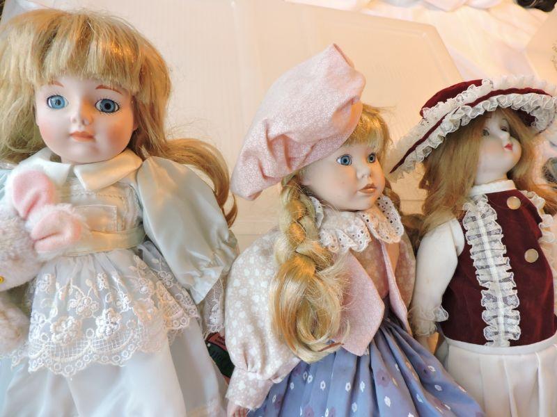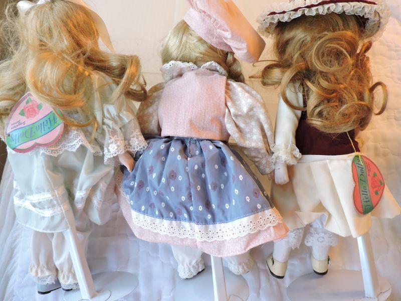 Porcelain dolls from early 1990's, including 2 Hello Dolly's. All with stands. **Please read Terms and Conditions before placing a bid. Pick up is Sunday, September 15, 2019 from 11am to 4pm and Tuesday, September 17 from 4pm-7pm in Sicklerville. All sales are final. All sales are as is, where is. Please review all photos. Any props included in photos are not included in listing. All measurements are approximate.