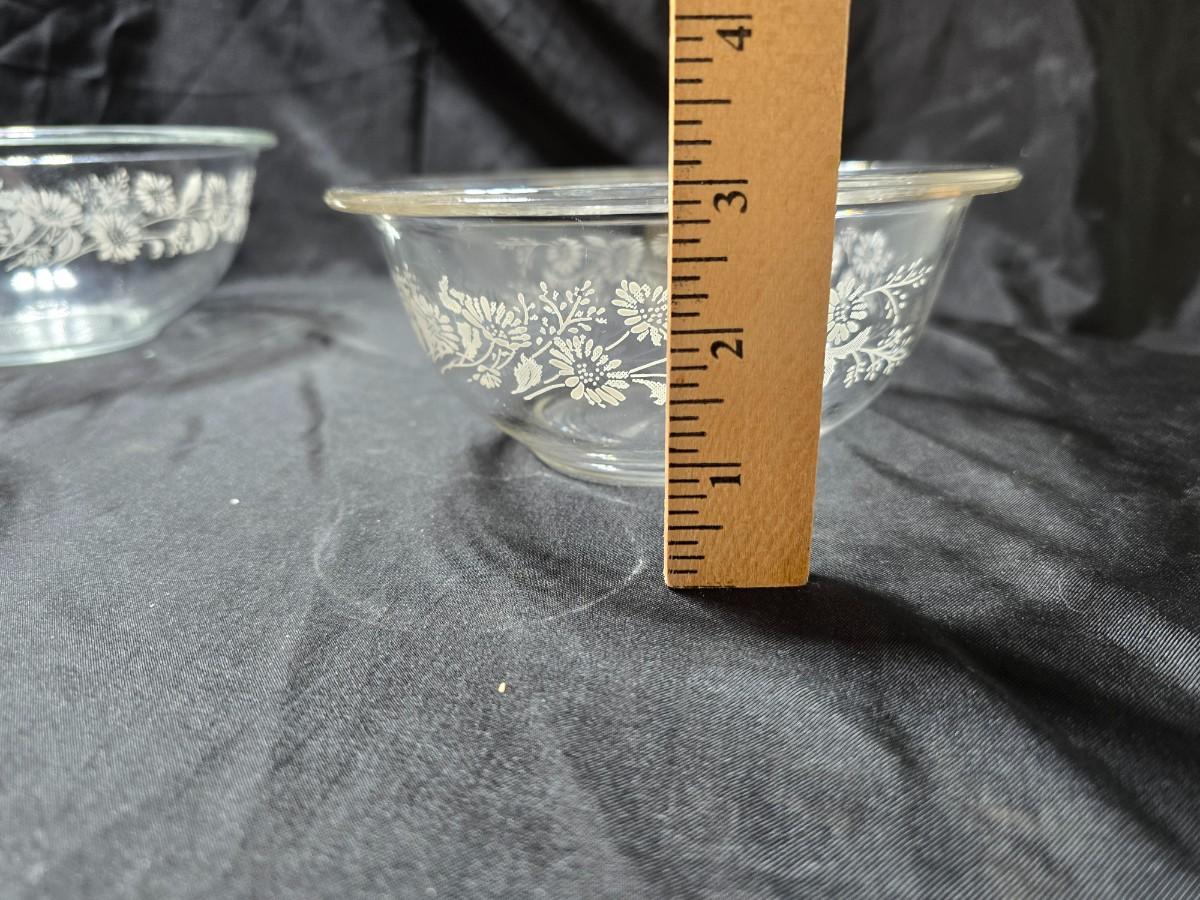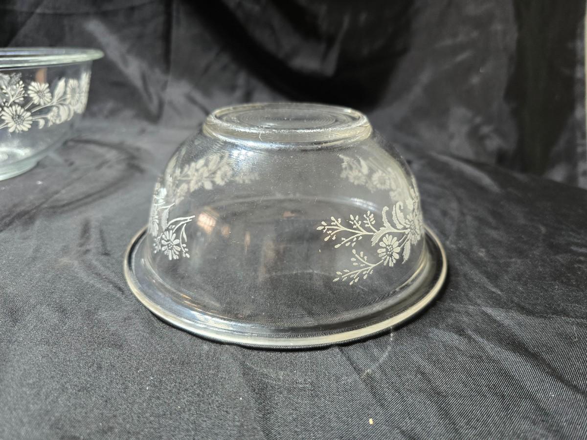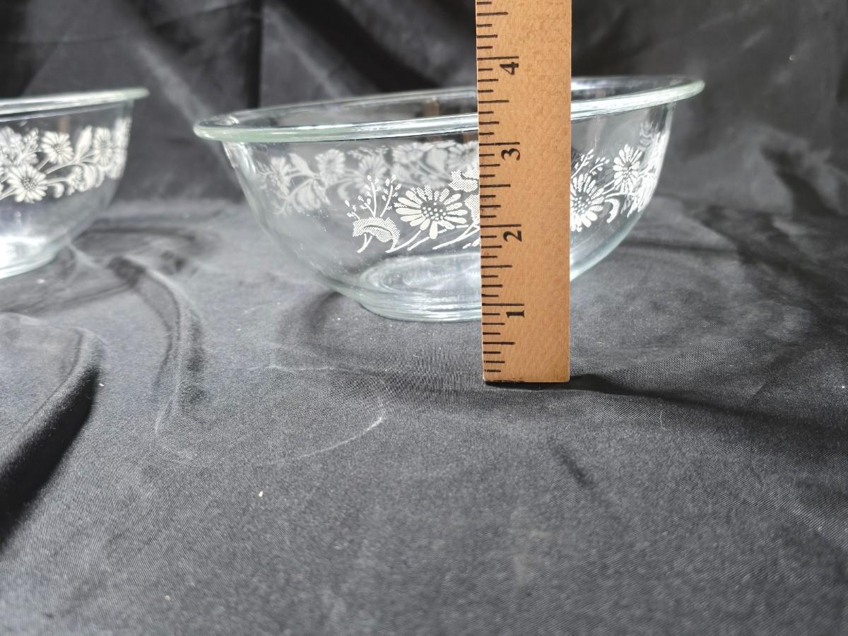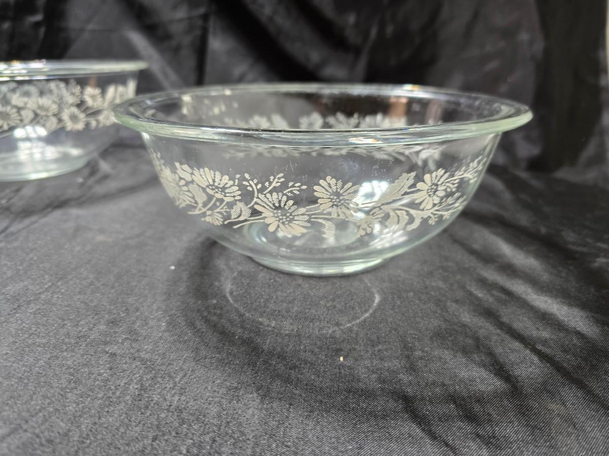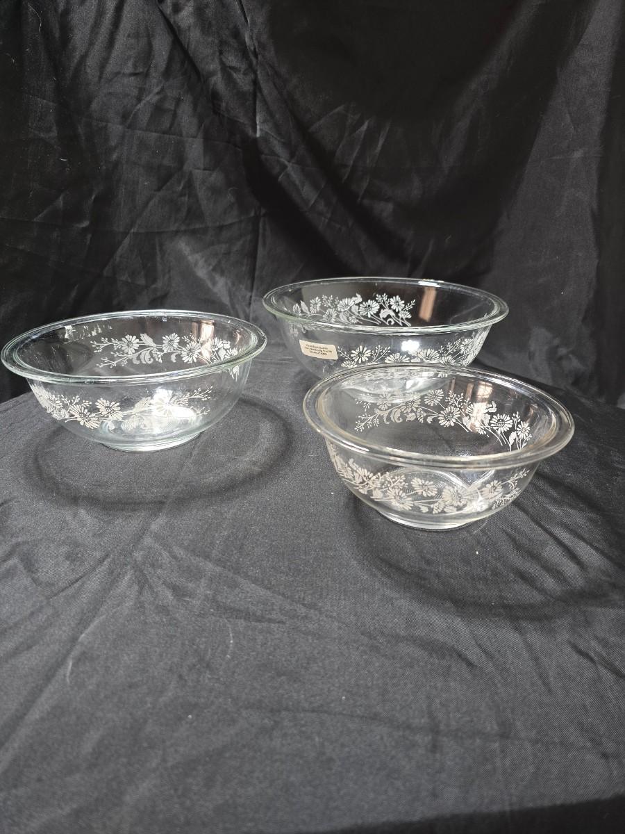Three vintage Pyrex clear glass nesting mixing bowls in the "Colonial Mist" or "White Lace" pattern.