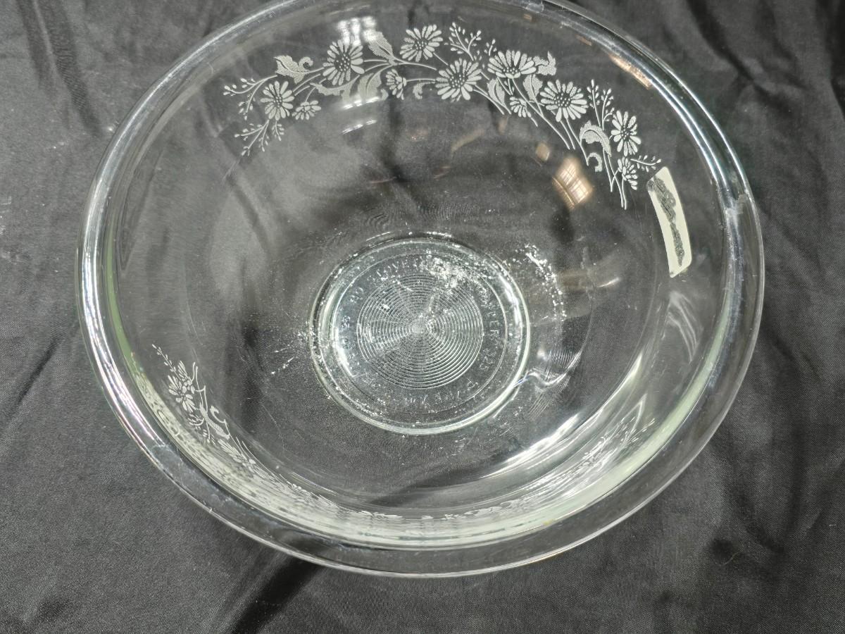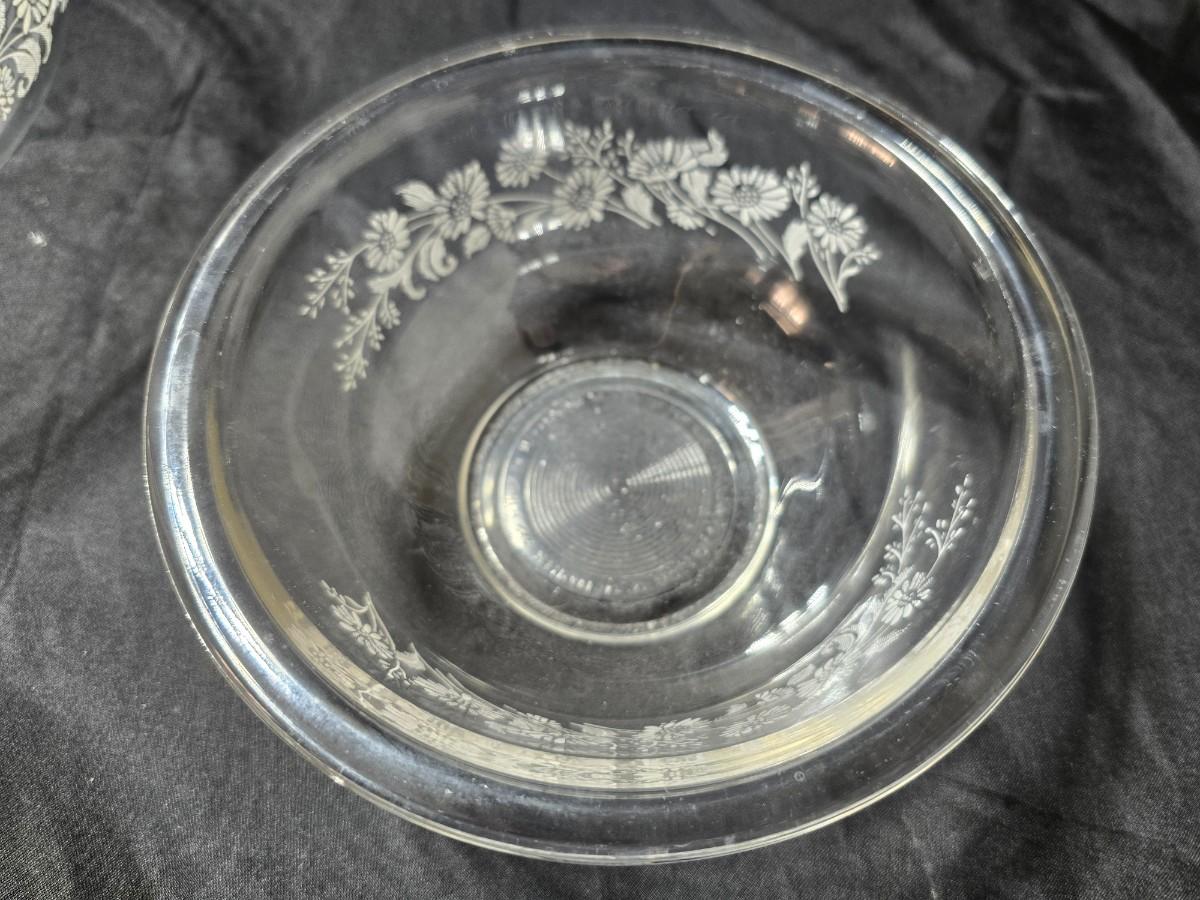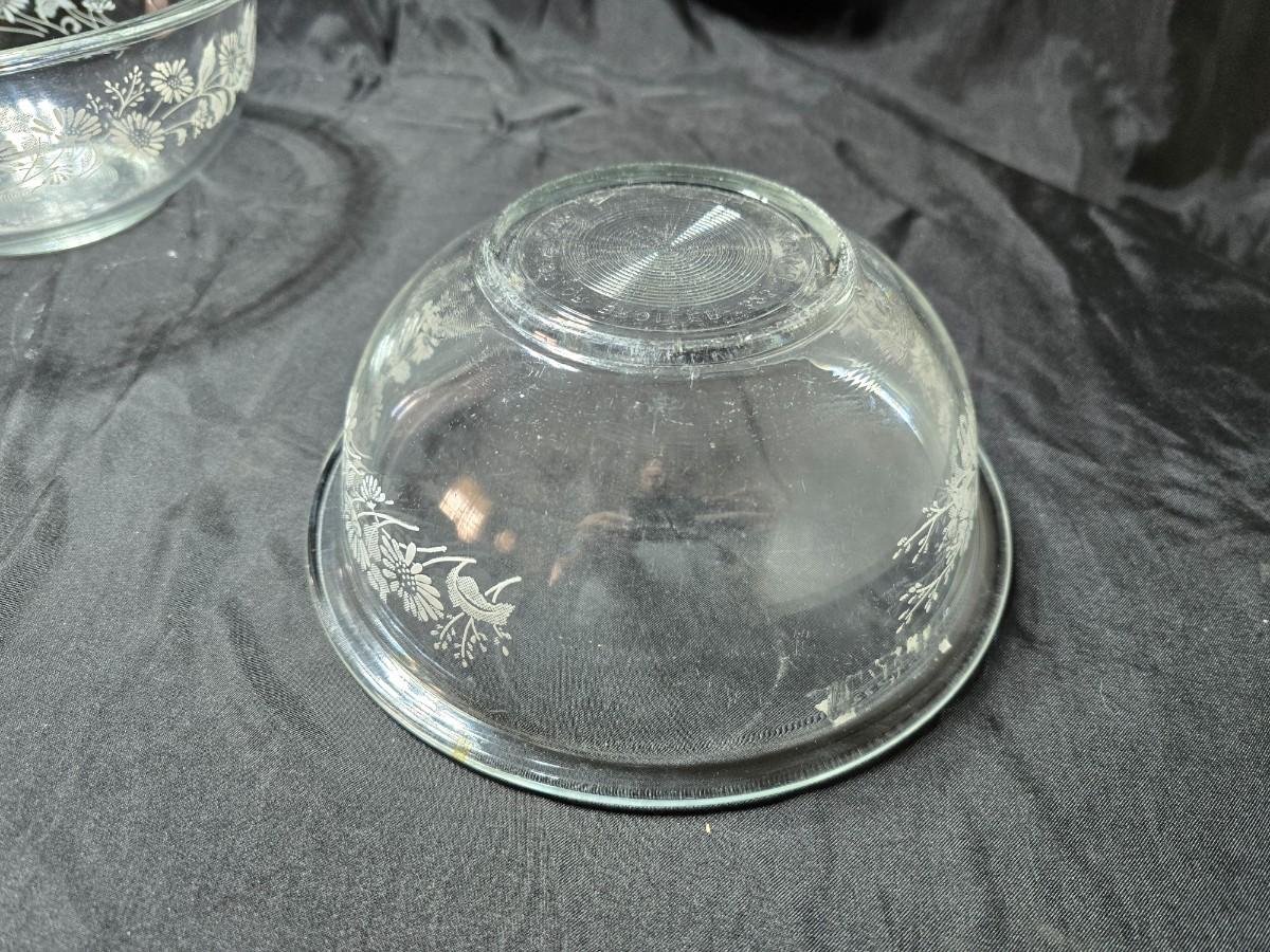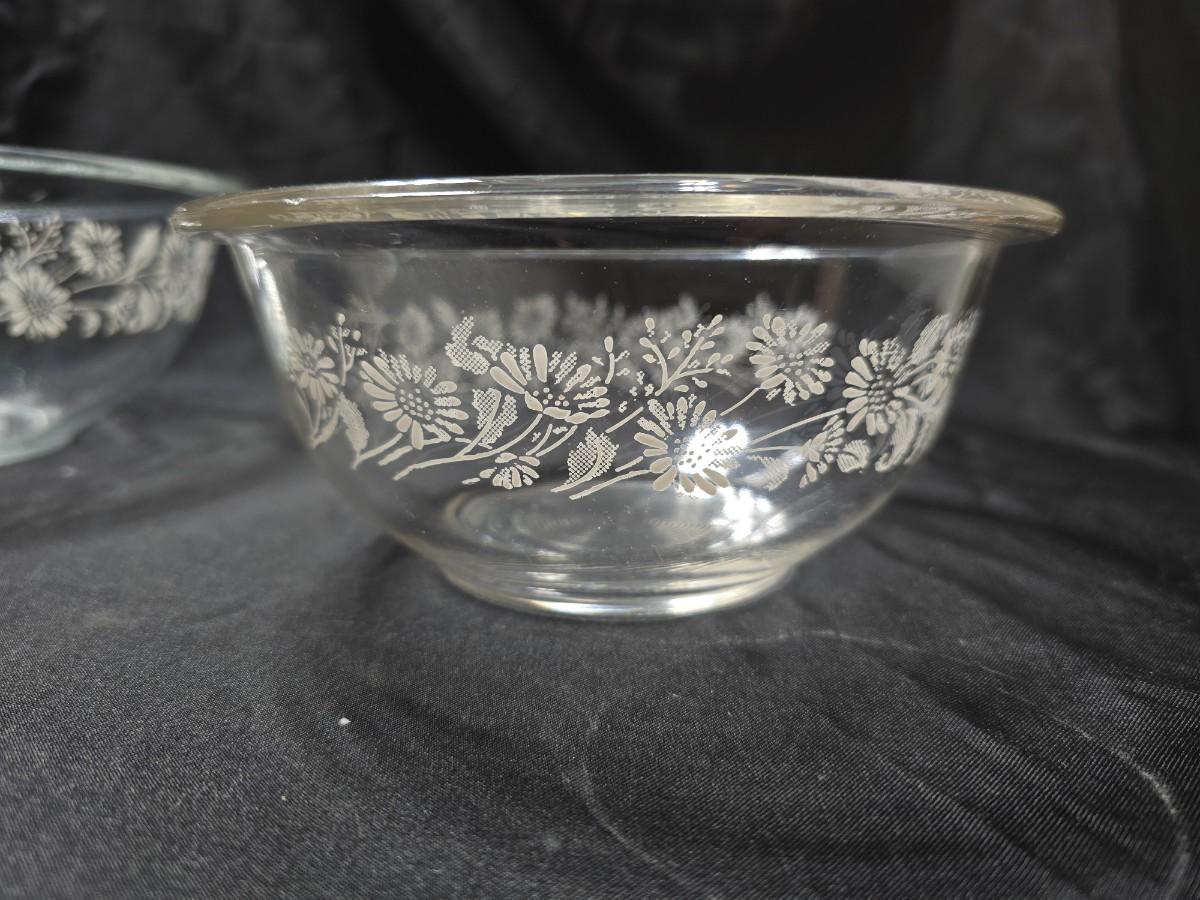 Three vintage Pyrex clear glass nesting mixing bowls in the "Colonial Mist" or "White Lace" pattern.