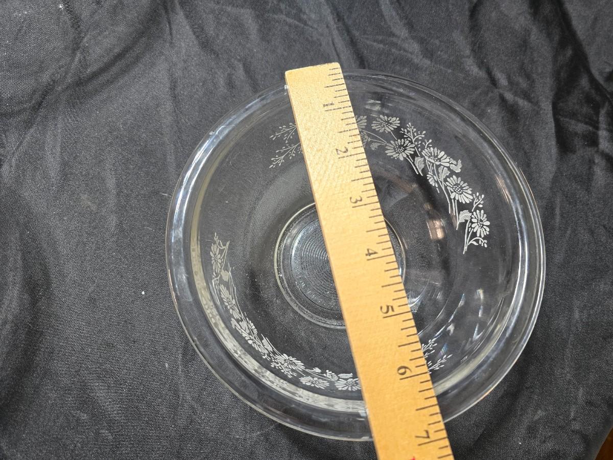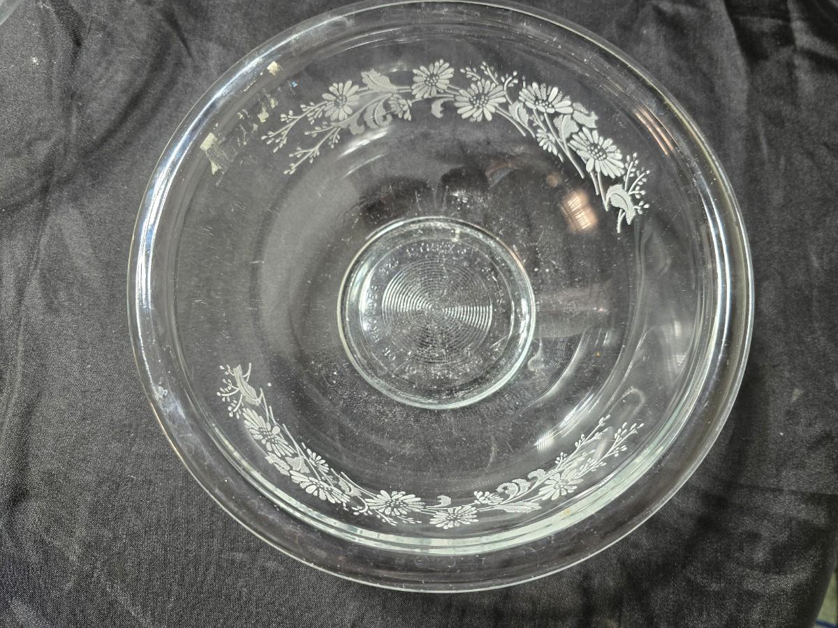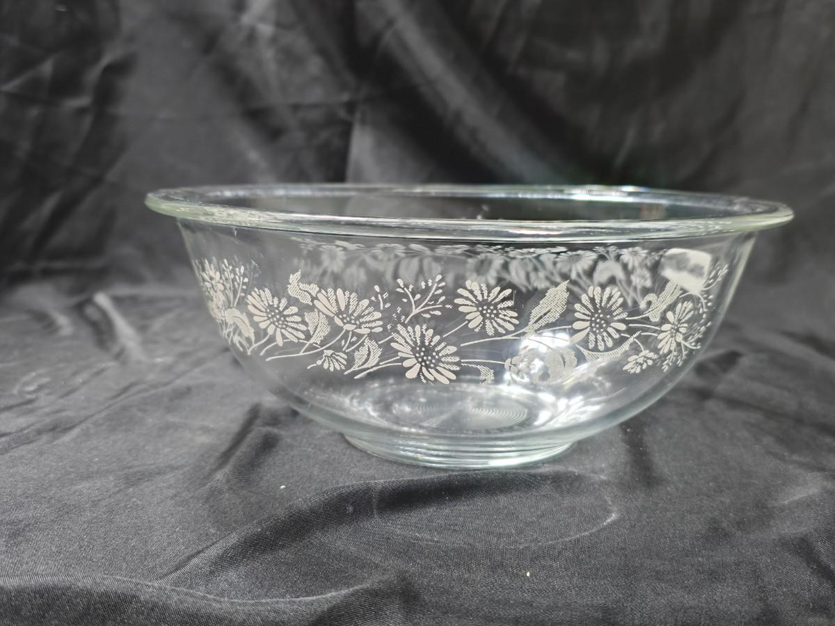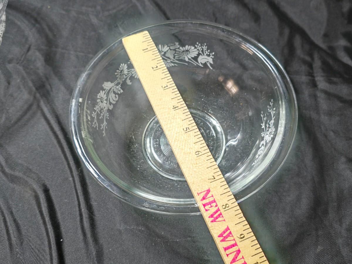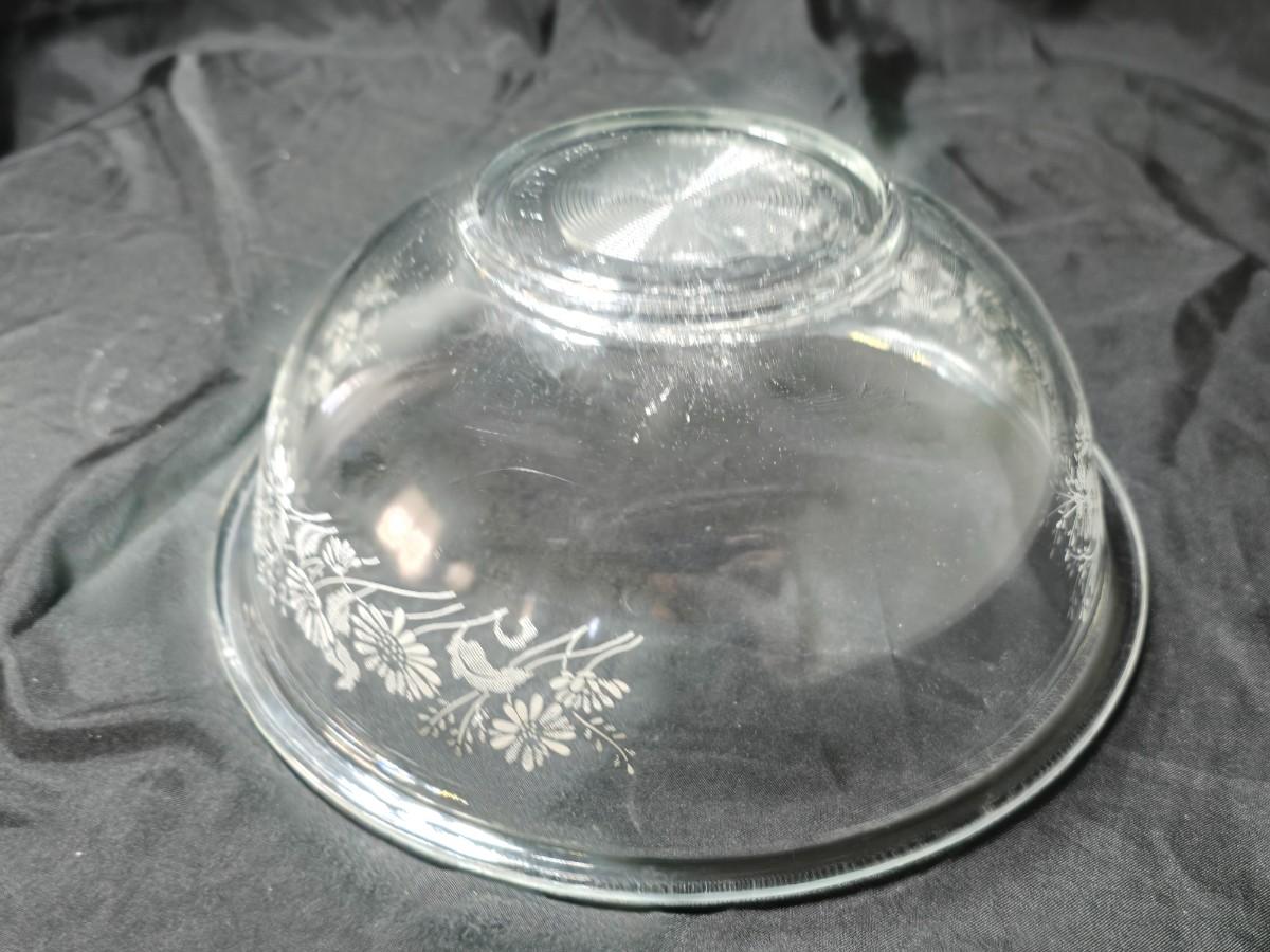 Three vintage Pyrex clear glass nesting mixing bowls in the "Colonial Mist" or "White Lace" pattern.
