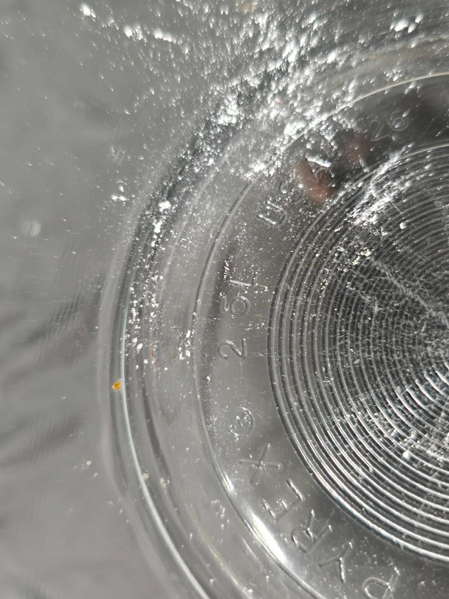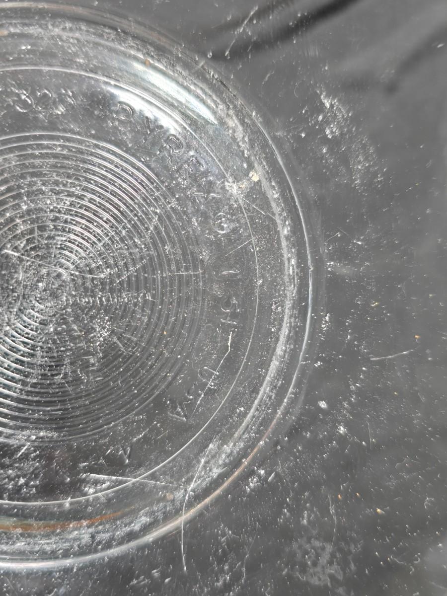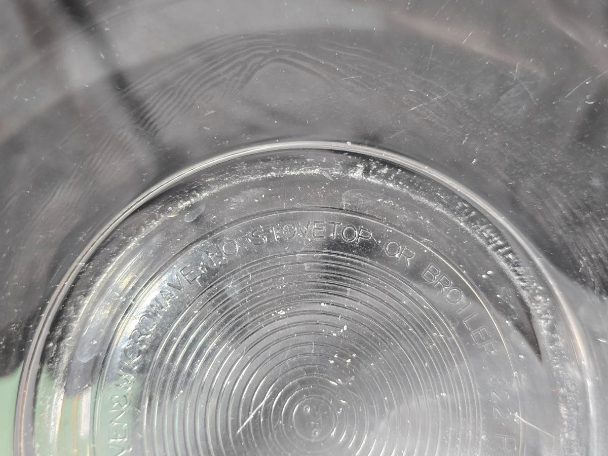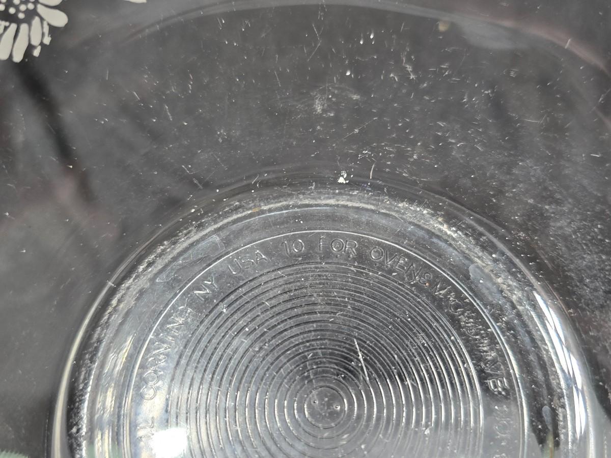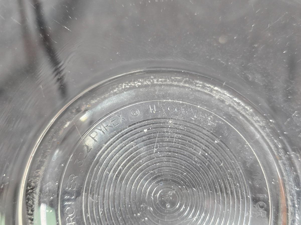 Three vintage Pyrex clear glass nesting mixing bowls in the "Colonial Mist" or "White Lace" pattern.