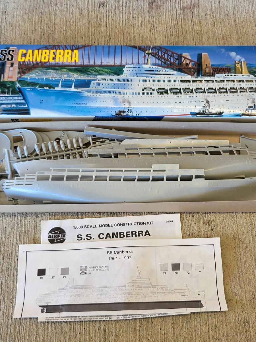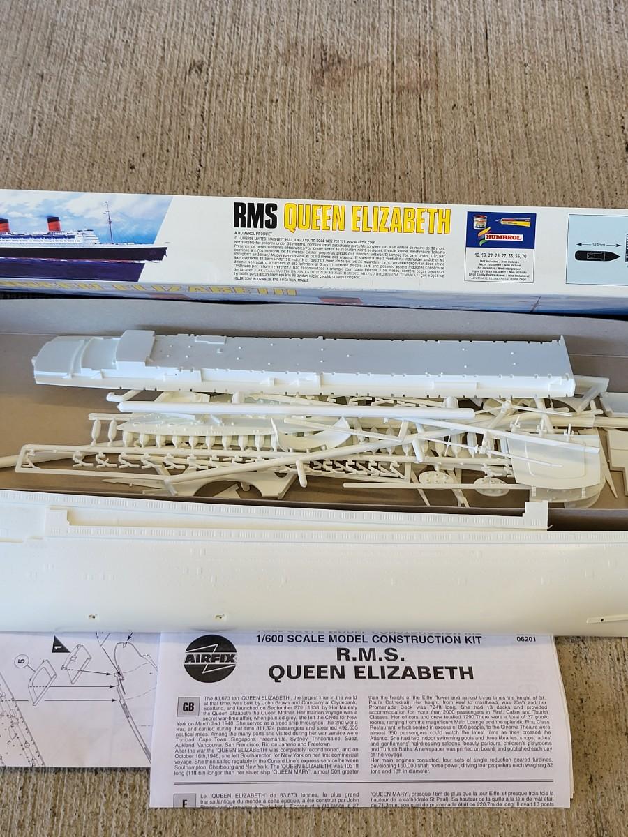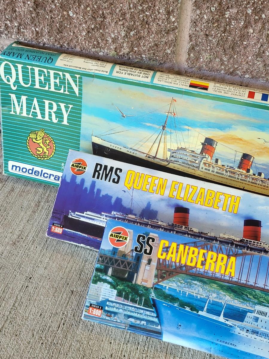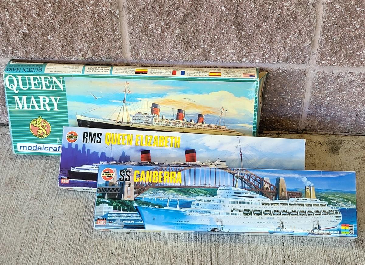 Three vintage DIY ship models. Modelcraft #600-001 Queen Mary. Airfix RMS Queen Elizabeth 1:600 scale. Airfix SS Canberra 1:600 scale. Boxes are open, unverified if complete, though pieces appear to be all there and ready for you to put together. Shipping not available on this item.