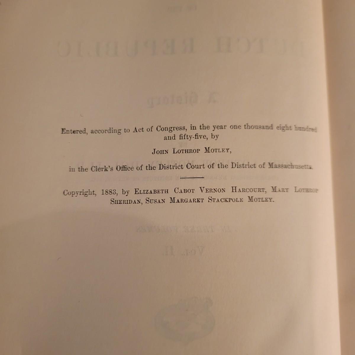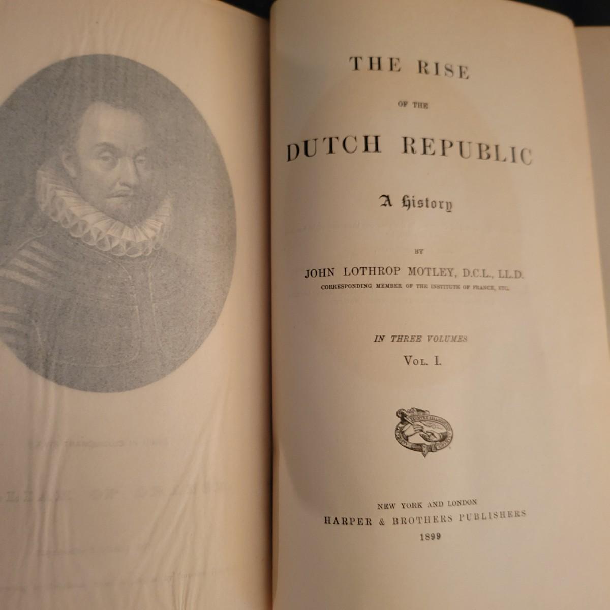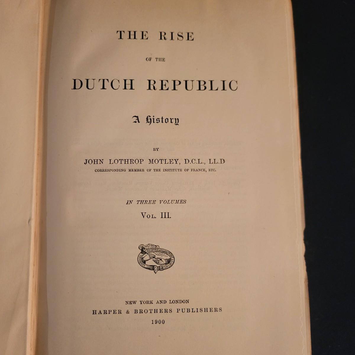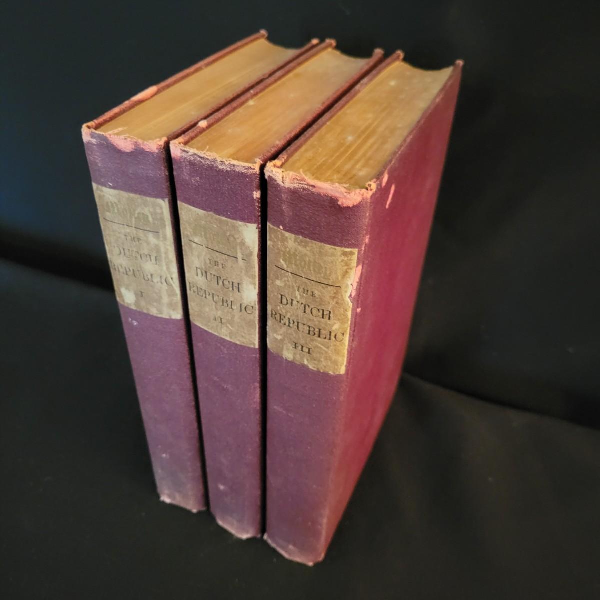 A three volume set titled "The Rise of the Dutch Republic" written by John Lothrop Motley and published by Harper and Brothers Publishers in 1899 and 1900. These books have some damaged edges on the covers, see attached pictures for more detail. Shipping available
