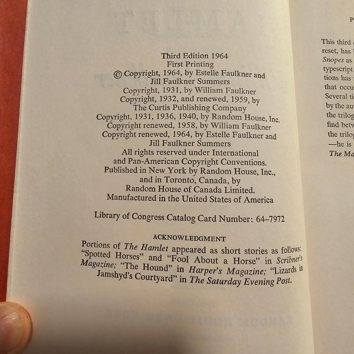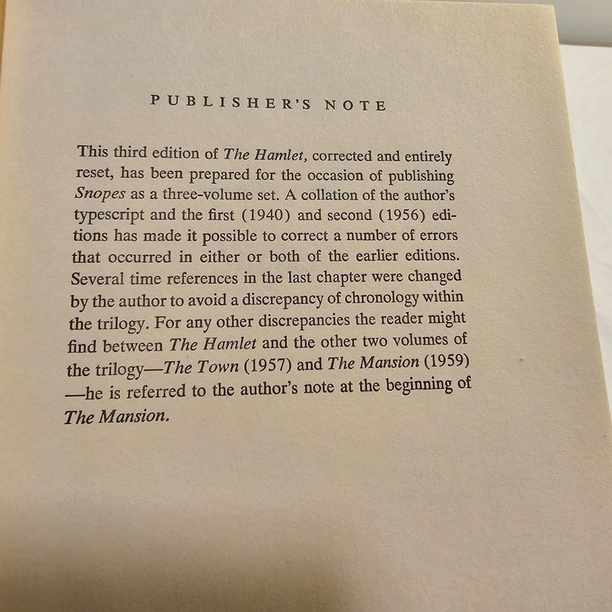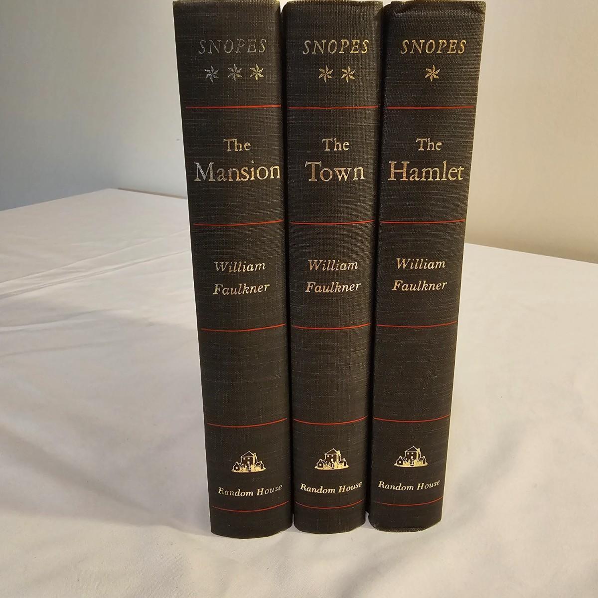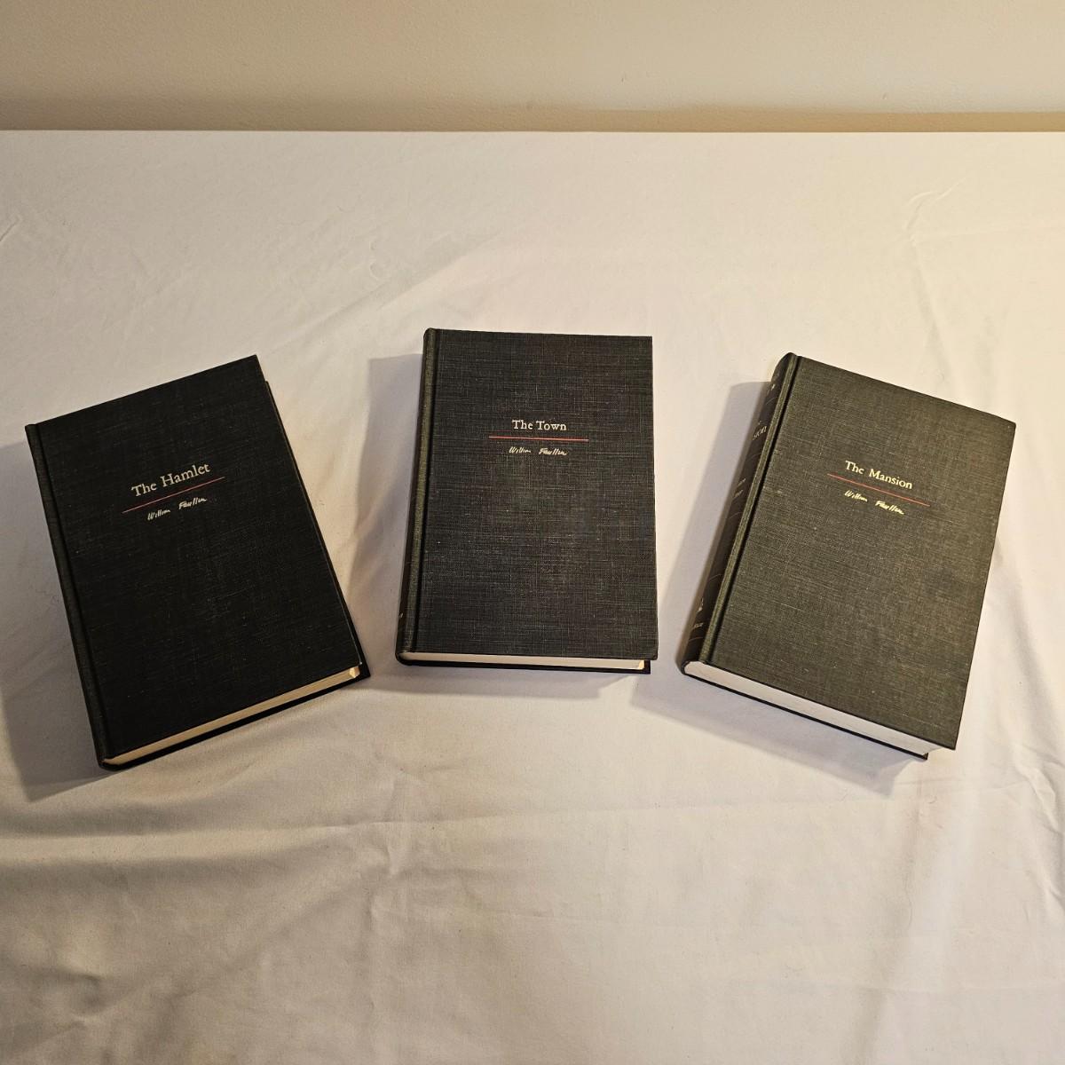 Hardbound set of the Snopes trilogy by William Faulkner, including 'The Hamlet', 'The Town', and 'The Mansion'. Shipping available.