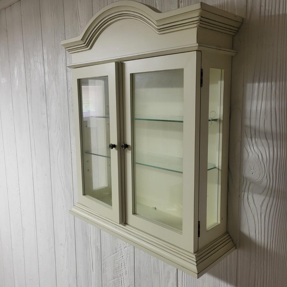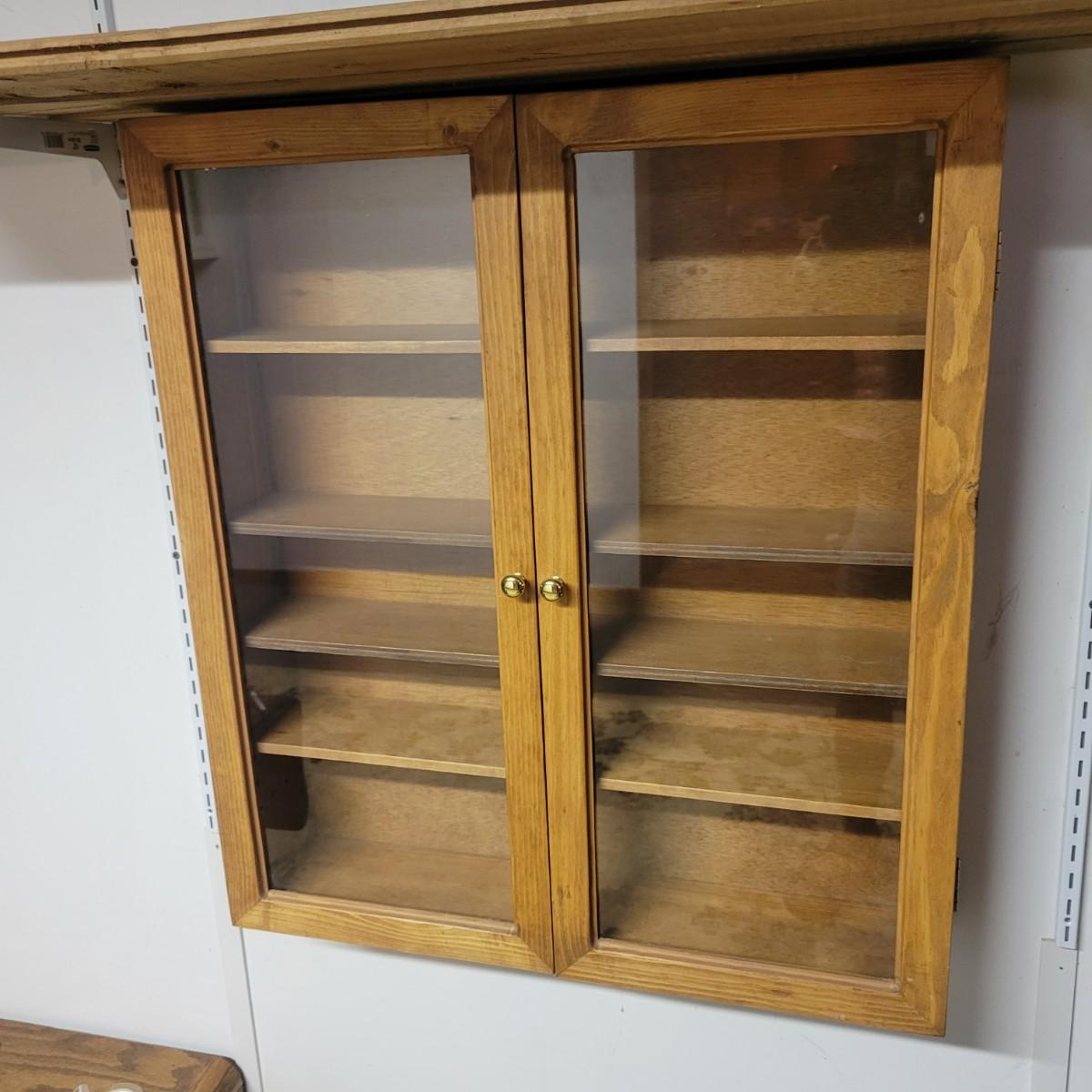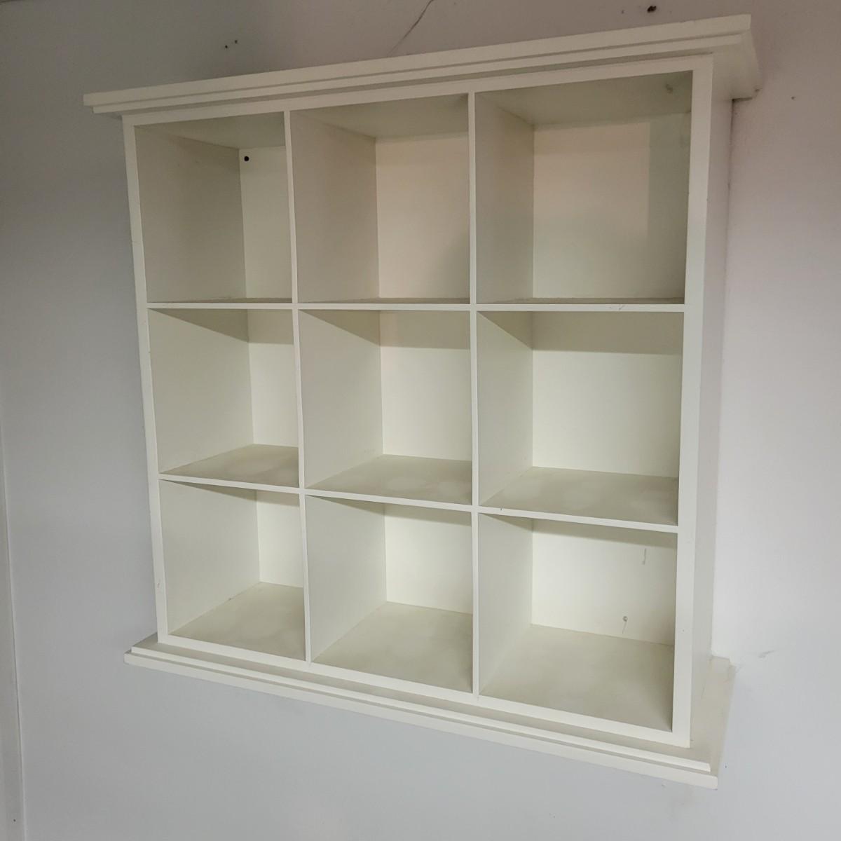 A lot of an assortment of different wall mounted display cabinets. One cabinet is white with glass doors and two adjustable glass shelves. Cabinet measures approximately 21.5" x 25.5" x 7". Pieces are screwed to a wall and will need to be removed by winning bidder. The second cabinet is made of wood, has two glass doors and 4 adjustable shelves. This cabinet measures approximately 24.5" x 28" x 5.5". The final cabinet is Wooden and painted white, with 9 equal openings and no doors. This piece measures approximately 20.5" x 20" x 7" Local pickup only