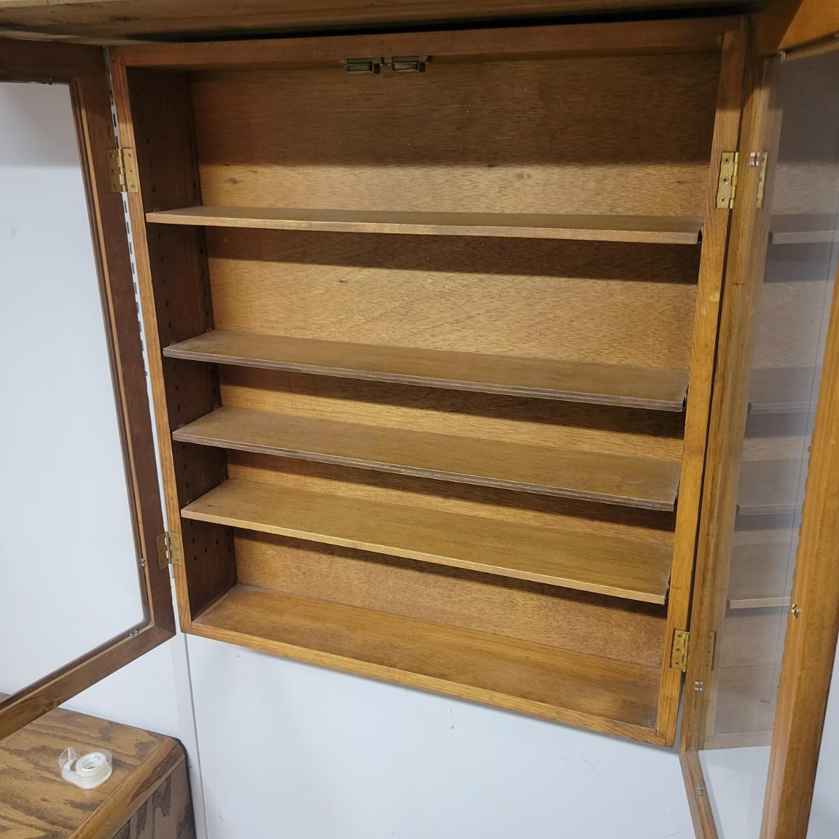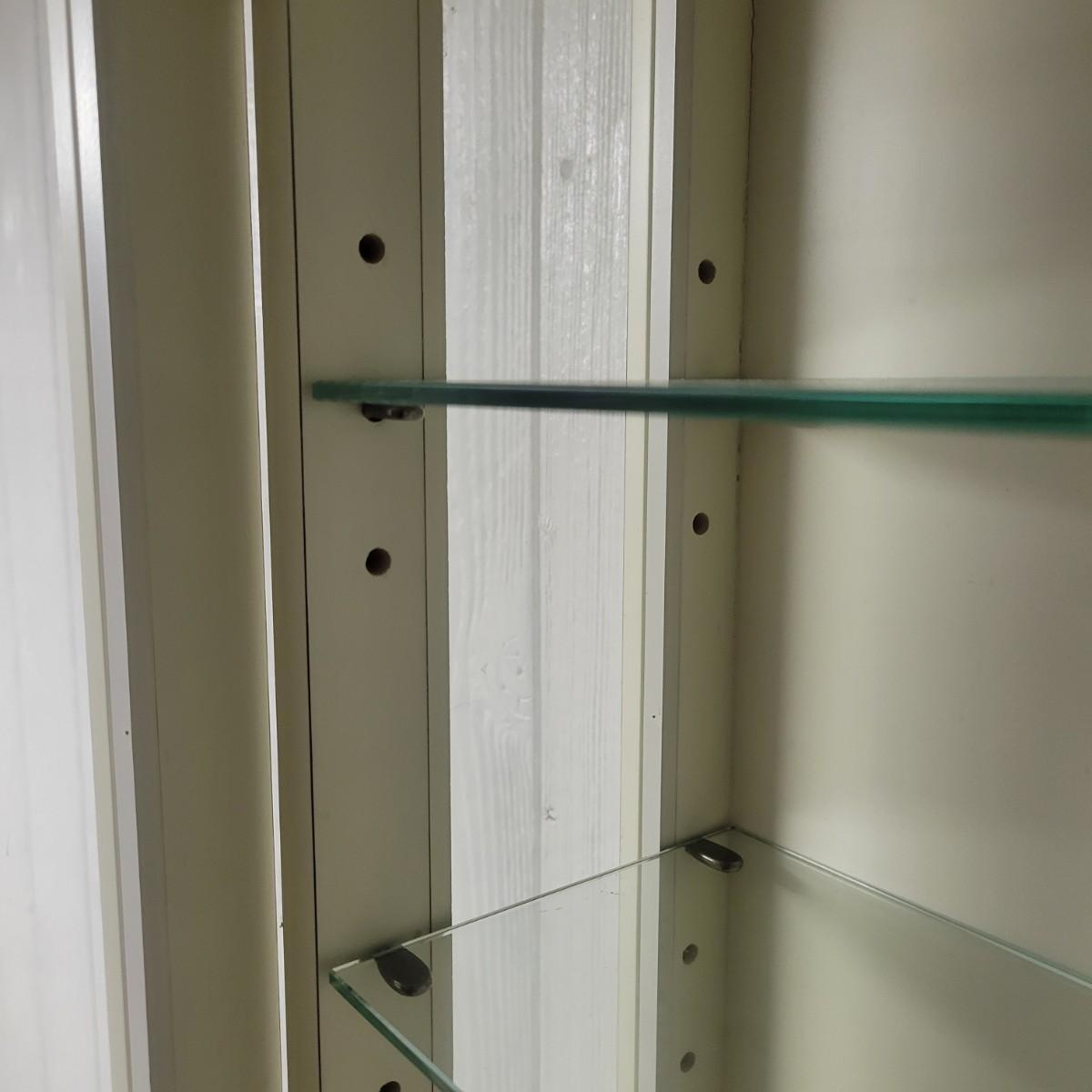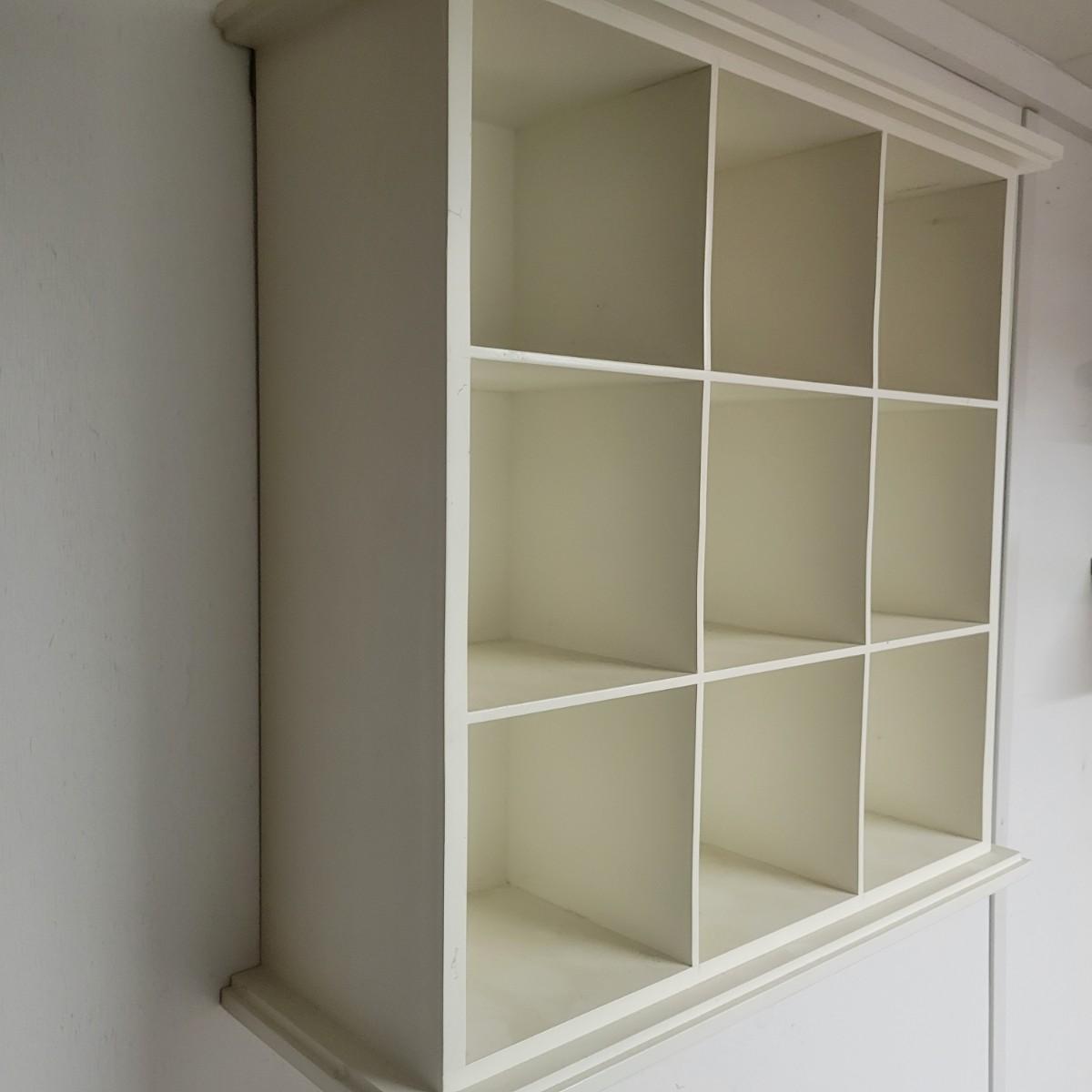 A lot of an assortment of different wall mounted display cabinets. One cabinet is white with glass doors and two adjustable glass shelves. Cabinet measures approximately 21.5" x 25.5" x 7". Pieces are screwed to a wall and will need to be removed by winning bidder. The second cabinet is made of wood, has two glass doors and 4 adjustable shelves. This cabinet measures approximately 24.5" x 28" x 5.5". The final cabinet is Wooden and painted white, with 9 equal openings and no doors. This piece measures approximately 20.5" x 20" x 7" Local pickup only