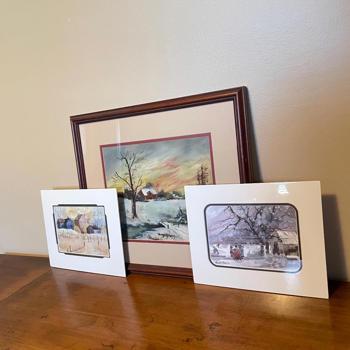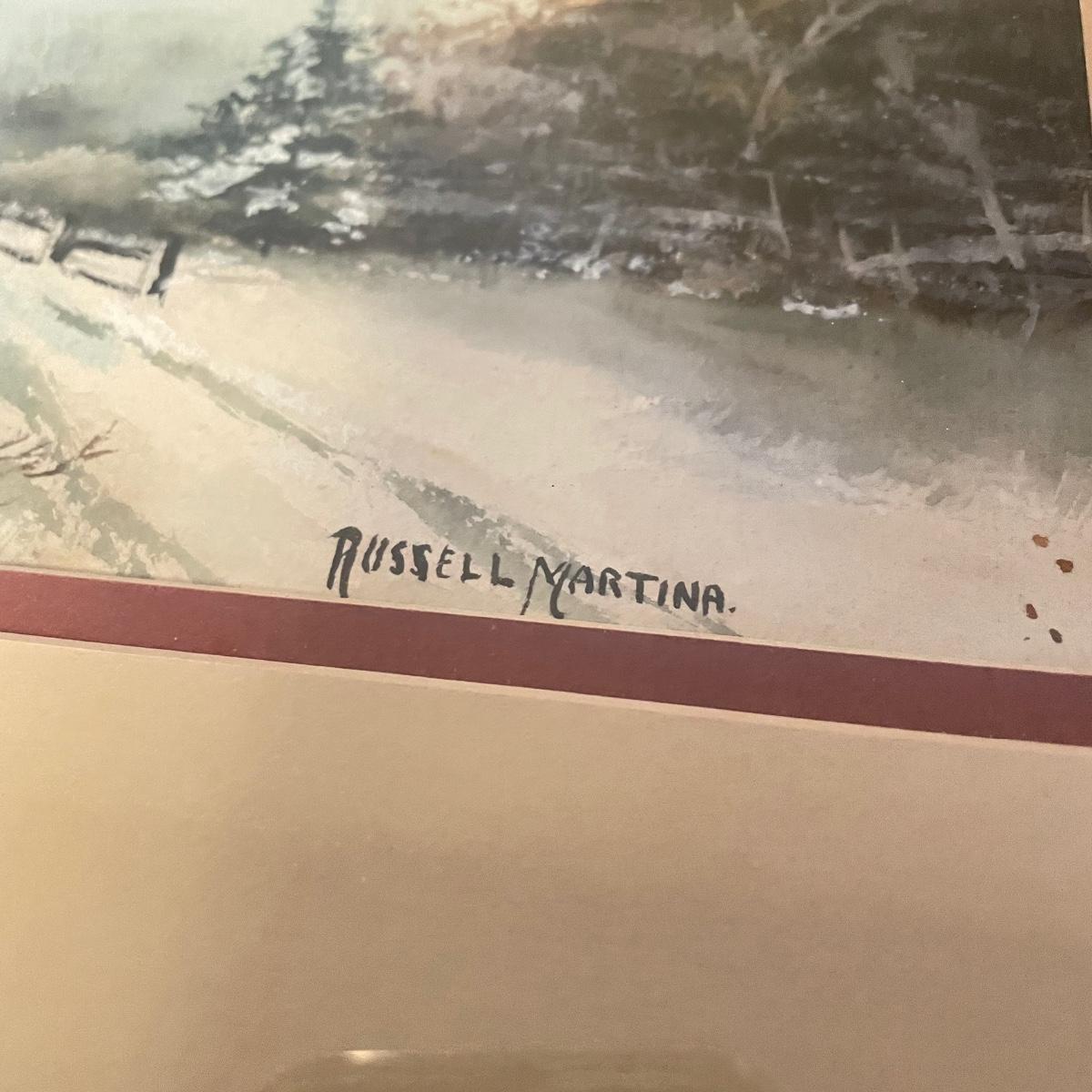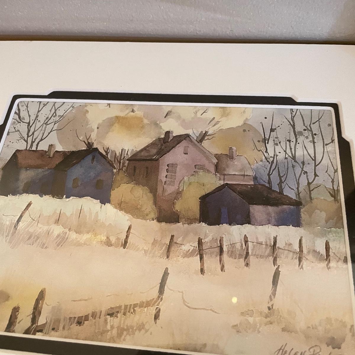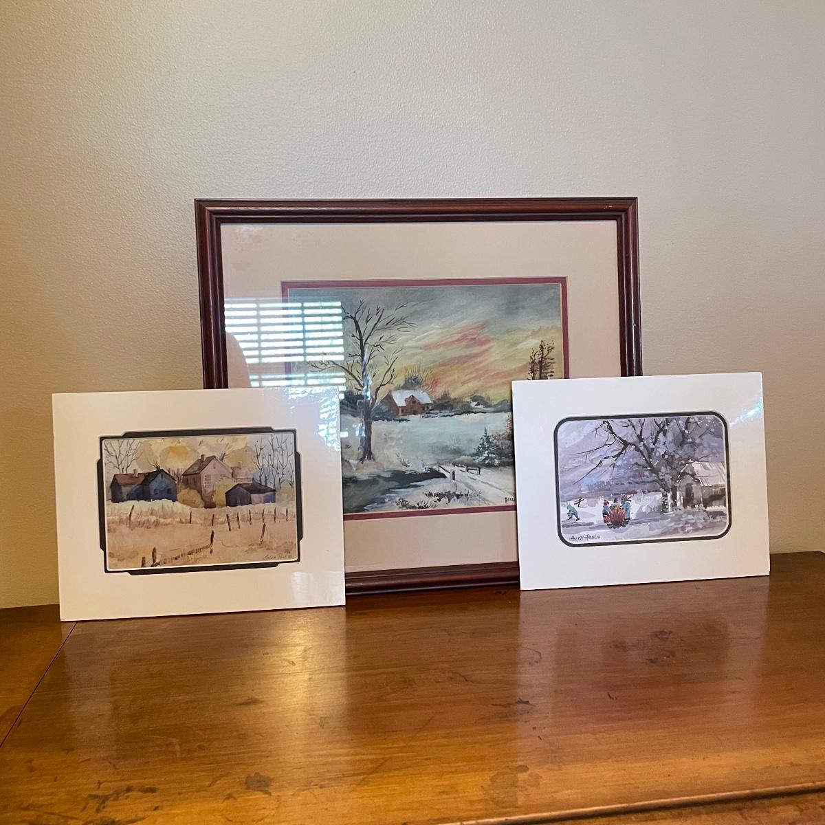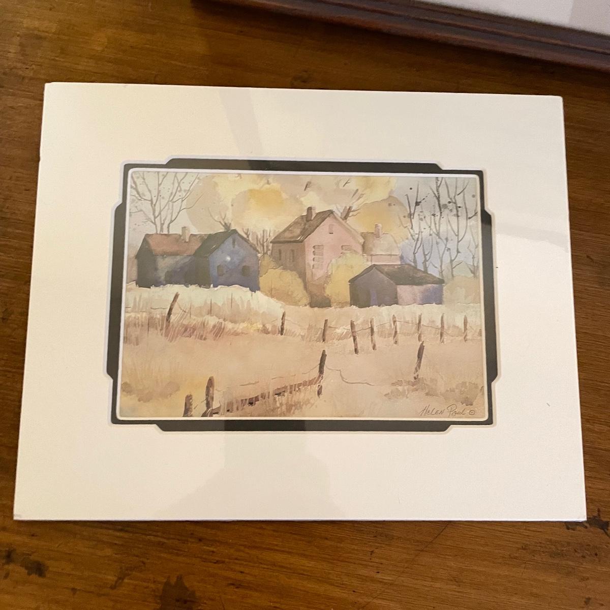 Two small watercolor prints signed Helen Paul (c). Each of the art is behind thick matting and wrapping in plastic. The larger framed piece is behind glass and signed Russell Martina. The wooden frame measures 16.75” x 14.75”. See images. Shipping available. Please call UPS with dimensions at 828-252-6930 for a shipping quote prior to bidding.