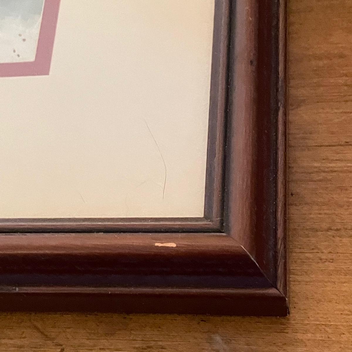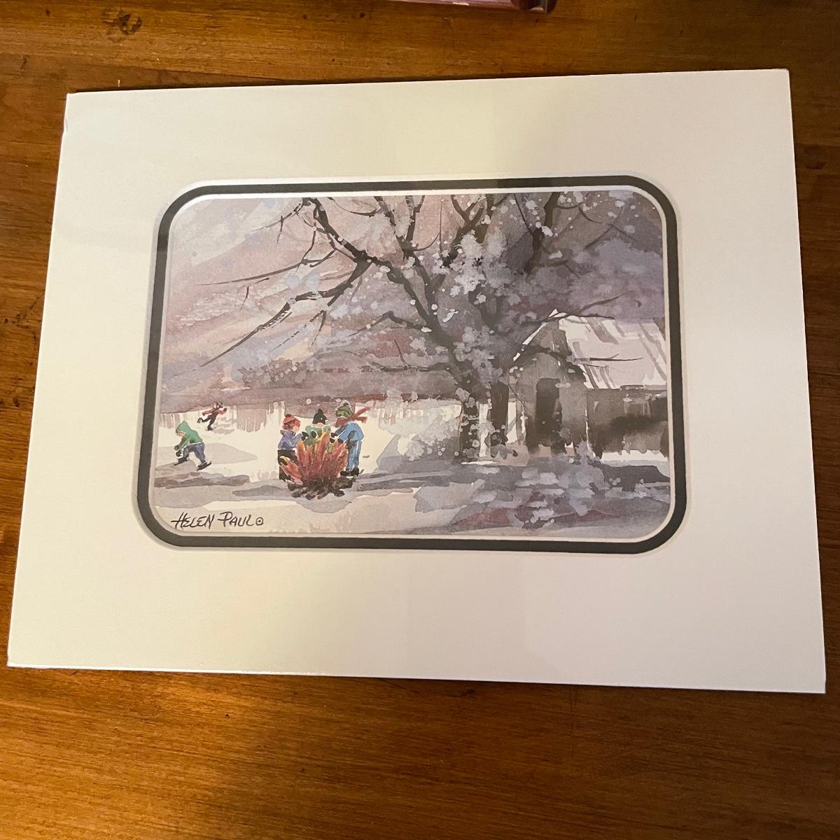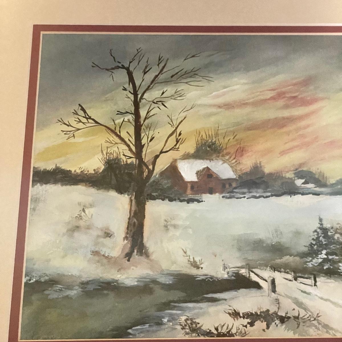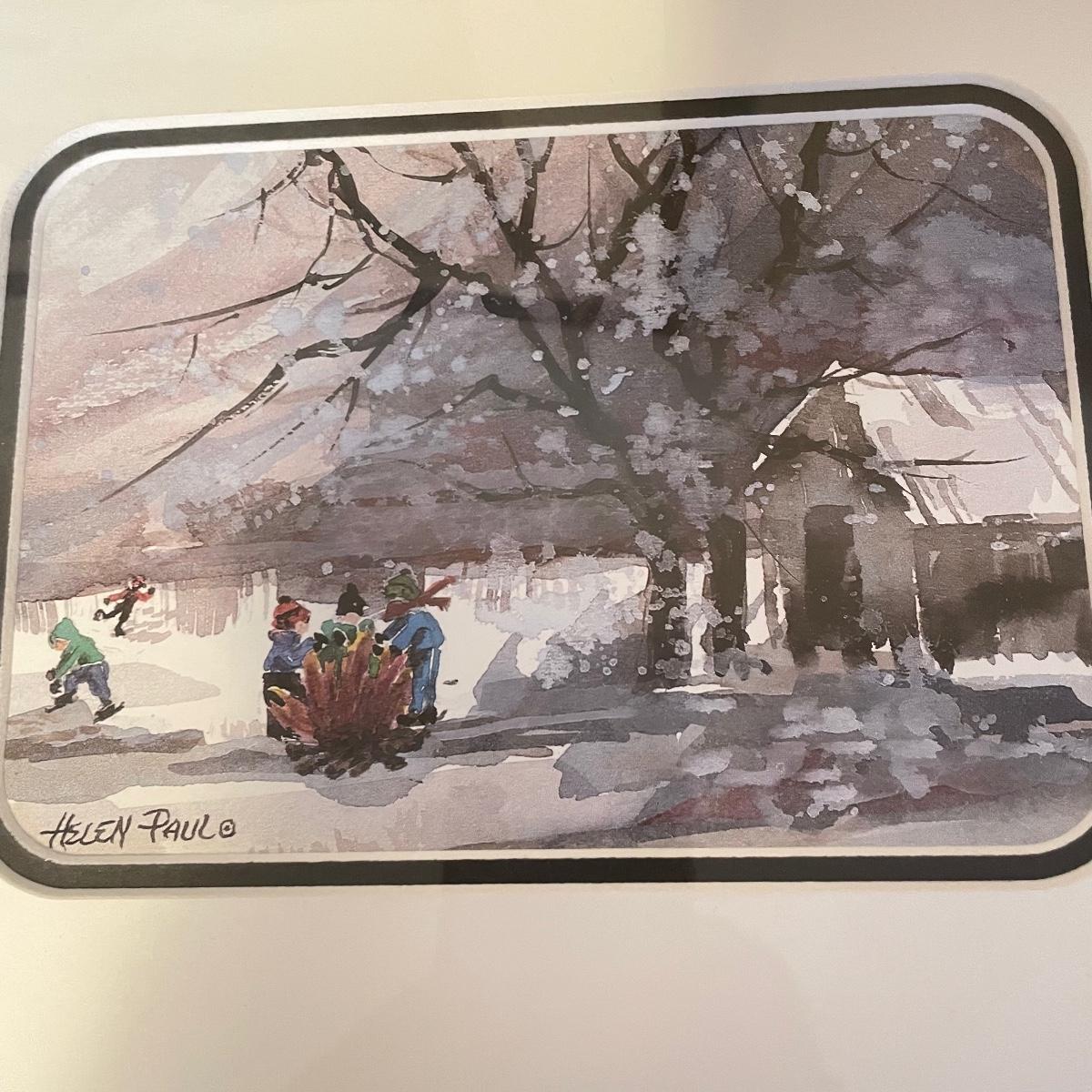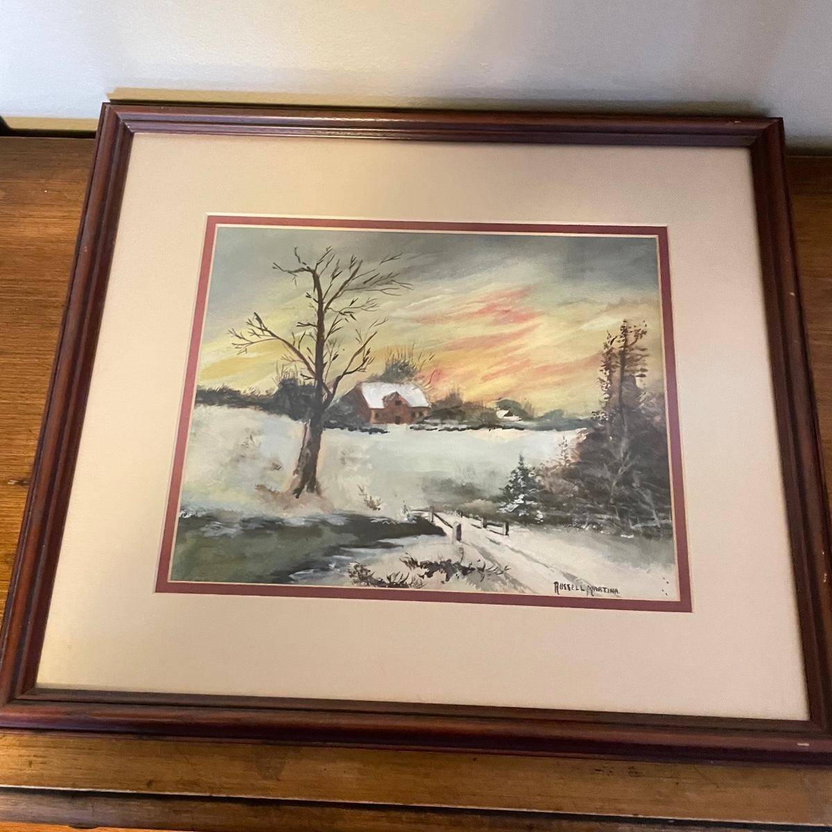 Two small watercolor prints signed Helen Paul (c). Each of the art is behind thick matting and wrapping in plastic. The larger framed piece is behind glass and signed Russell Martina. The wooden frame measures 16.75” x 14.75”. See images. Shipping available. Please call UPS with dimensions at 828-252-6930 for a shipping quote prior to bidding.