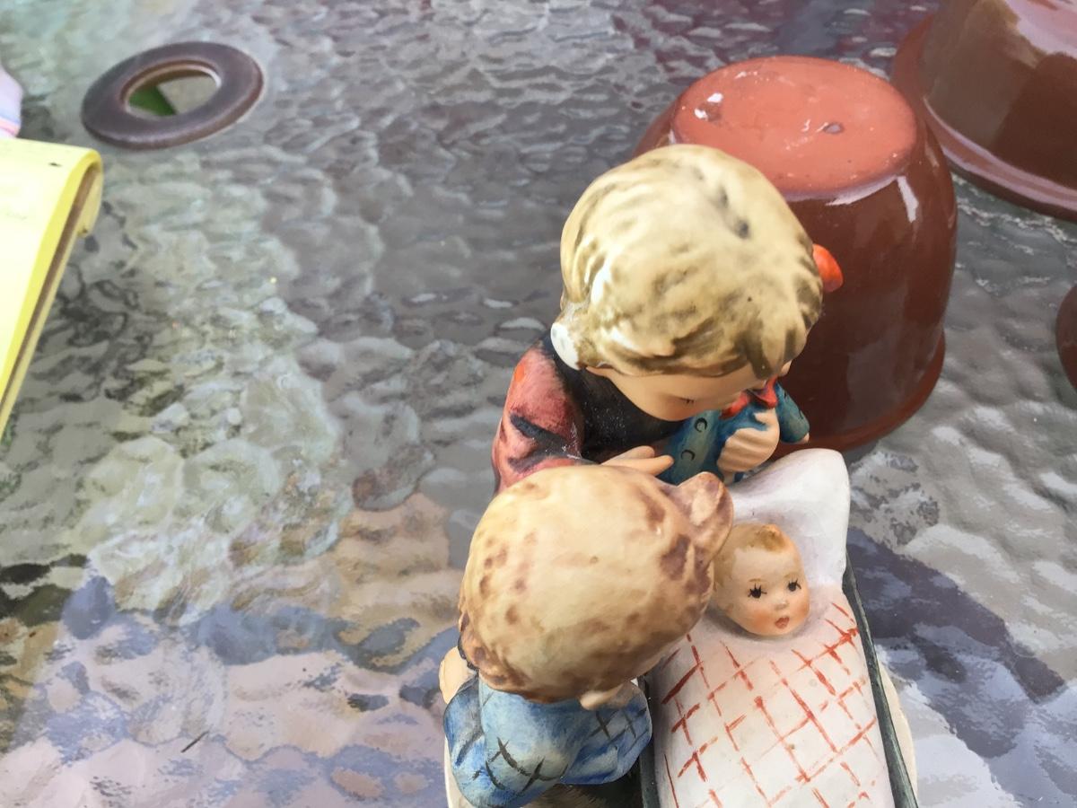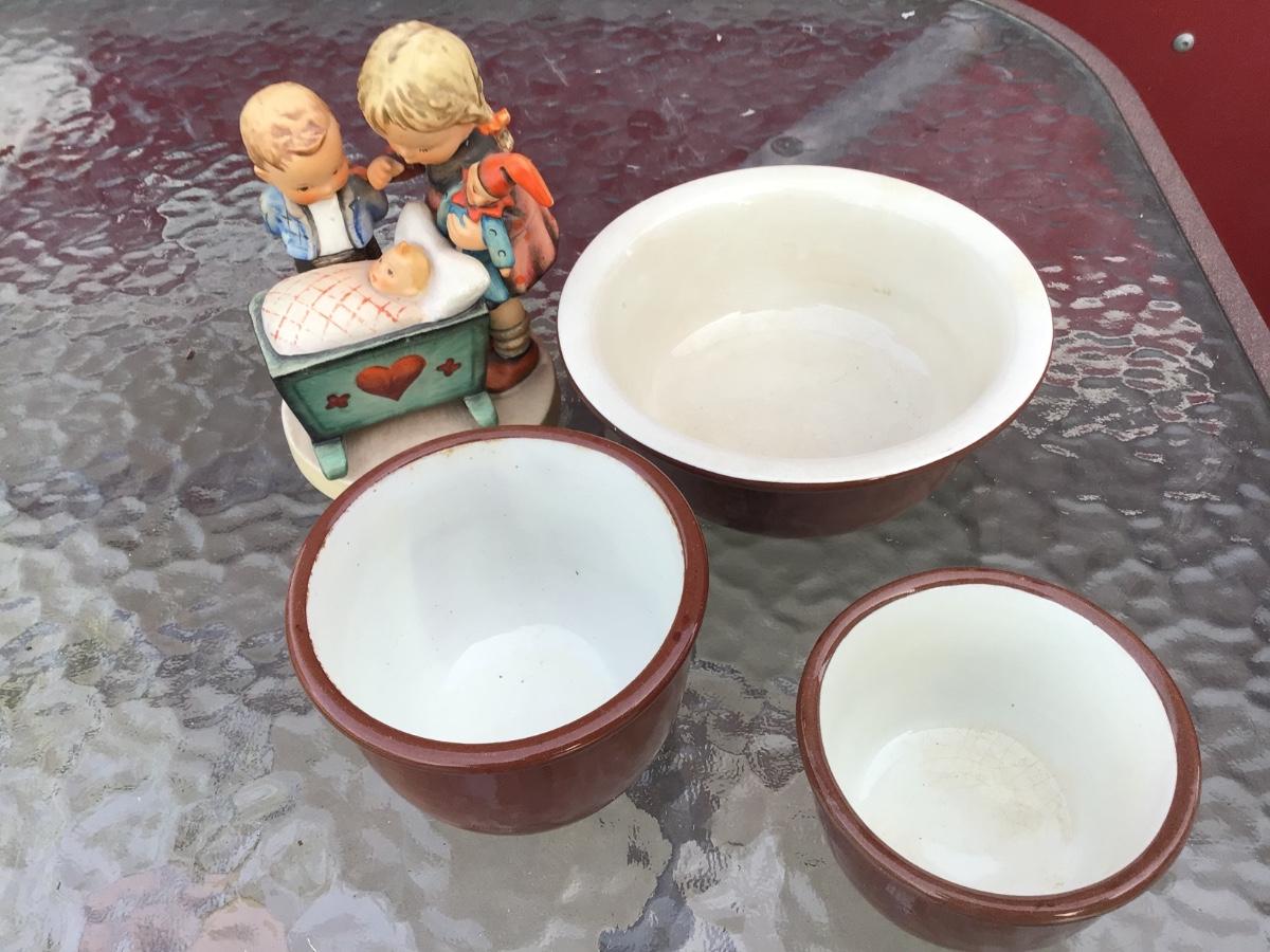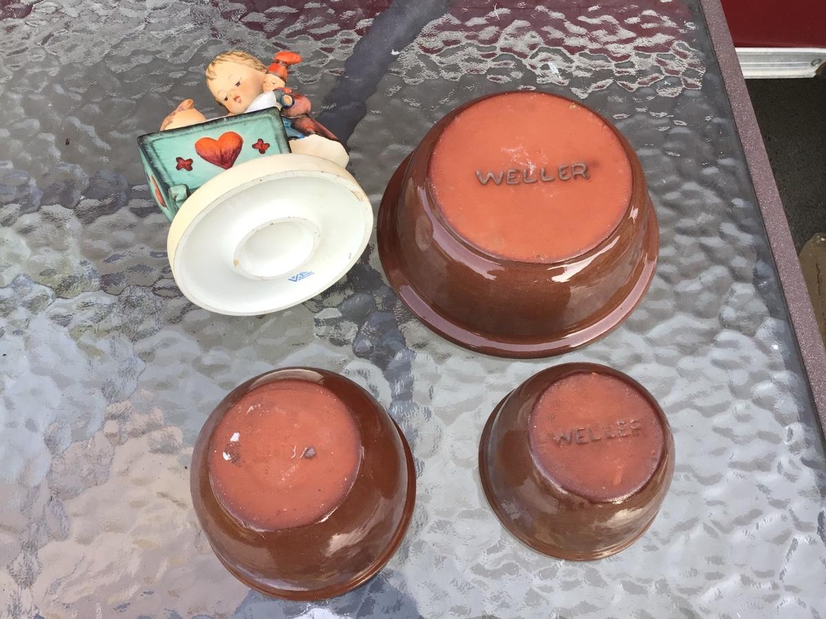 There are 2 weller dip bowls, and a medium size weller soup or cereal bowl. Also Goebel Boy Girl and baby figurine. One of the pig tails on the girl looks broken off. Not very noticeable.