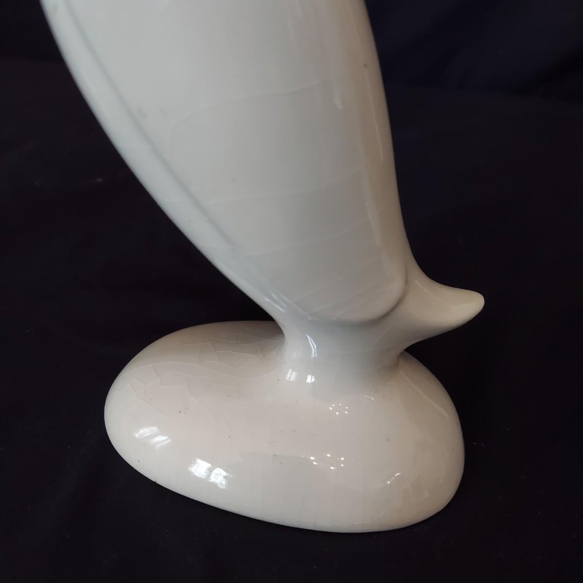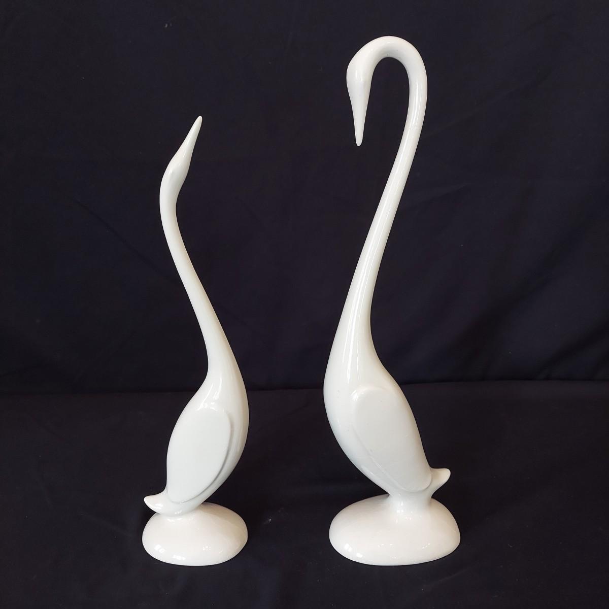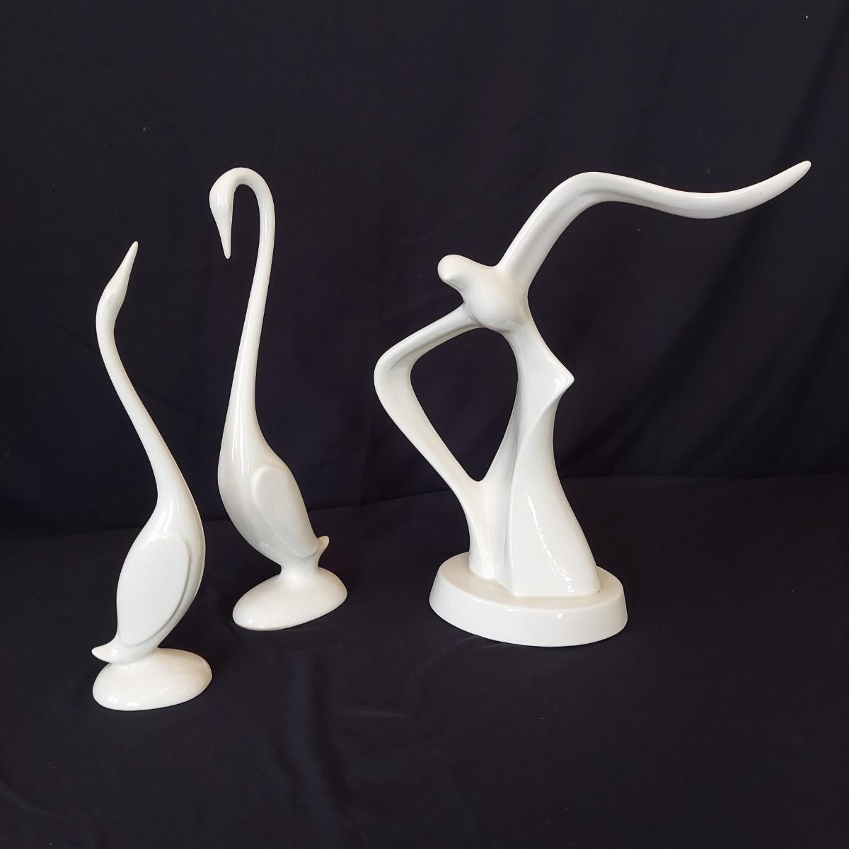 Three white glazed ceramic birds. They have some crazing. Please see photos. Small bird measures approximately 3.5" x 2.5" x 14"H. Medium bird measures approximately 3" x 4.5" x 16". Large bird measures approximately 15" x 5.5" x 16"H. Shipping available. Shipping can be costly. We suggest contacting our preferred local shipping provider, Postage Express, with dimensions and getting an estimate before bidding: (828) 670-5501or postageexpress@yahoo.com.